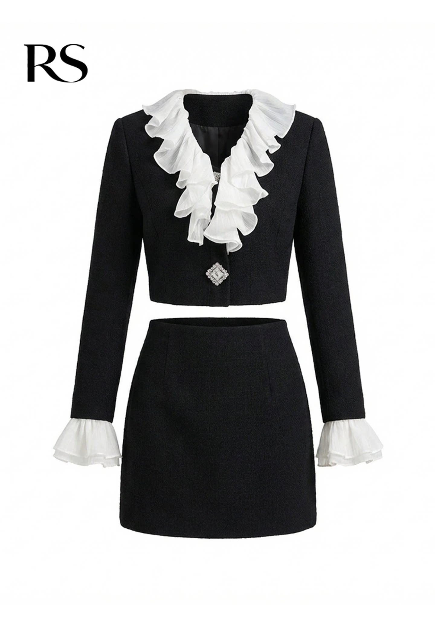 RUSUI is as elegant as a sister. It is a beautiful, light and luxurious black jacket and short skirt two-piece suit for important occasions.