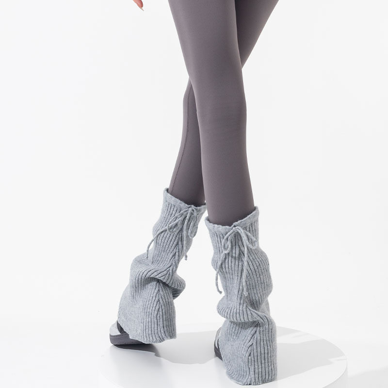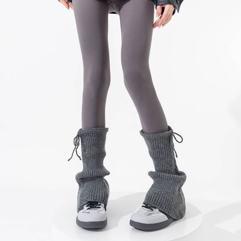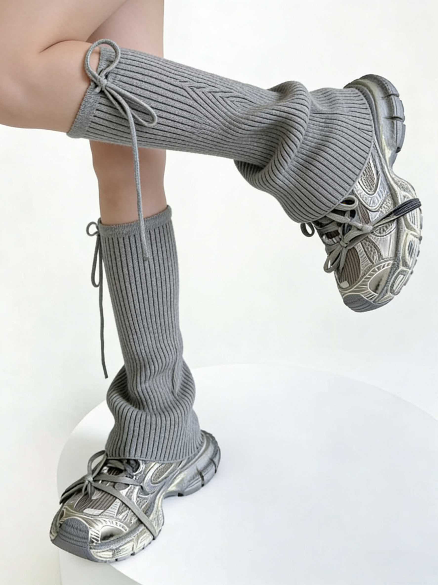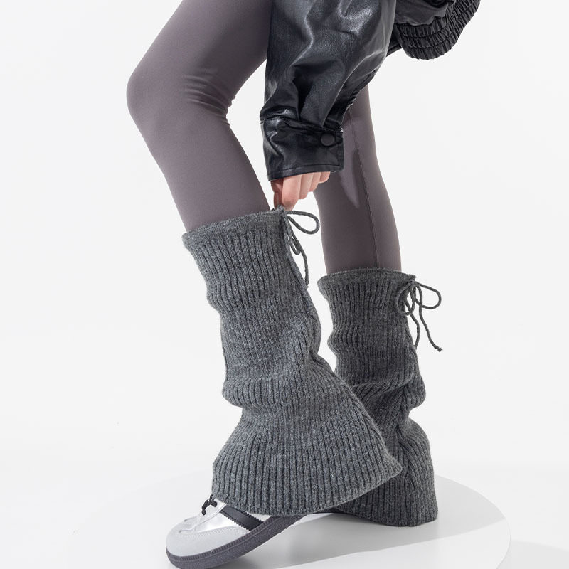 Autumn and Winter Solid Color Lace-Up Bow Micro-Flared Knit Stacked Socks Snow Boot Leg Warmers Layered Calf Socks Jk
