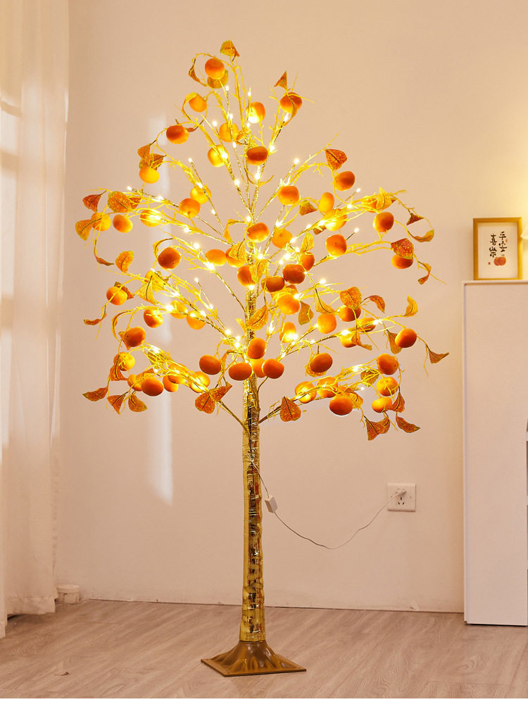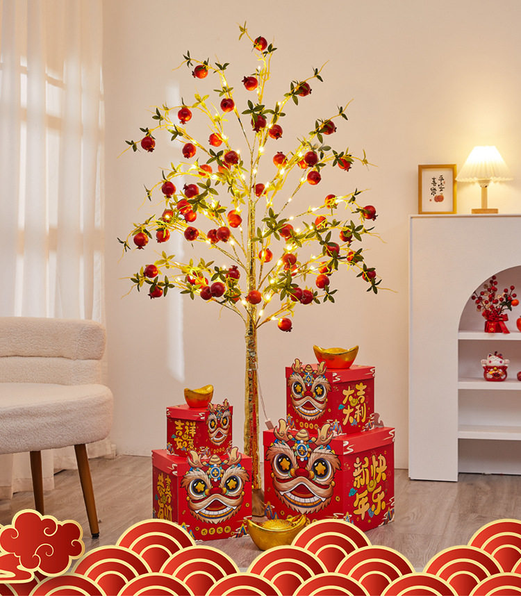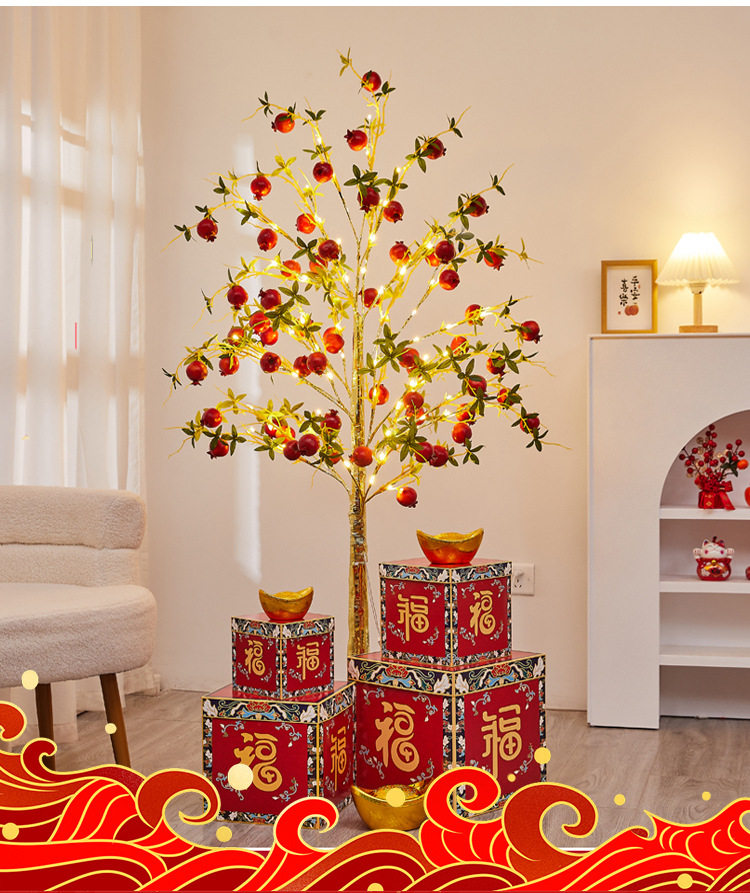 Led Light-Up Tree with Simulated Pomegranate Fruit for Year of the Horse, Suitable for Mall and Shop Window Decoration, Persimmon Decorative Tree Ornament