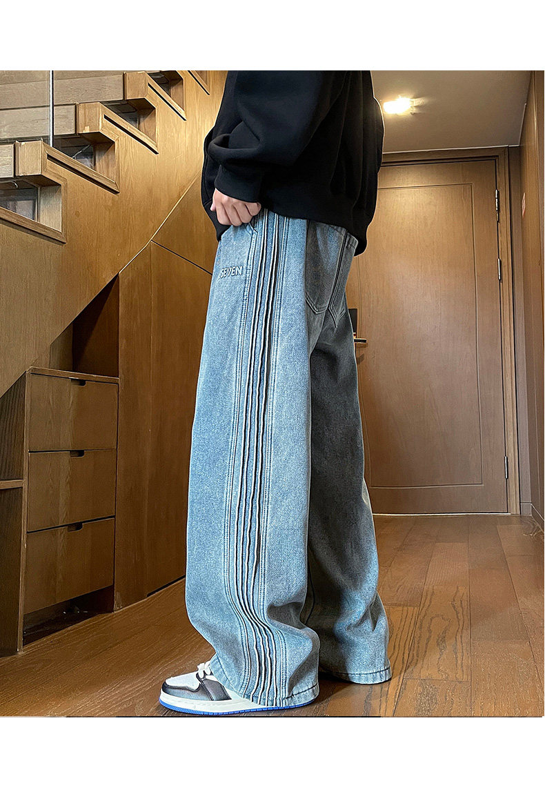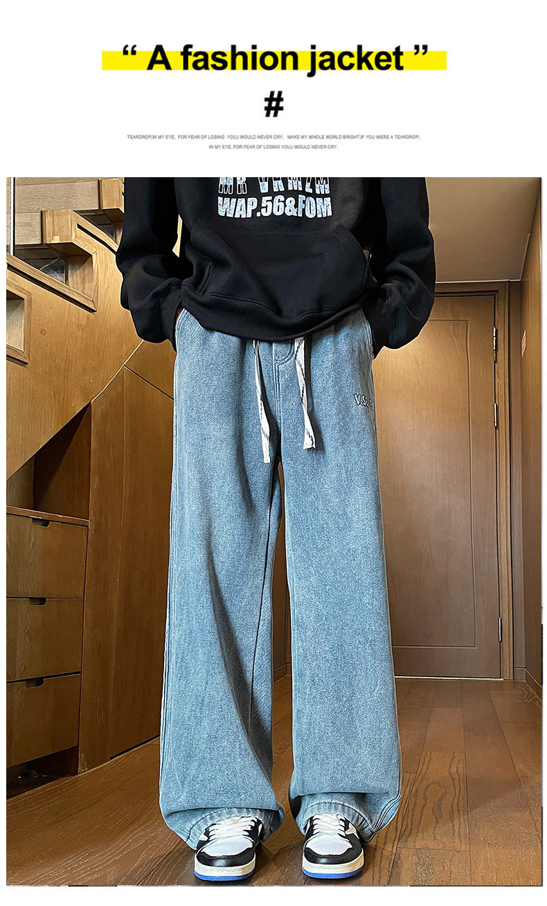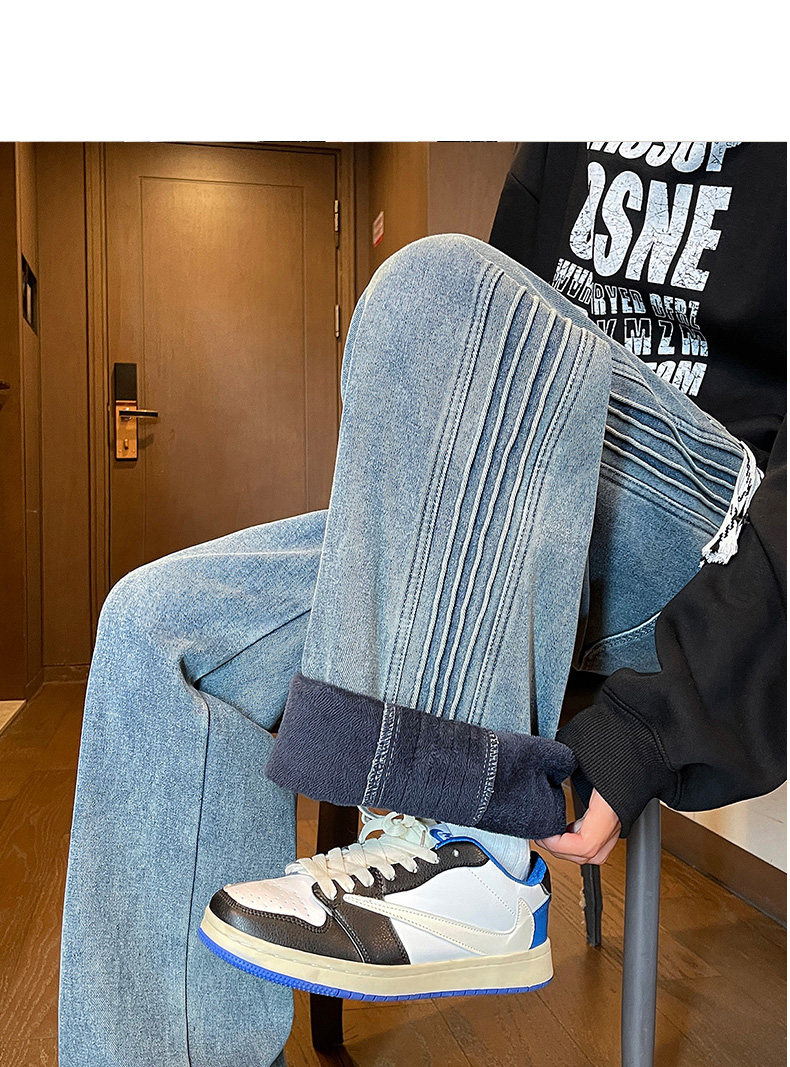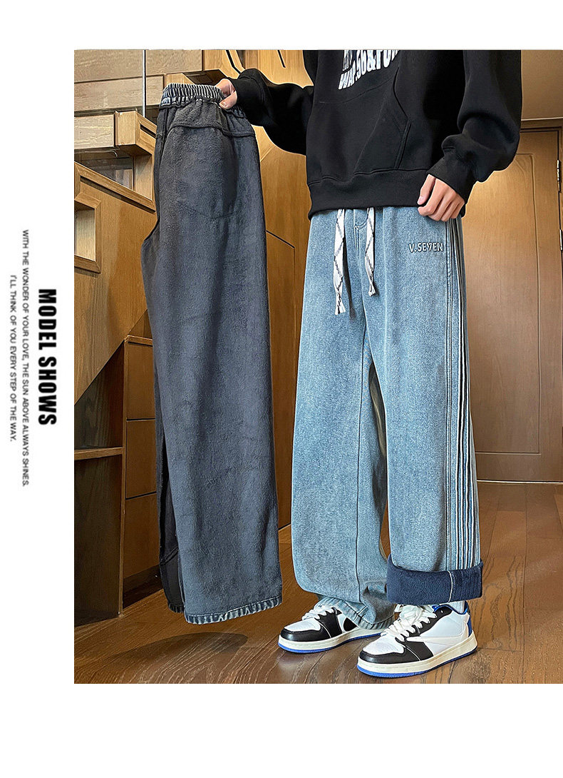 American-Style Fleece-Lined Thickened Jeans for Men, Autumn and Winter Vintage Curved Casual Pants, Loose Wide-Leg Pants for Teenagers