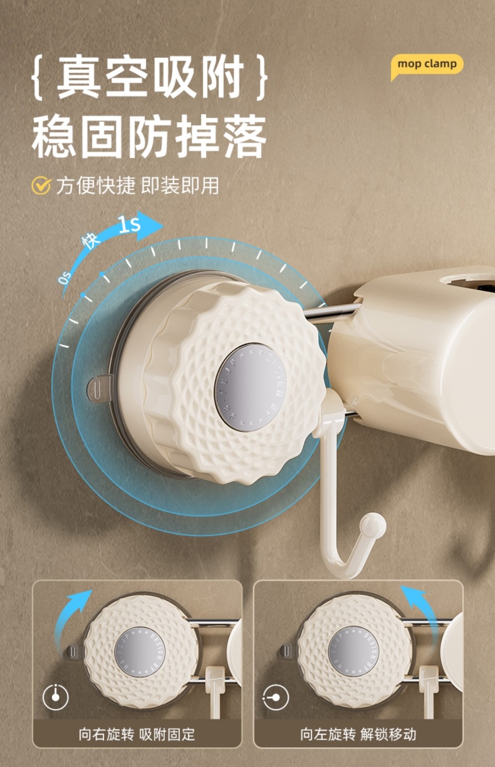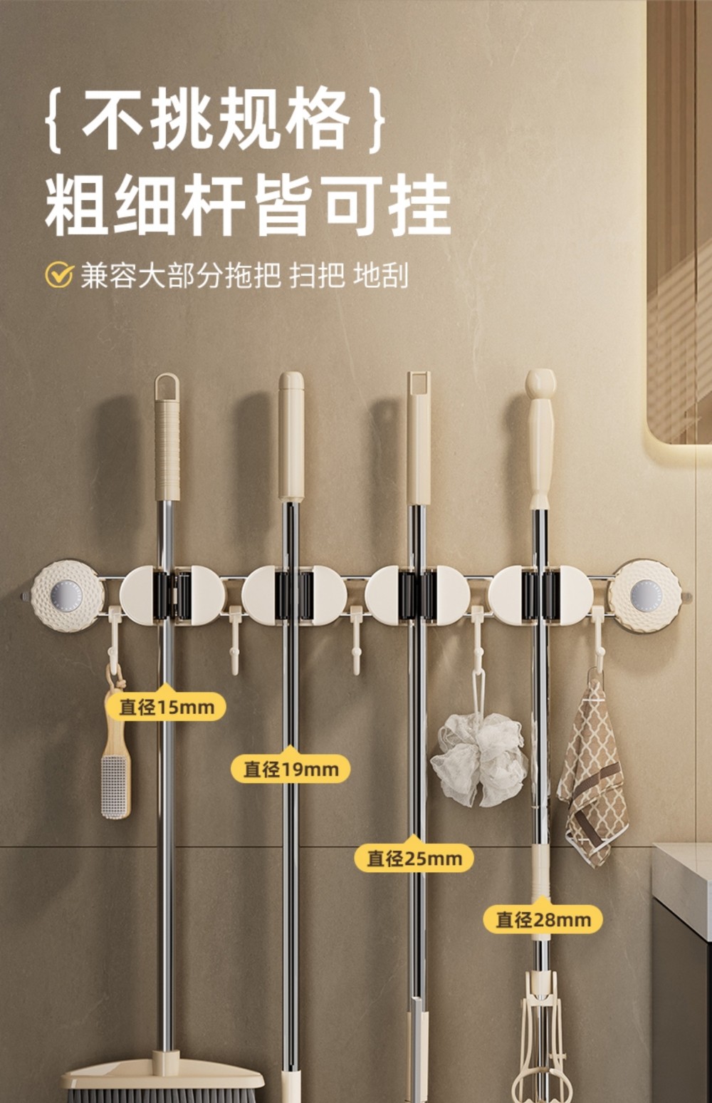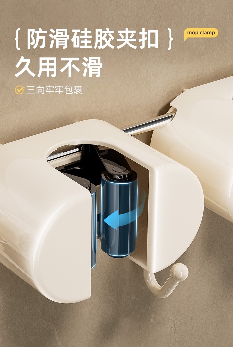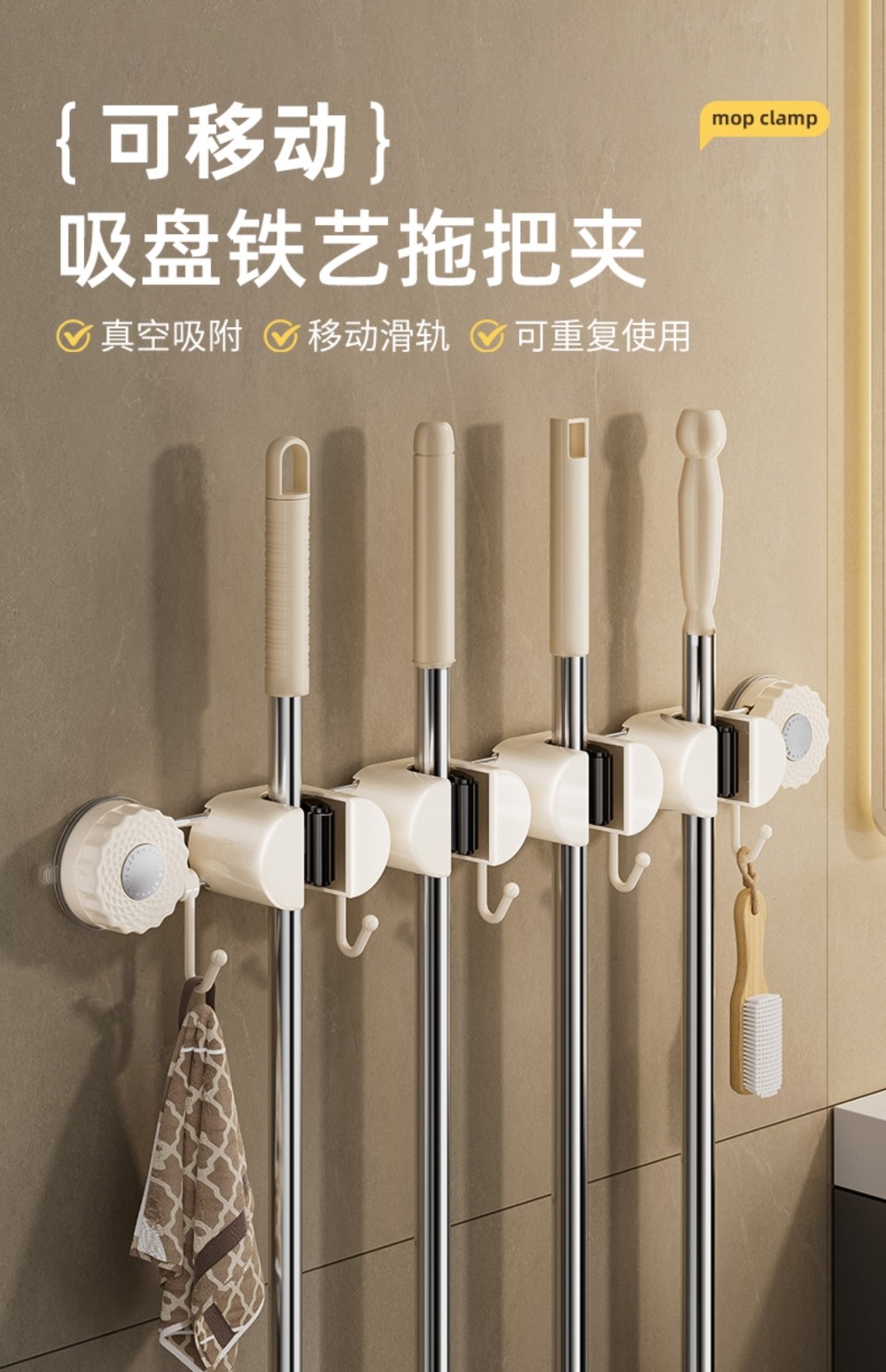 Japanese Imported Suction Cup Mop Holder, Wall-Mounted Mop Clip, Multifunctional Sliding Broom Hook, Bathroom Storage Rack