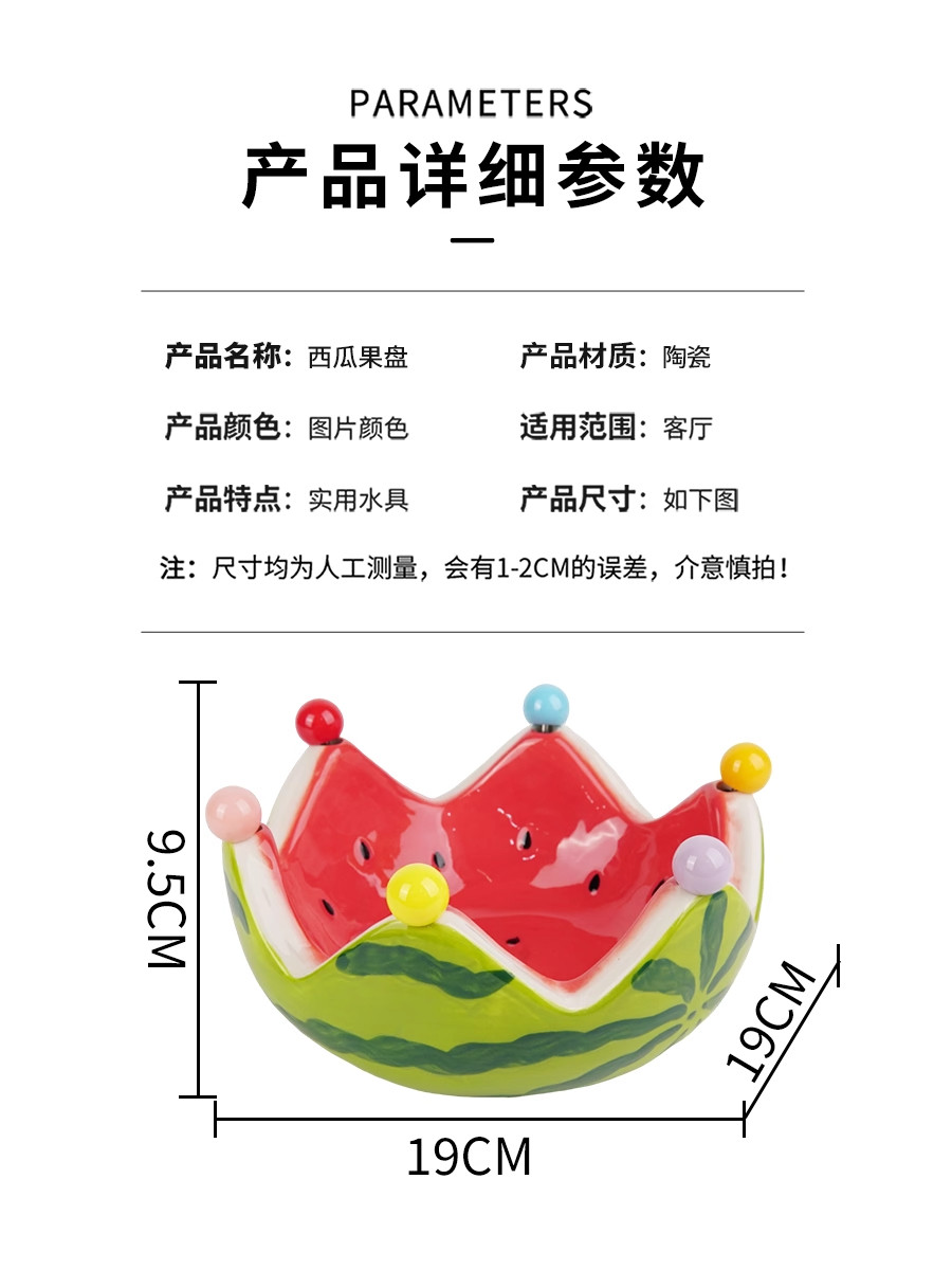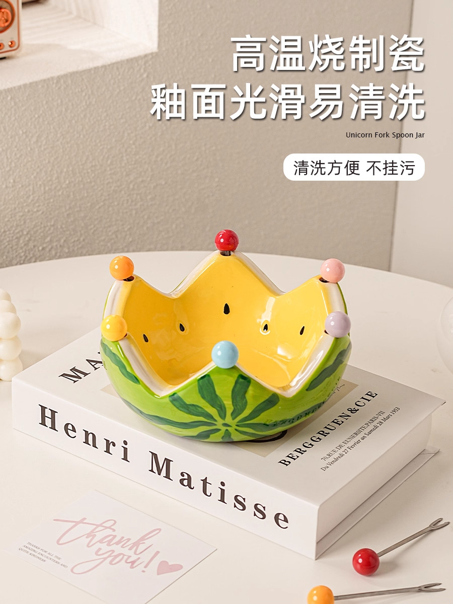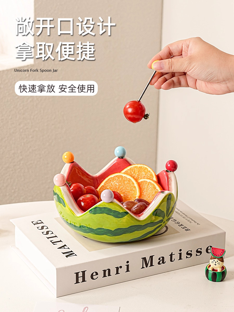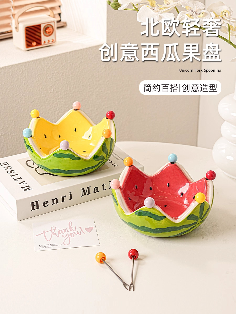 Ceramic creative watermelon fruit plate with fork for home living room fruit salad bowl cute stainless steel fork set