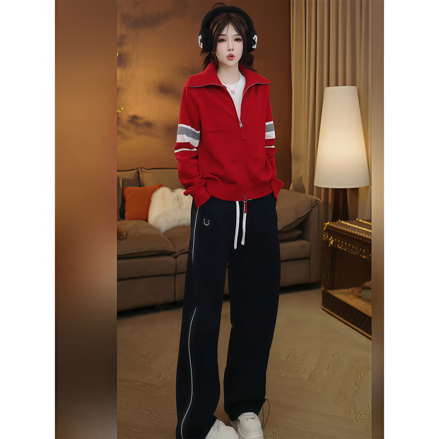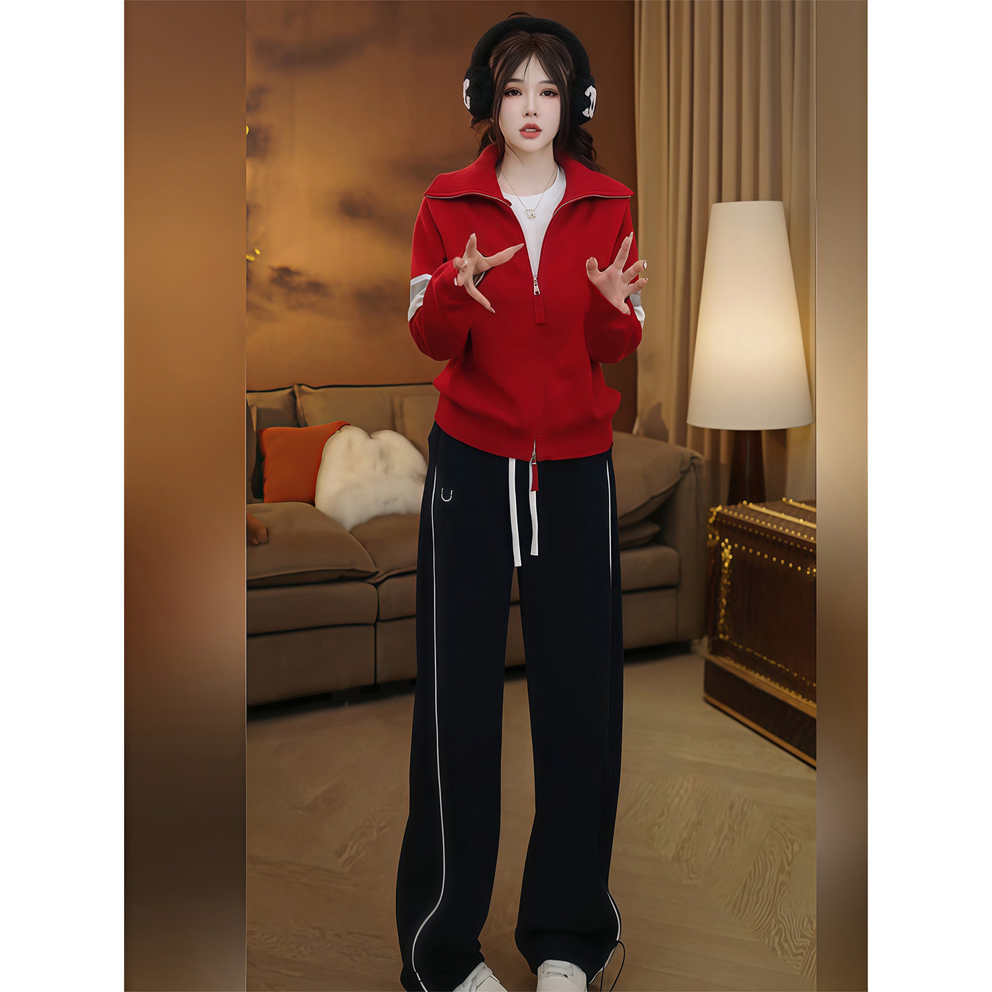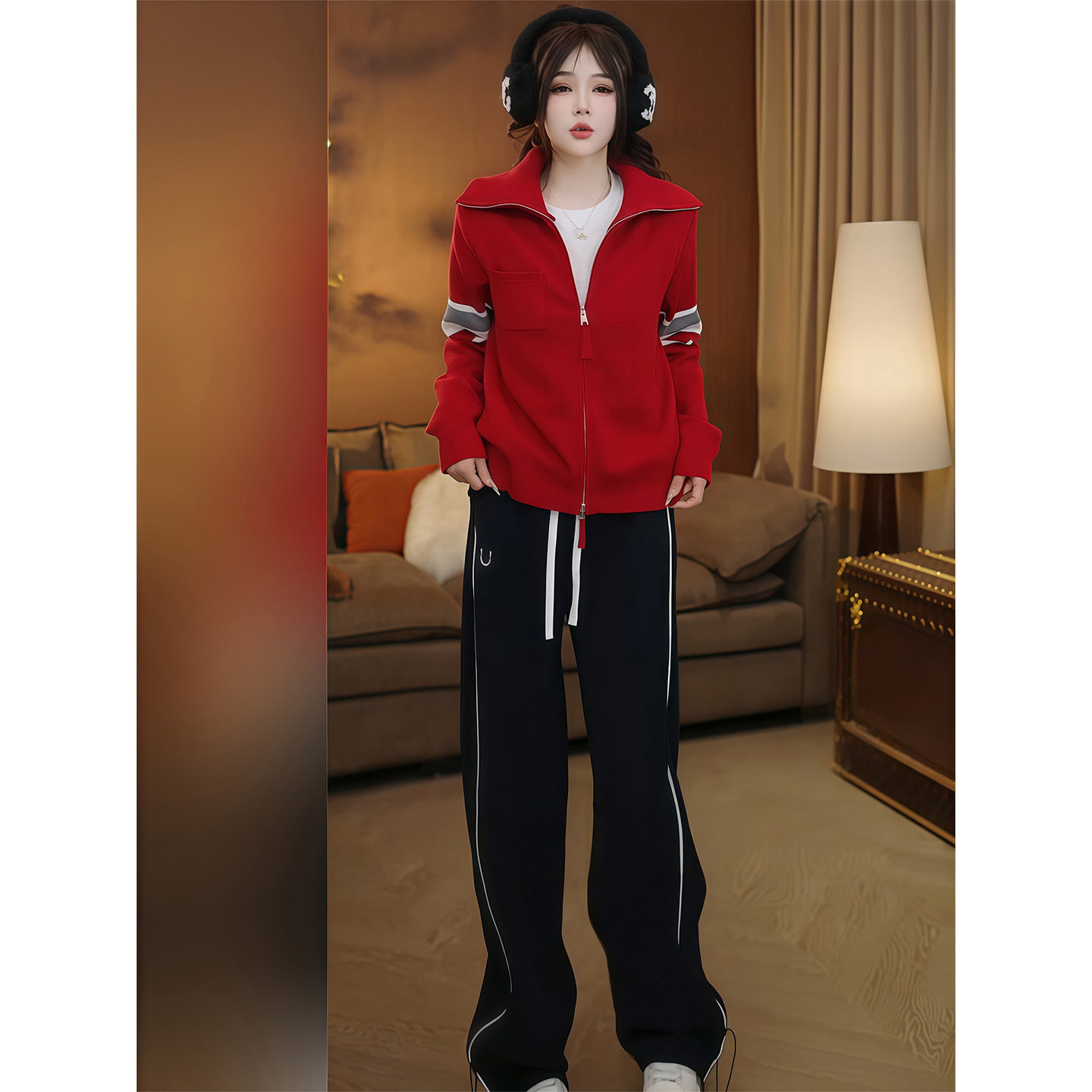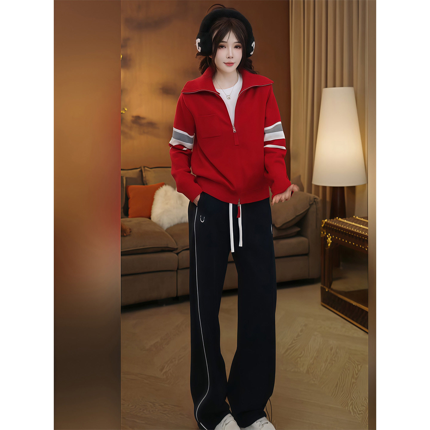 Fashionable casual suit for women winter 2025 new contrasting color thickened long-sleeved knitted cardigan jacket straight wide-leg pants