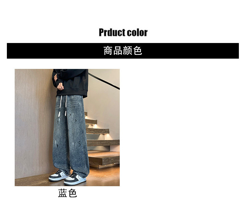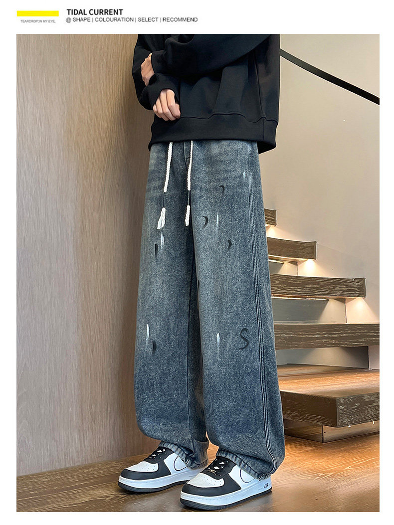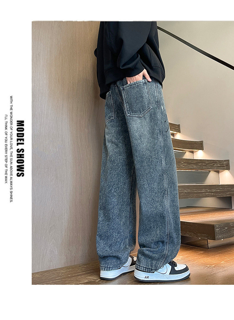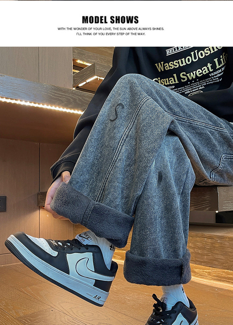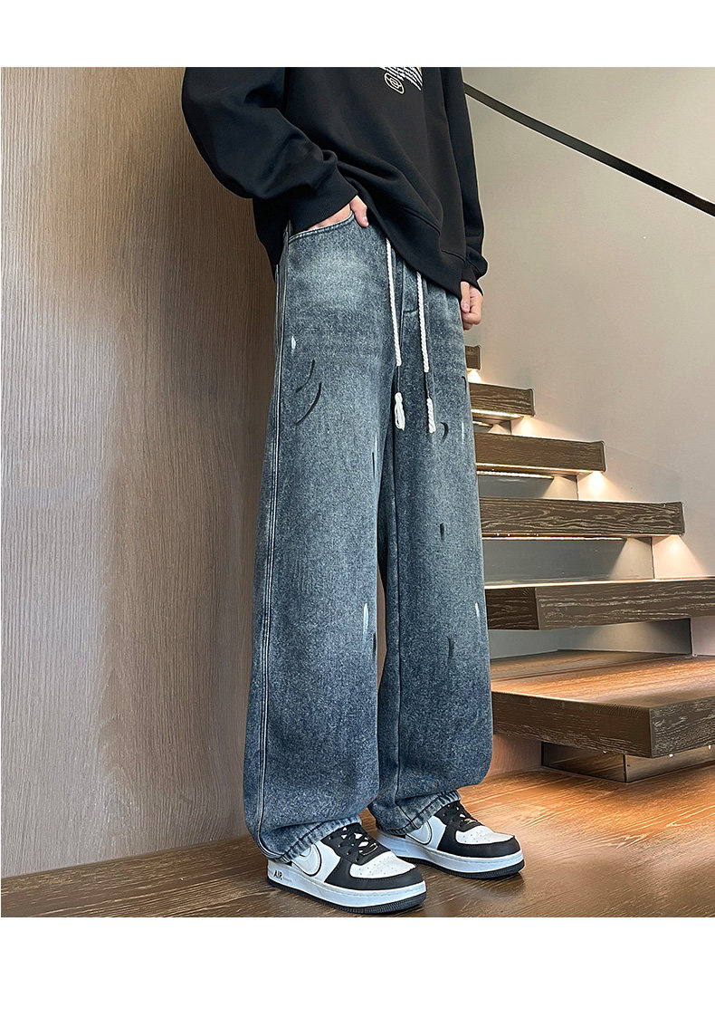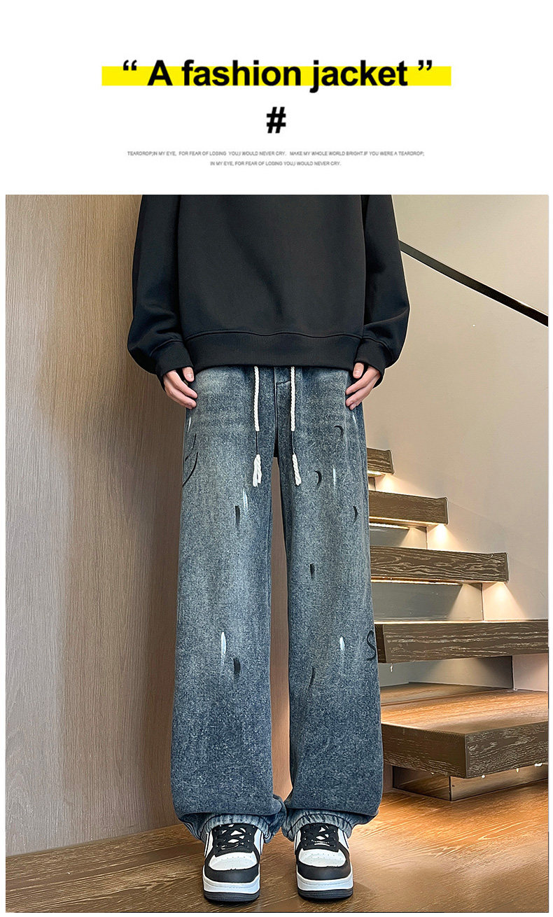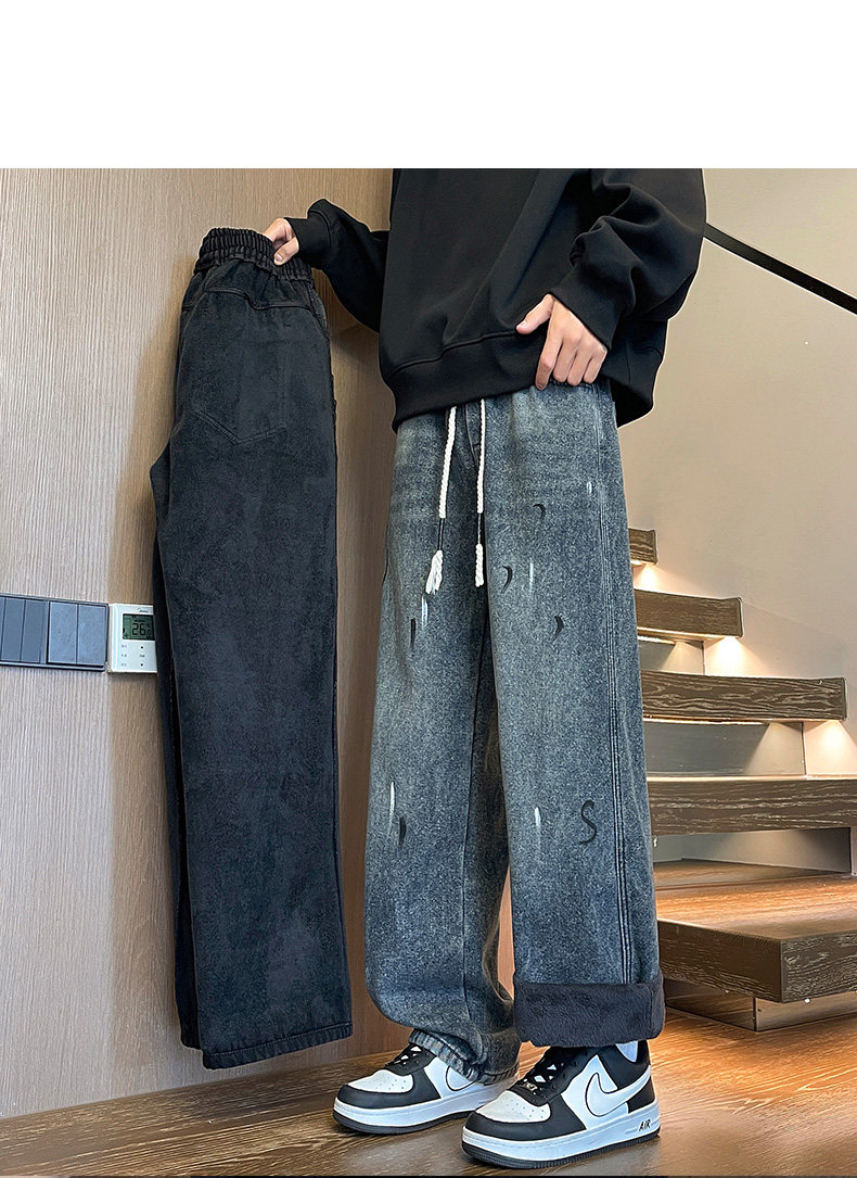 Fleece-Lined Thickened Men's Jeans for Winter, Straight-Leg Casual Long Pants, Drawstring Washed Wide-Leg Pants for Middle School Students, Loose Fit