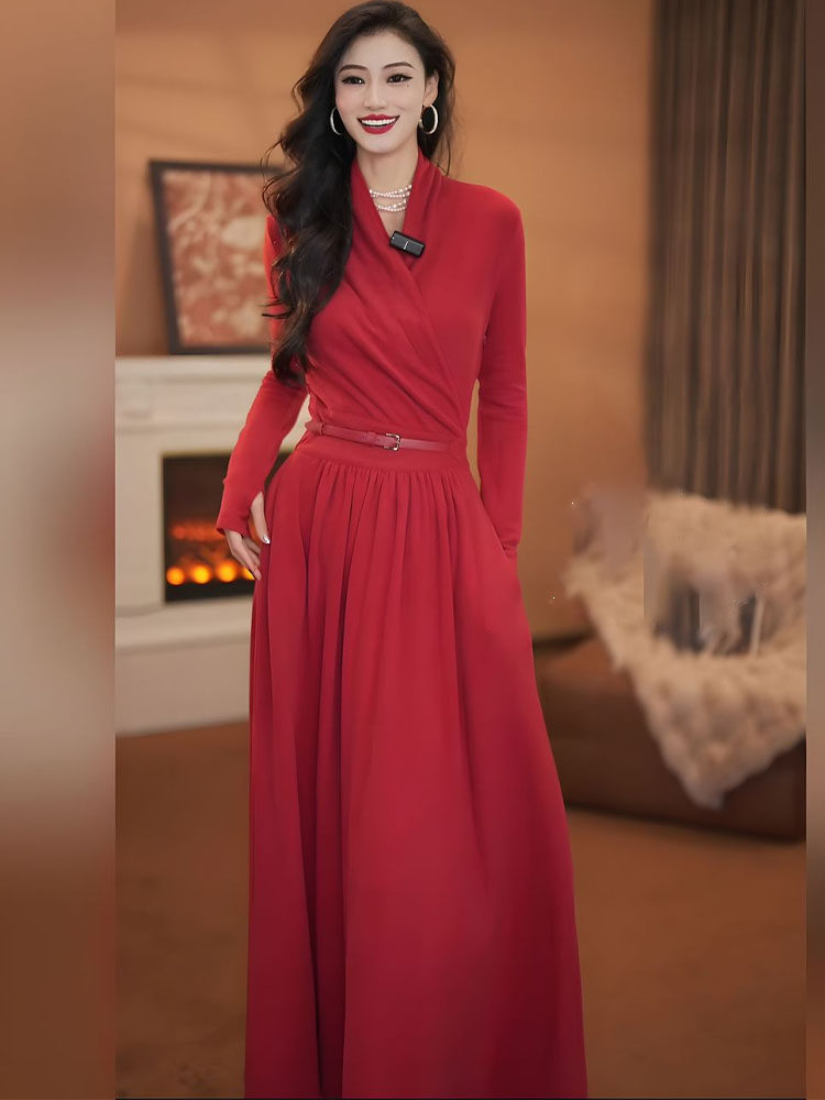 Mijie ladylike style V-neck red dress women's long-sleeved waist slimming slim high-end new long dress with a sense of atmosphere