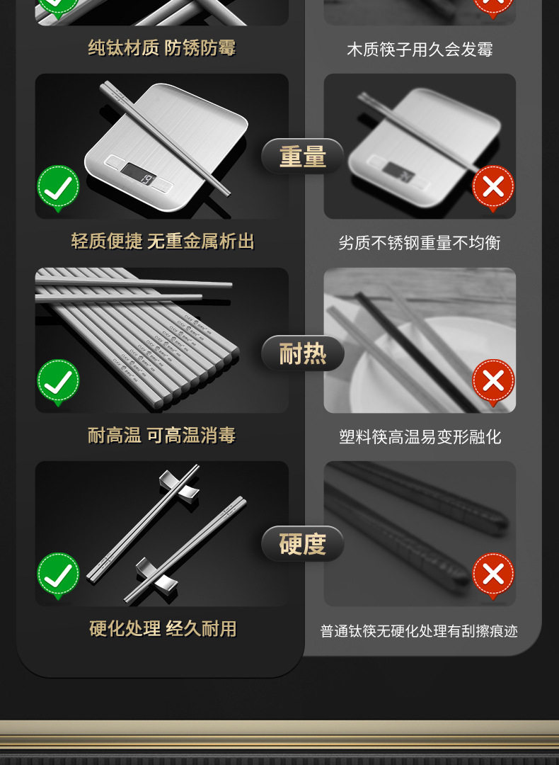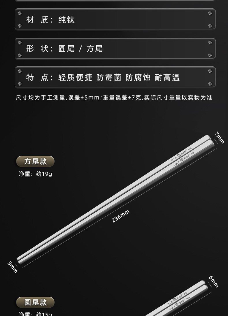 Color Classification 【Round Tail Style - 15G】Antibacterial, Anti-Scald, Ultra-Lightweight Pure Titanium Chopsticks, 1 Pair (Includes Chopstick Bag),[Square Tail Style-19G] Antibacterial, Anti-Scalding, Ultra-Light Pure Titanium Chopsticks, 1 Pair (Comes with Storage Box),[Round Tail Style-15G] Antibacterial, Anti-Scalding, Ultra-Light Pure Titanium Chopsticks, 5 Pairs,[Square Tail Style-19G] Antibacterial, Anti-Scalding, Ultra-Light Pure Titanium Chopsticks, 5 Pairs,[Round Tail Style-15G] Antibacterial, Anti-Scalding, Ultra-Light Pure Titanium Chopsticks, 10 Pairs,[Square Tail Style-19G] Antibacterial, Anti-Scalding, Ultra-Light Pure Titanium Chopsticks, 10 Pairs,[Antibacterial and High Temperature Resistant] Pure Titanium Chopsticks and Spoons Set (Comes with Storage Box)