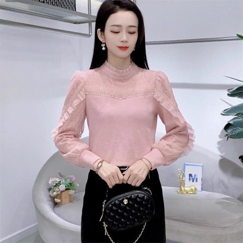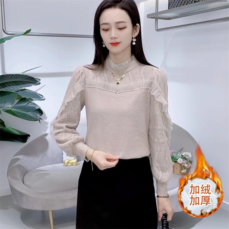 Jasmine Haute Couture Lace Bottoming Shirt 2025 New Khaki French Thickened Velvet Half Turtle Collar Women's Autumn and Winter Top