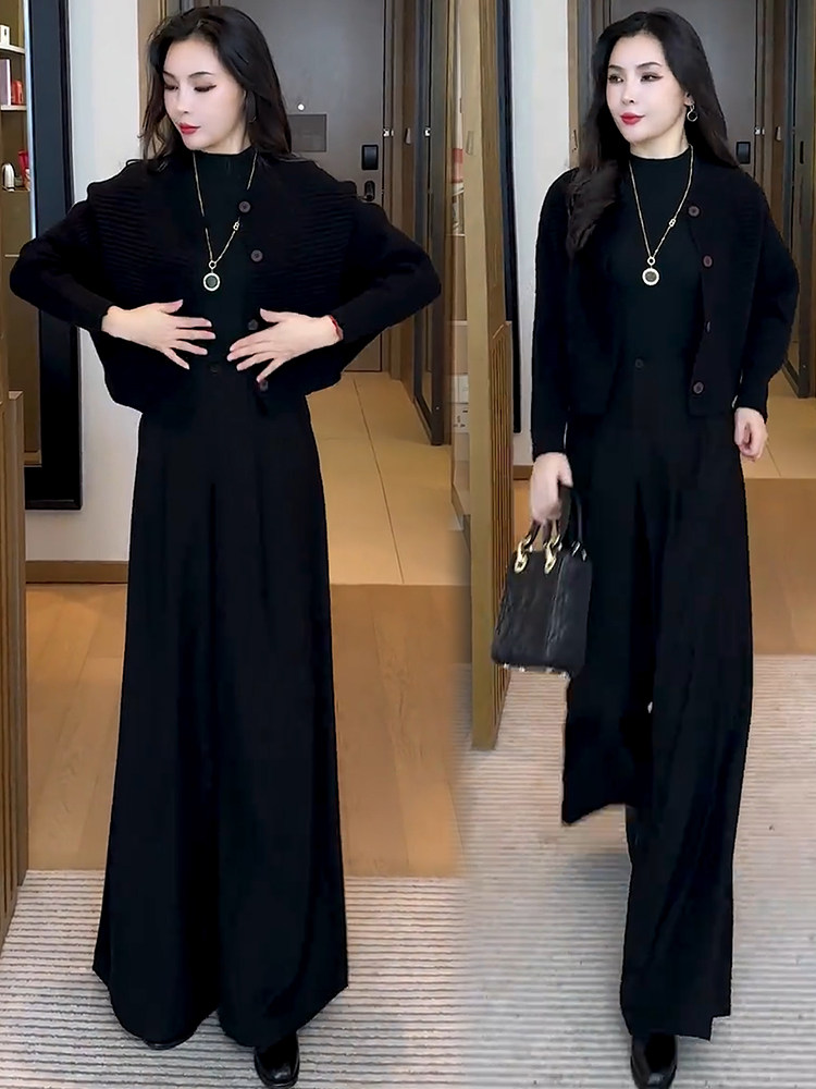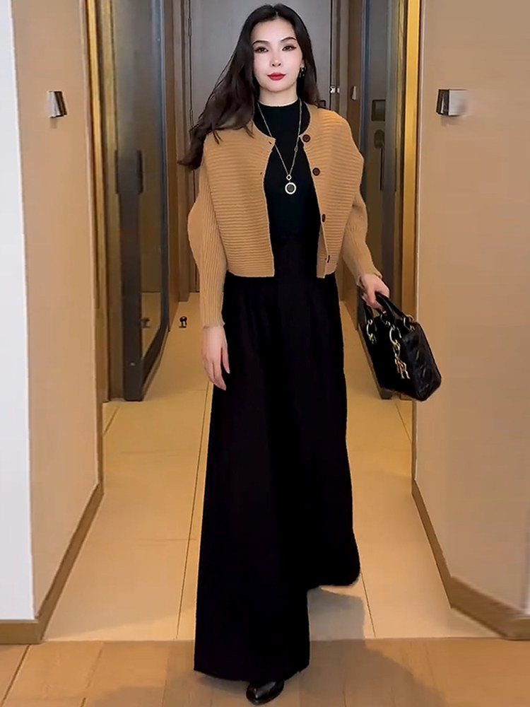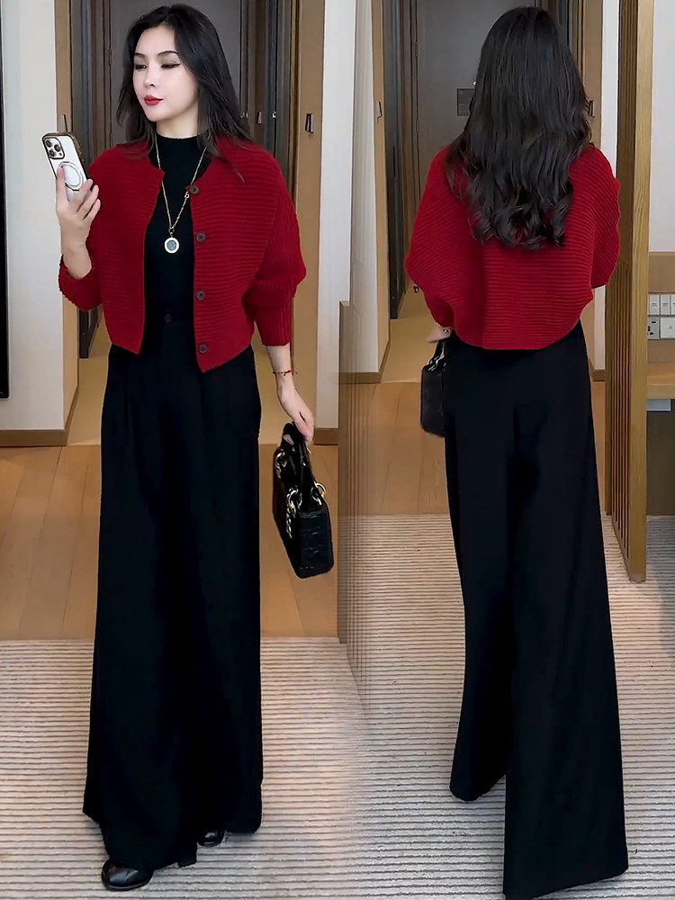 2026 New Fashion Slim-Fit Knit Cardigan Short Jacket and Wide-Leg Pants Two-Piece Set with an Elegant Style