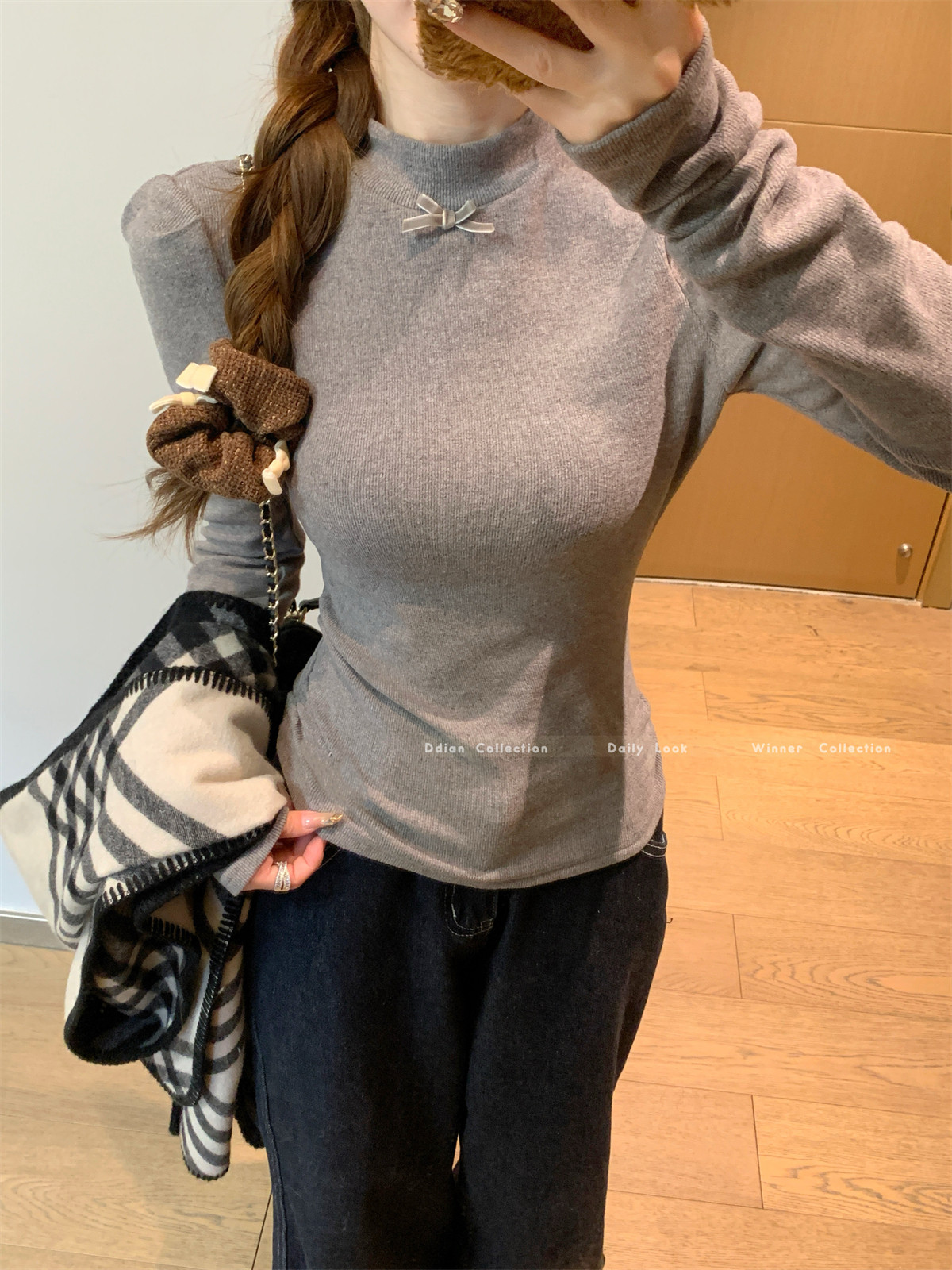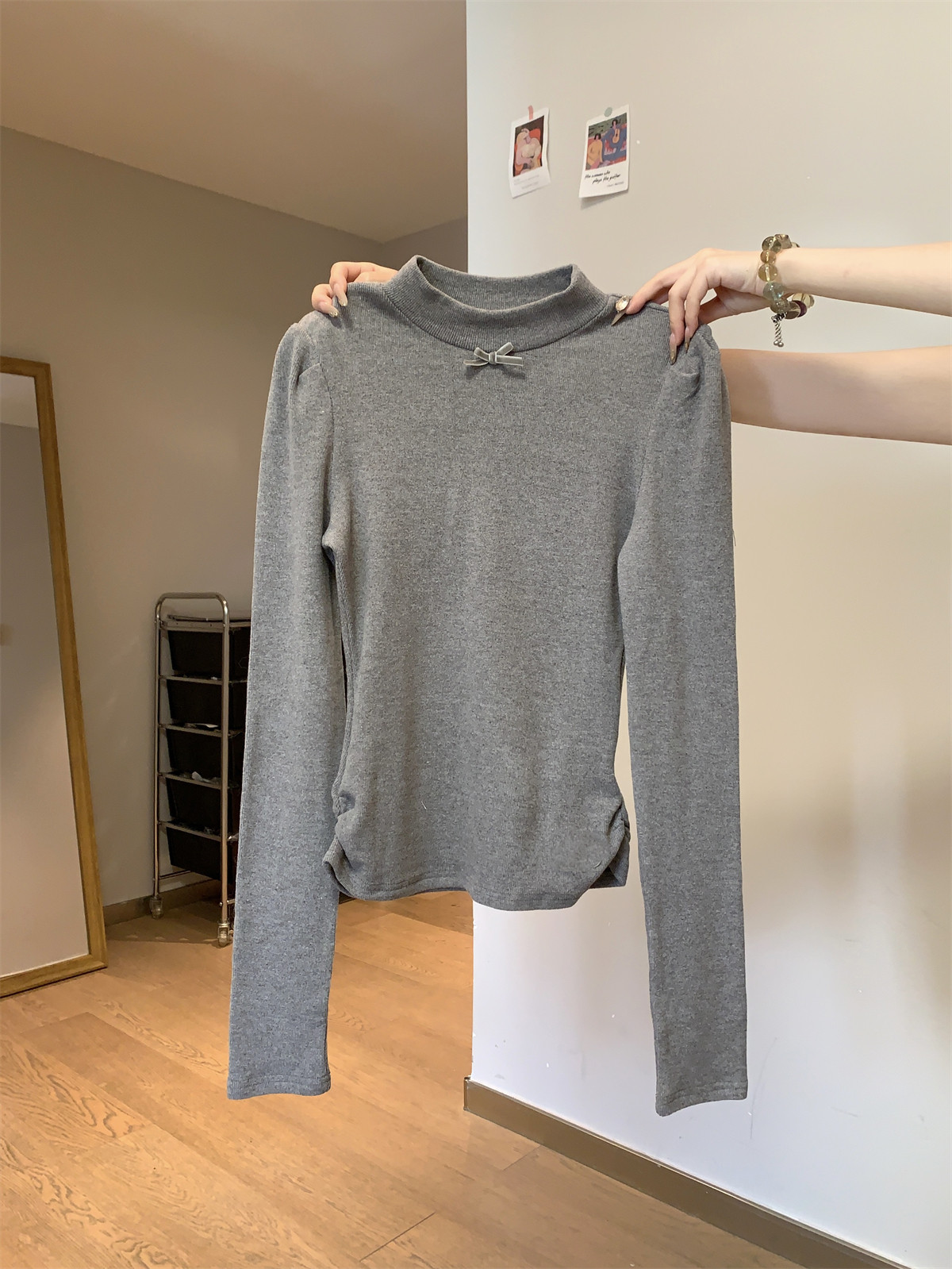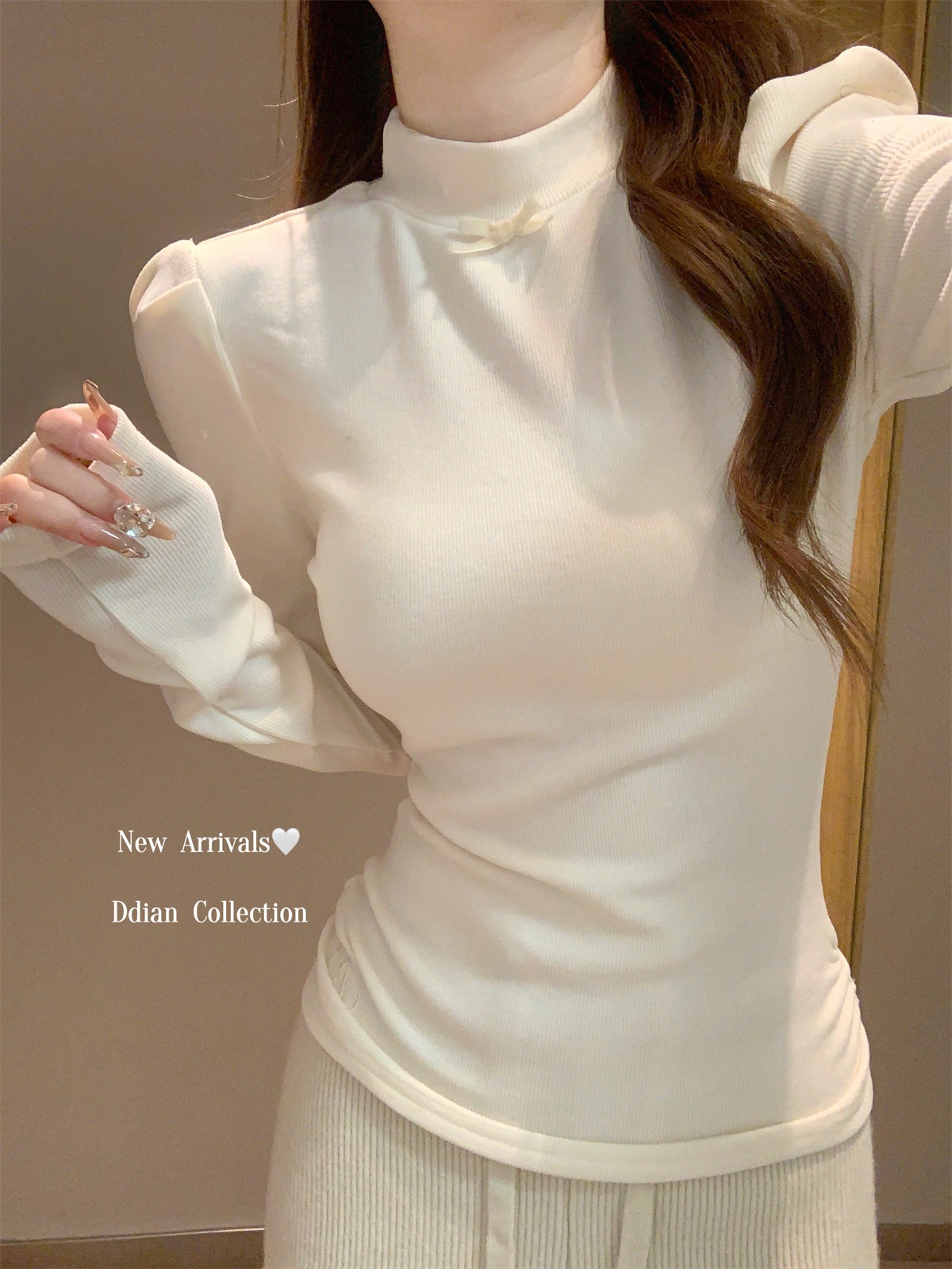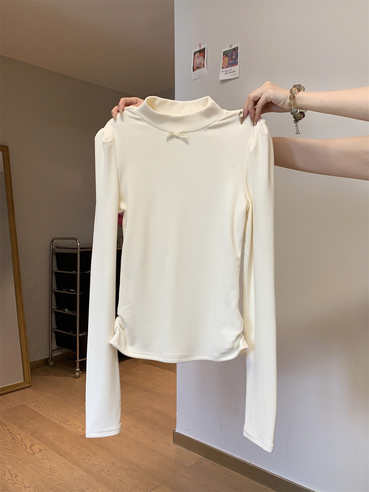 Korean Style Gentle Half-High Collar Puff Sleeve T-Shirt for Women, Autumn and Winter Brushed Fleece with Pleated Design Long-Sleeve Top ins