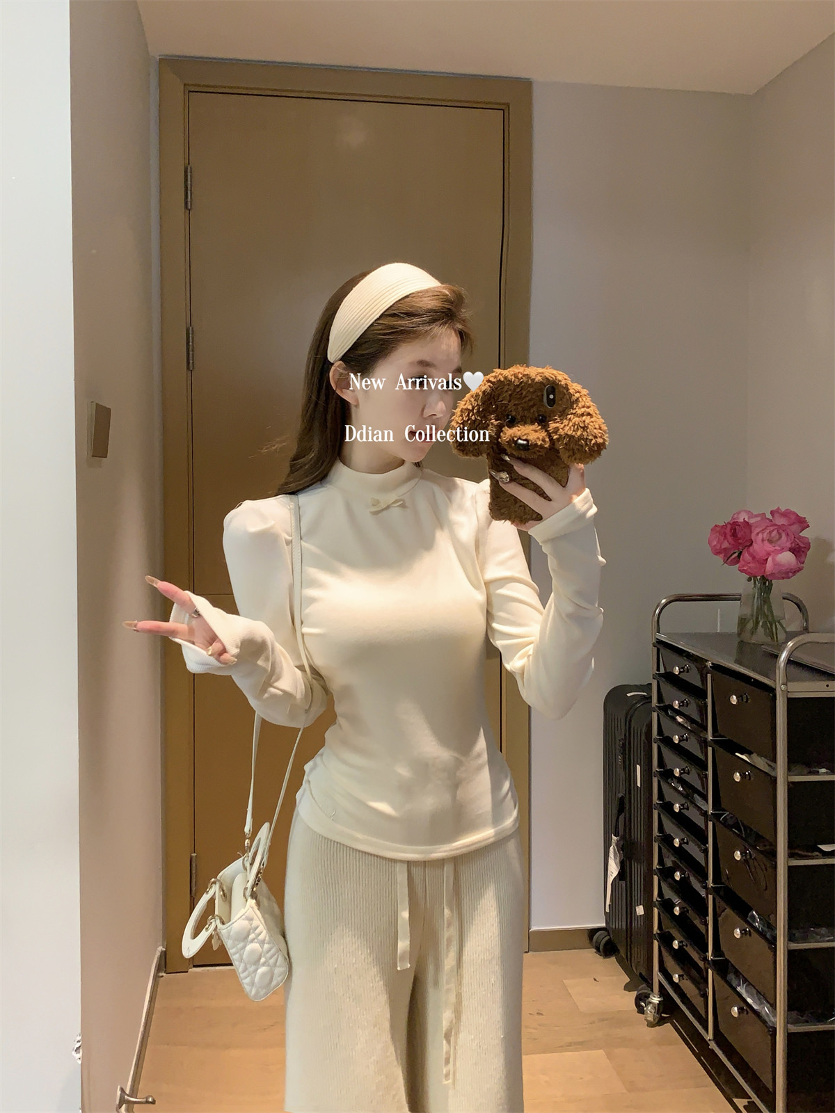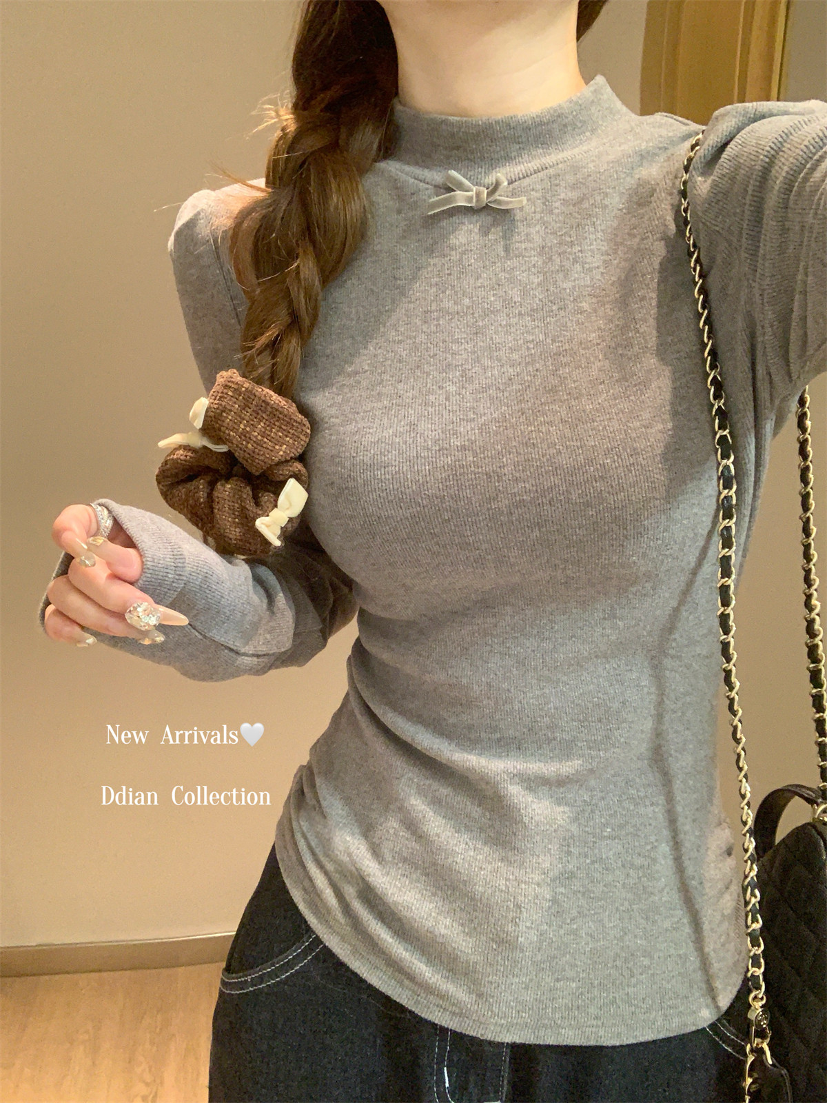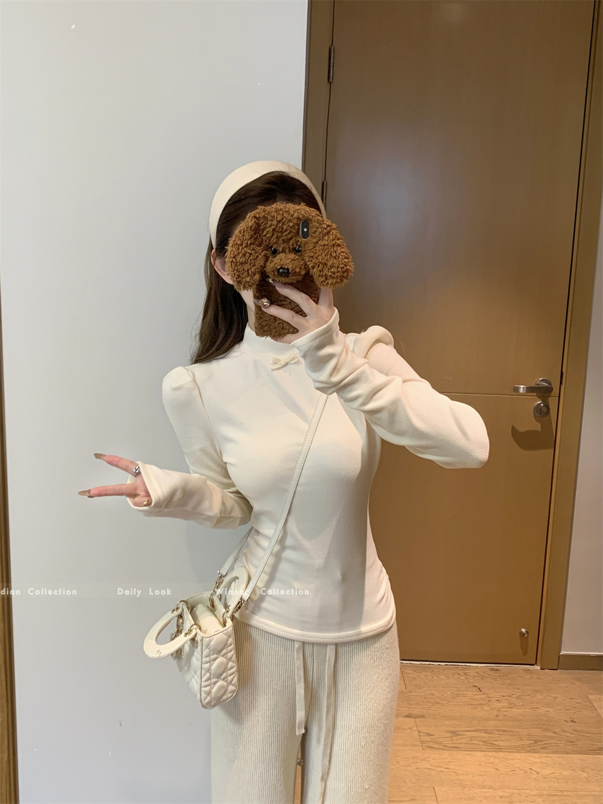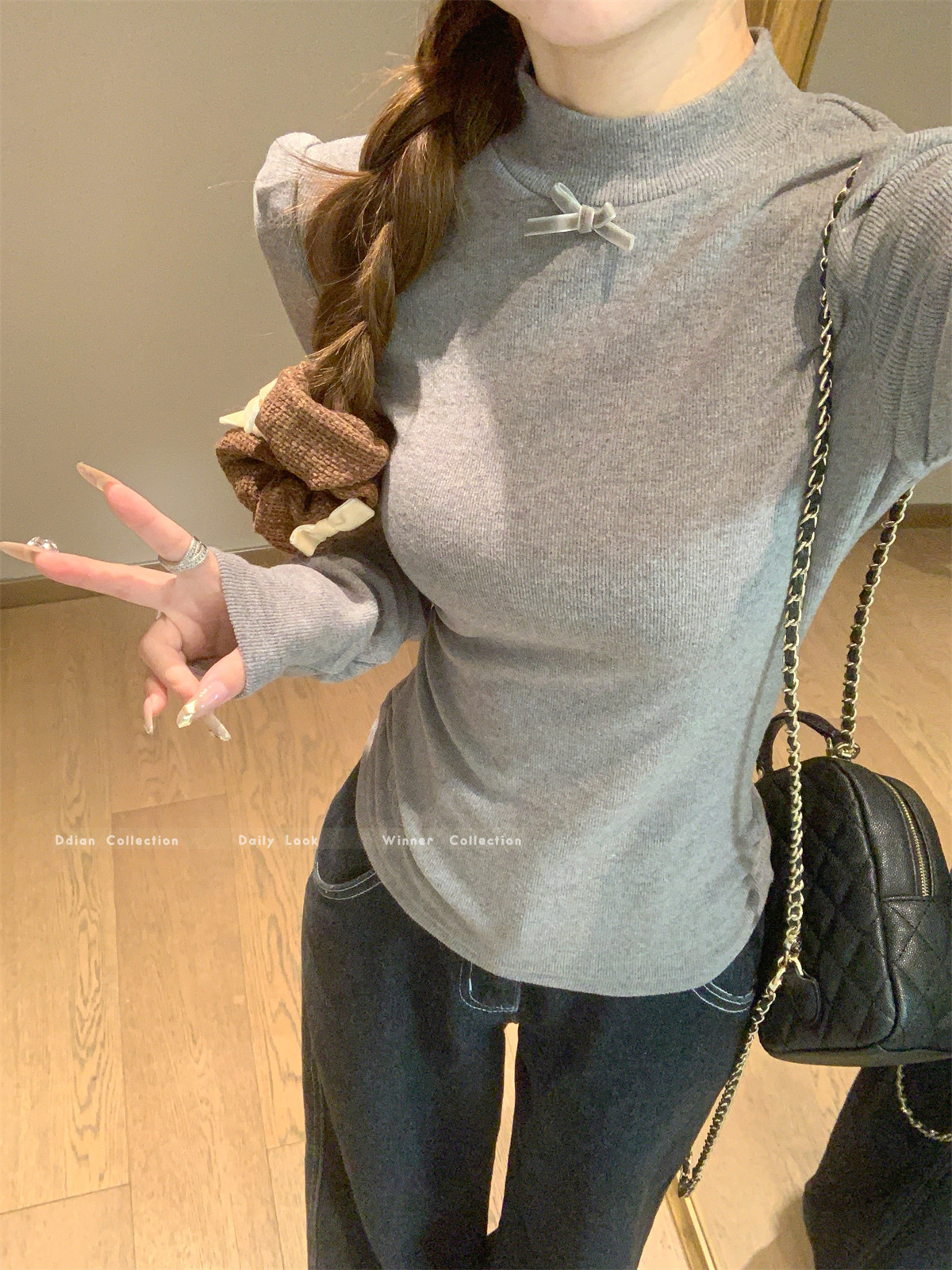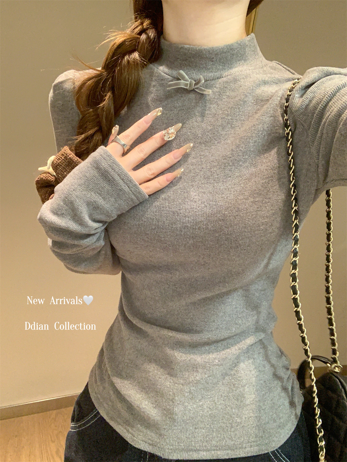 Korean Style Gentle Half-High Collar Puff Sleeve T-Shirt for Women, Autumn and Winter Brushed Fleece with Pleated Design Long-Sleeve Top ins