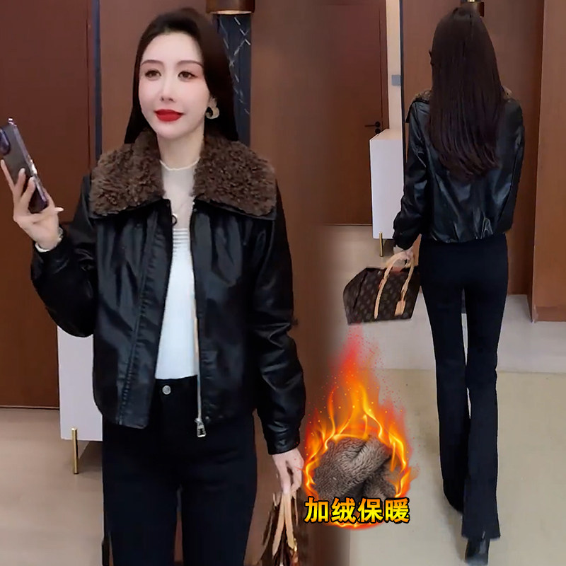 Jasmine high-definition leather jacket for women, thickened and velvet lamb fur collar, winter new warm motorcycle jacket, short cotton-padded jacket