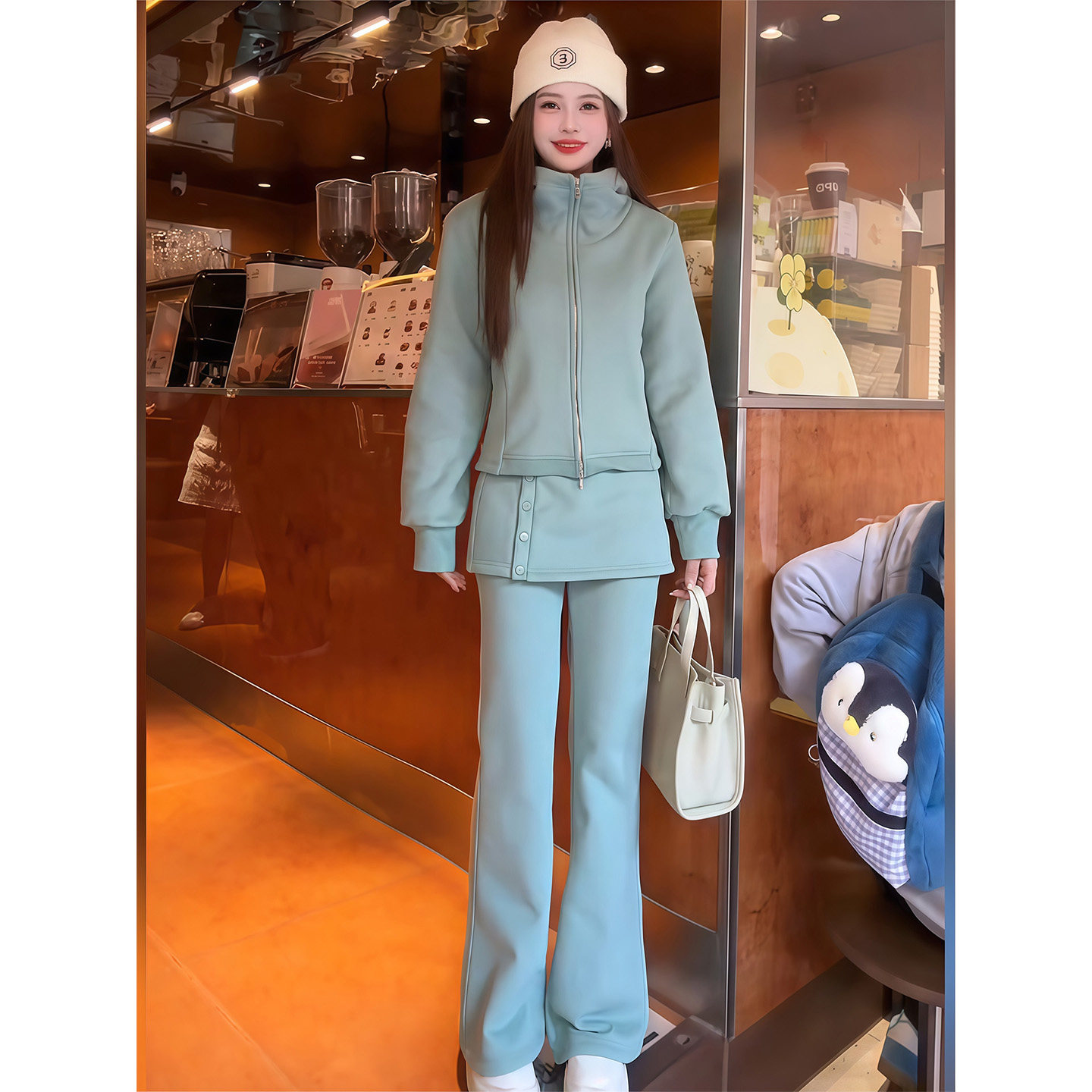 Fashionable casual sports suit for women winter 2025 new simple and versatile plus velvet thickened long-sleeved sweatshirt two-piece set