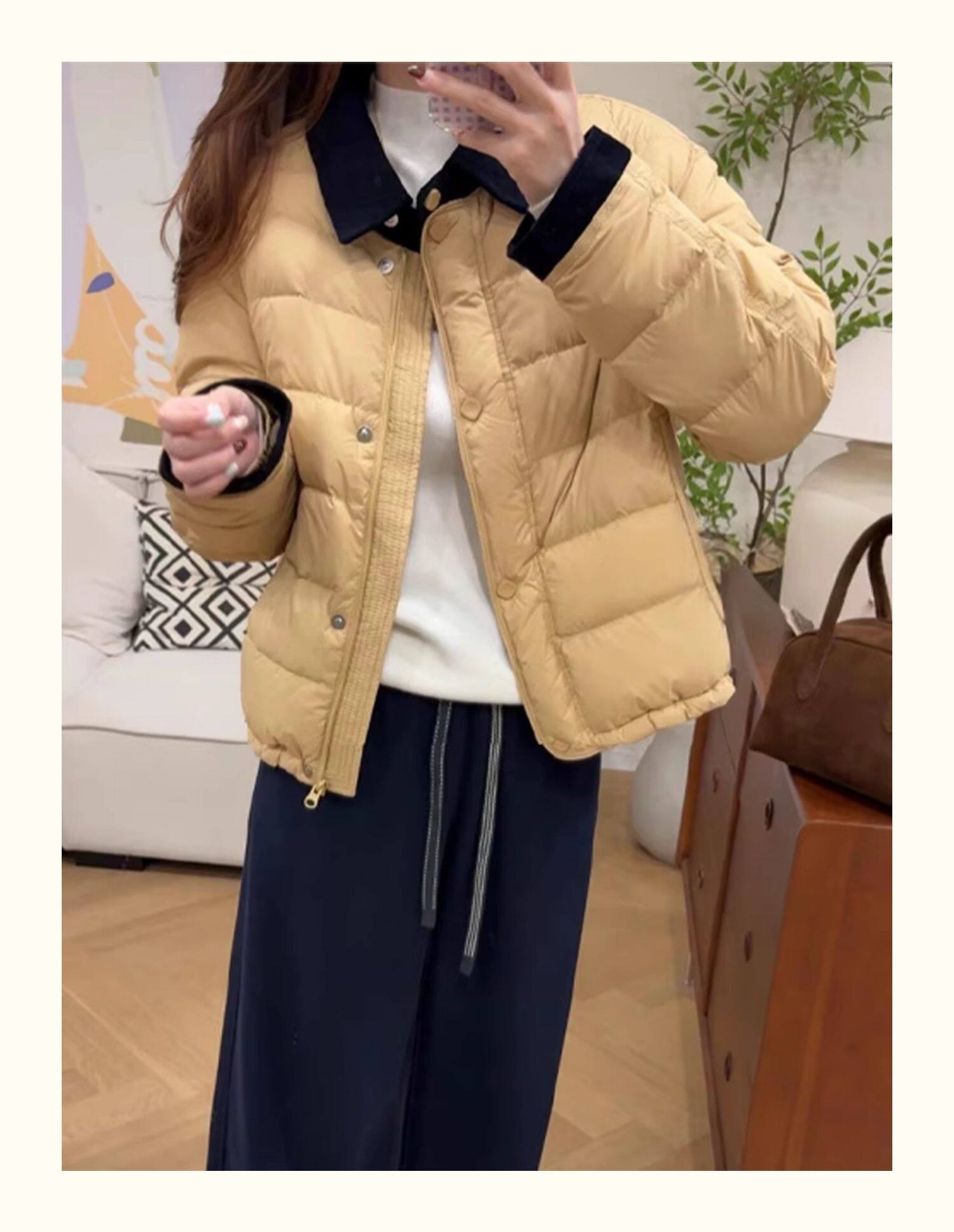 Contrast color lapel down jacket for women 2025 winter new fashion thin and foreign style white duck down warm jacket for small people