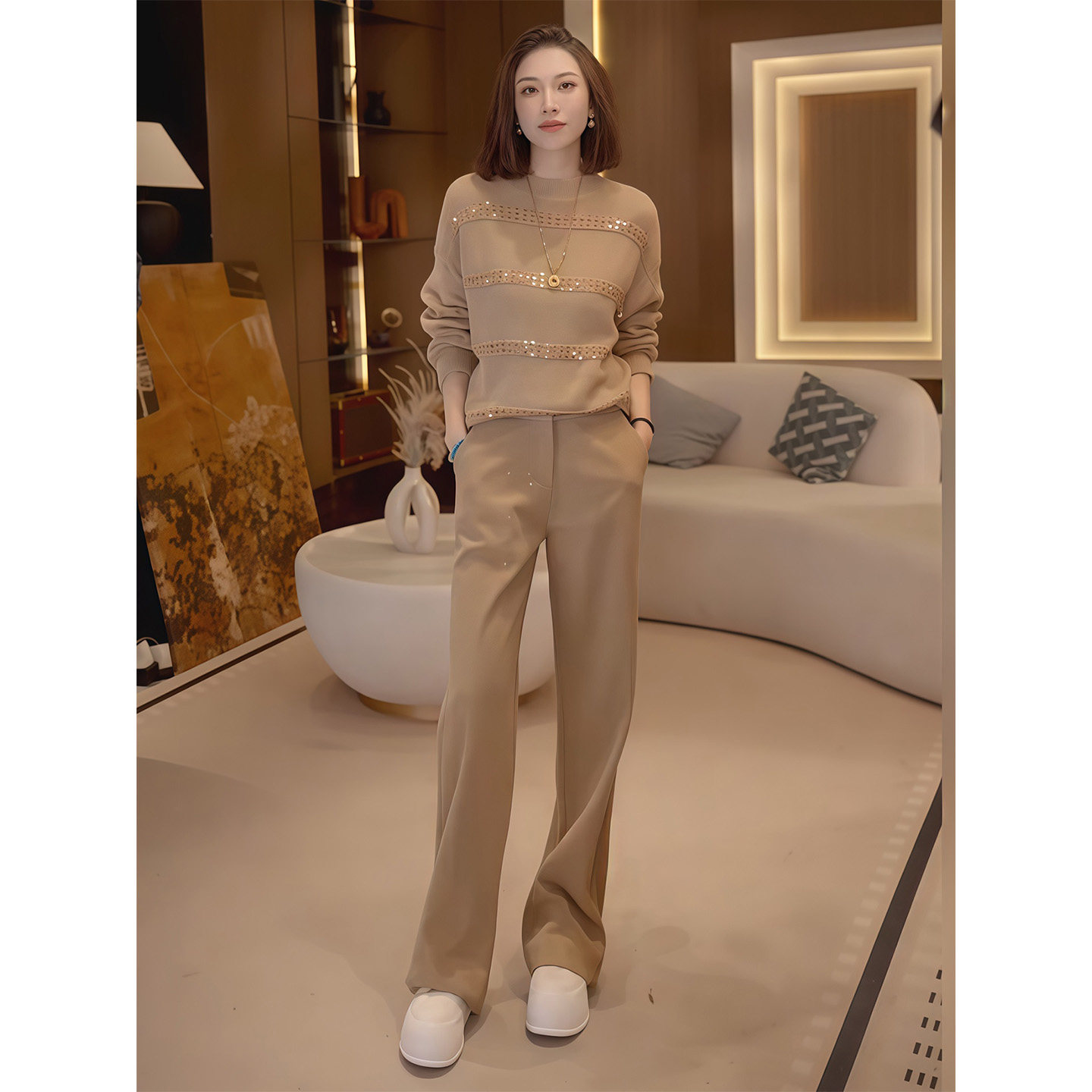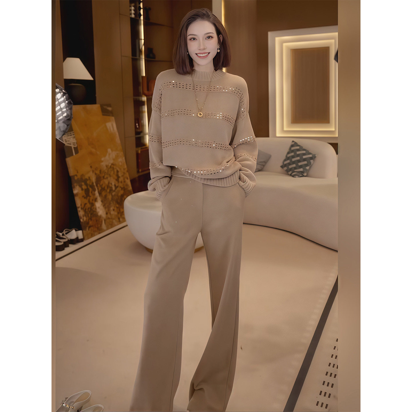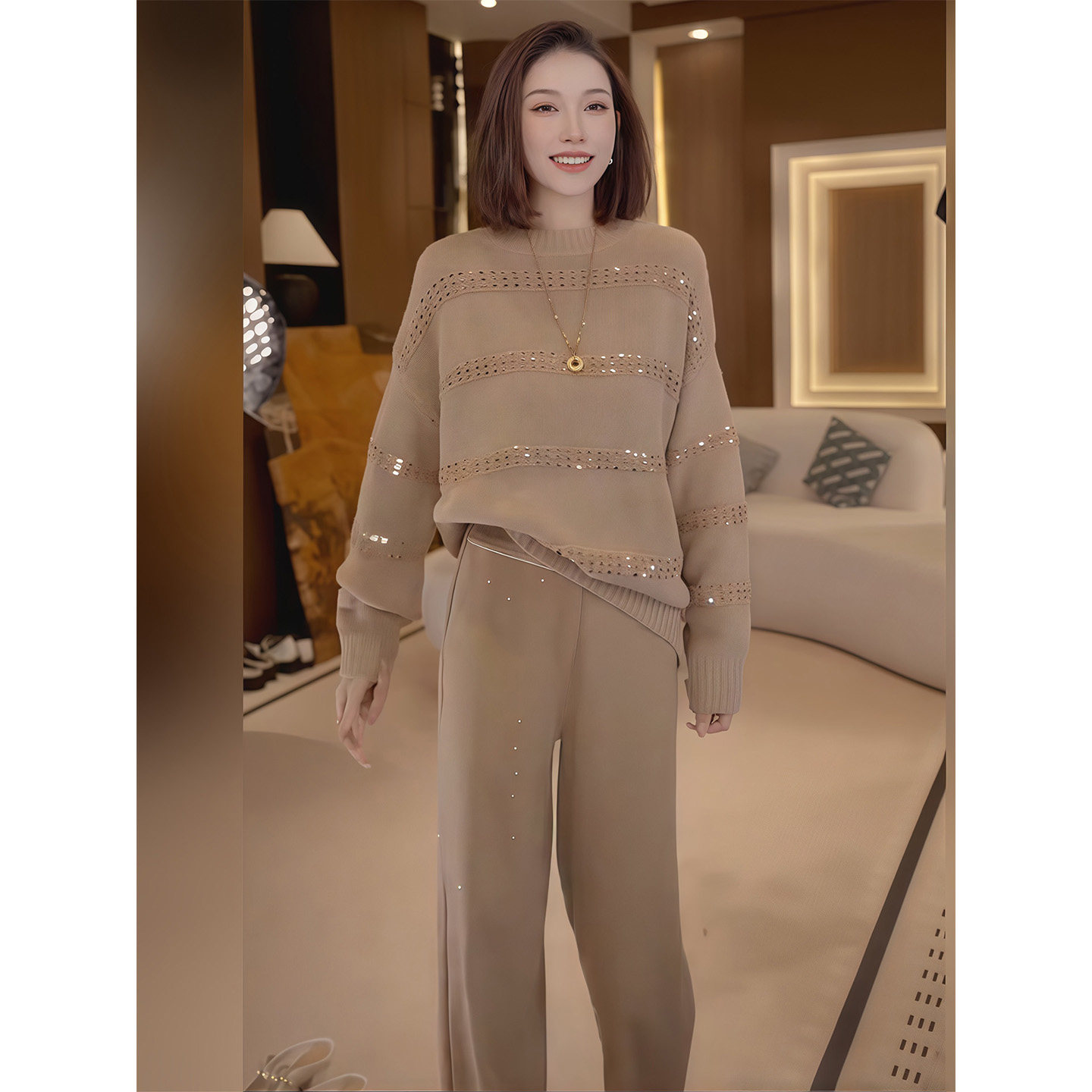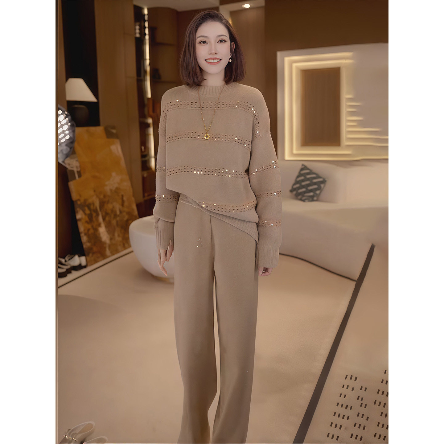 Lazy Style Fashionable Casual Suit for Women Winter New Khaki Light Luxury Sequined Knitwear Wide-Leg Pants Two-Piece Set