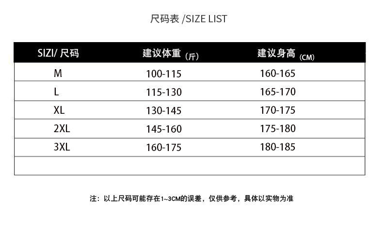Size M 100-115 Jin Jin equals 0.5 kg,L 115-130 Jin Jin equals 0.5 kg,XL 130-145Jin Jin equals 0.5 kg,2XL 145-160Jin Jin equals 0.5 kg,3XL 160-175 Jin Jin equals 0.5 kg