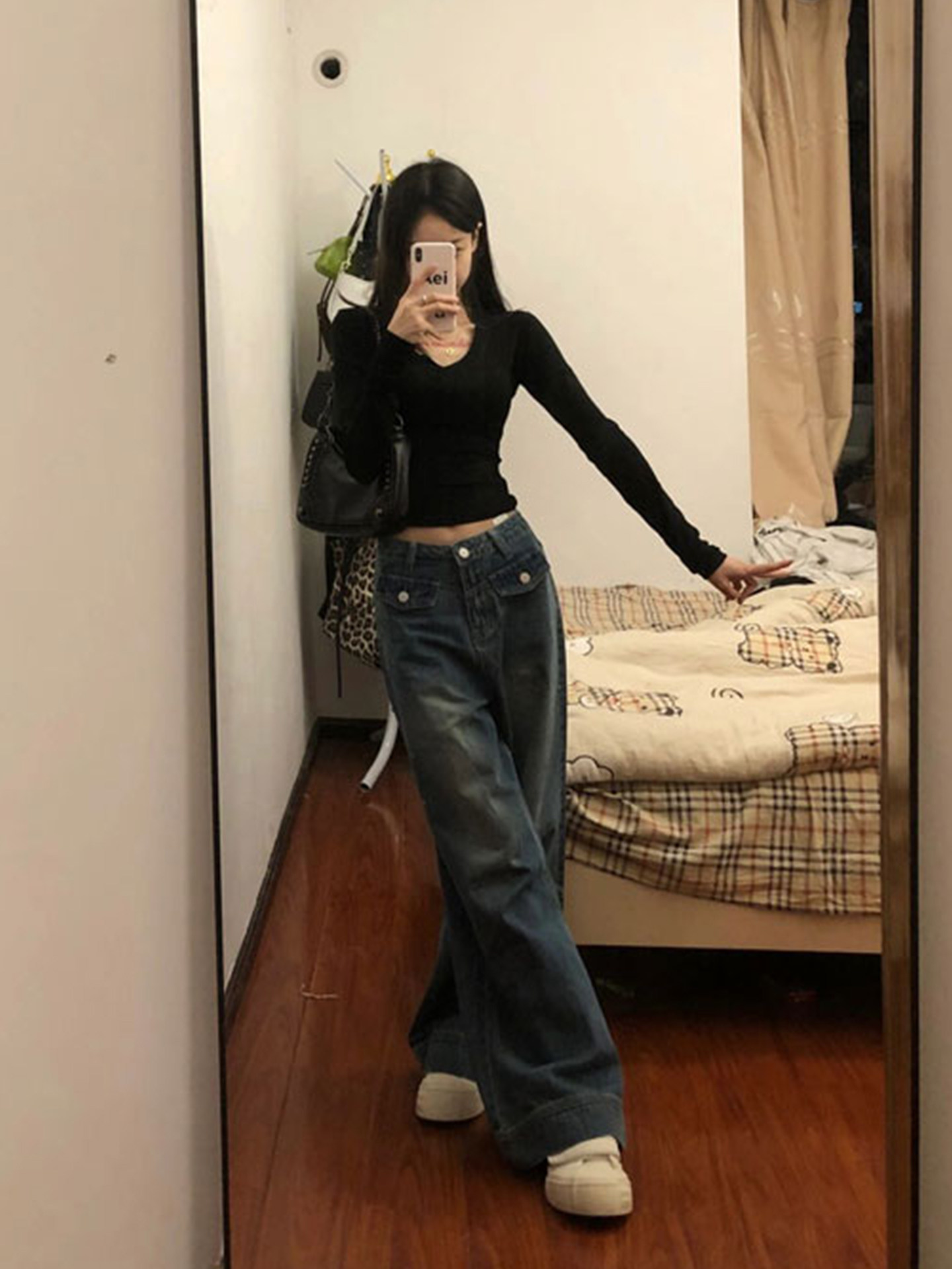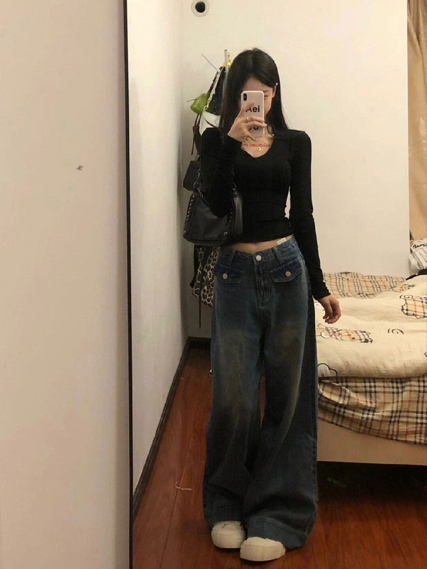 Black V-Neck Inner Layering Shirt for Petite Women, Autumn and Winter Stylish and Chic Slim-Fit Base Shirt Top