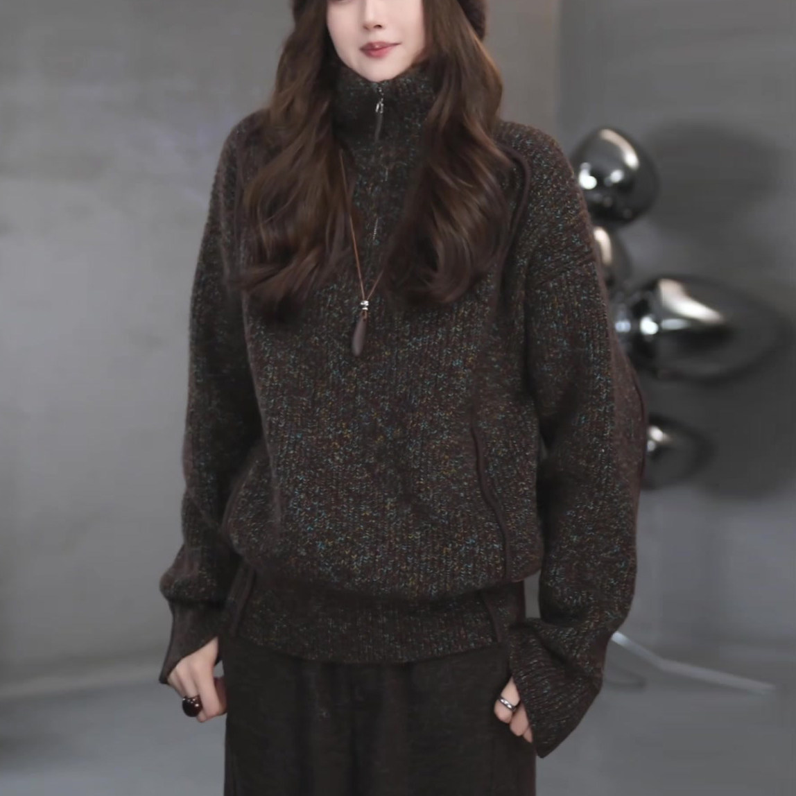 La Chapelle's lazy, high-end heavy-duty half-zip floral yarn sweater for women in spring, autumn and winter, loose knitted sweater