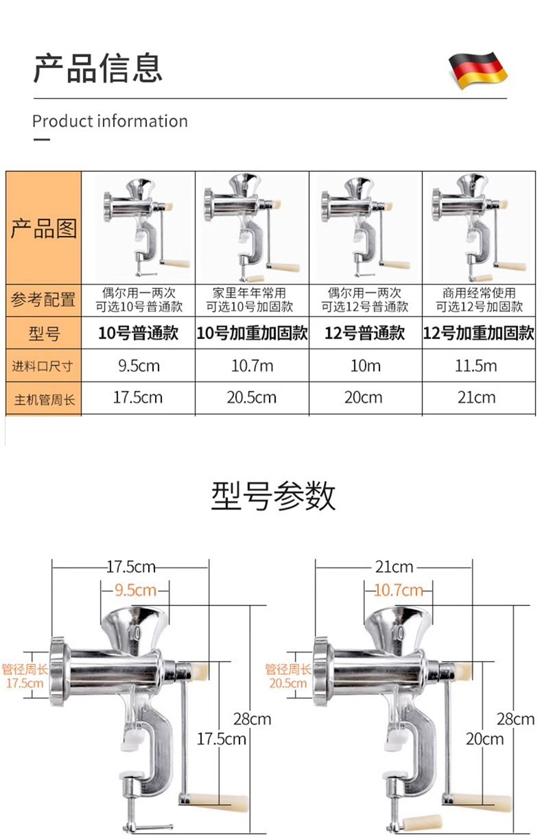 Sort by color Collection and purchase, fast delivery, quality assurance, worry-free after-sales service,No. 10 basic model only enema without blade,No. 10 basic model, only enema without blades - comes with a large package of casings,No. 10 upgraded model can mince meat and enema,No. 10 upgraded model can be enema and ground meat - comes with a large package of casings,No. 10 luxury model can grind meat, enema and powder,No. K10 luxury model can grind meat for enema and grind it into powder - free large package of casings,No. 12 basic model only enema without blade,No. 12 upgraded model can be enema and minced meat - comes with a large package of casings,No. 12 luxury model can grind meat into sausage and grind it into powder - free large package of casings,No. 10 extra thick basic model only enema without blade,No. 10 plus weight basic model only enema - free large package of casings,No. 10 is a larger and thicker upgraded model that can be used for mincing meat and making sausages.,No. 10, extra thick and luxurious model that can be ground into powder for enema and meat grinding,No. 10 enlarged and upgraded version, can be enema and ground meat - comes with a large package of casings,No. 12 extra thick basic model only enema without blade,No. 12, larger and thicker upgraded version, can be minced and enema,No. 12 Extra Thickened Luxury Model Can Grind Meat, Enema and Powder,Suction cup model, No. 10, extra thick and luxurious model, can be ground for enema and grinding meat,Suction cup model, size 12, extra thick and luxurious model, can be ground into powder for enema and grinding meat