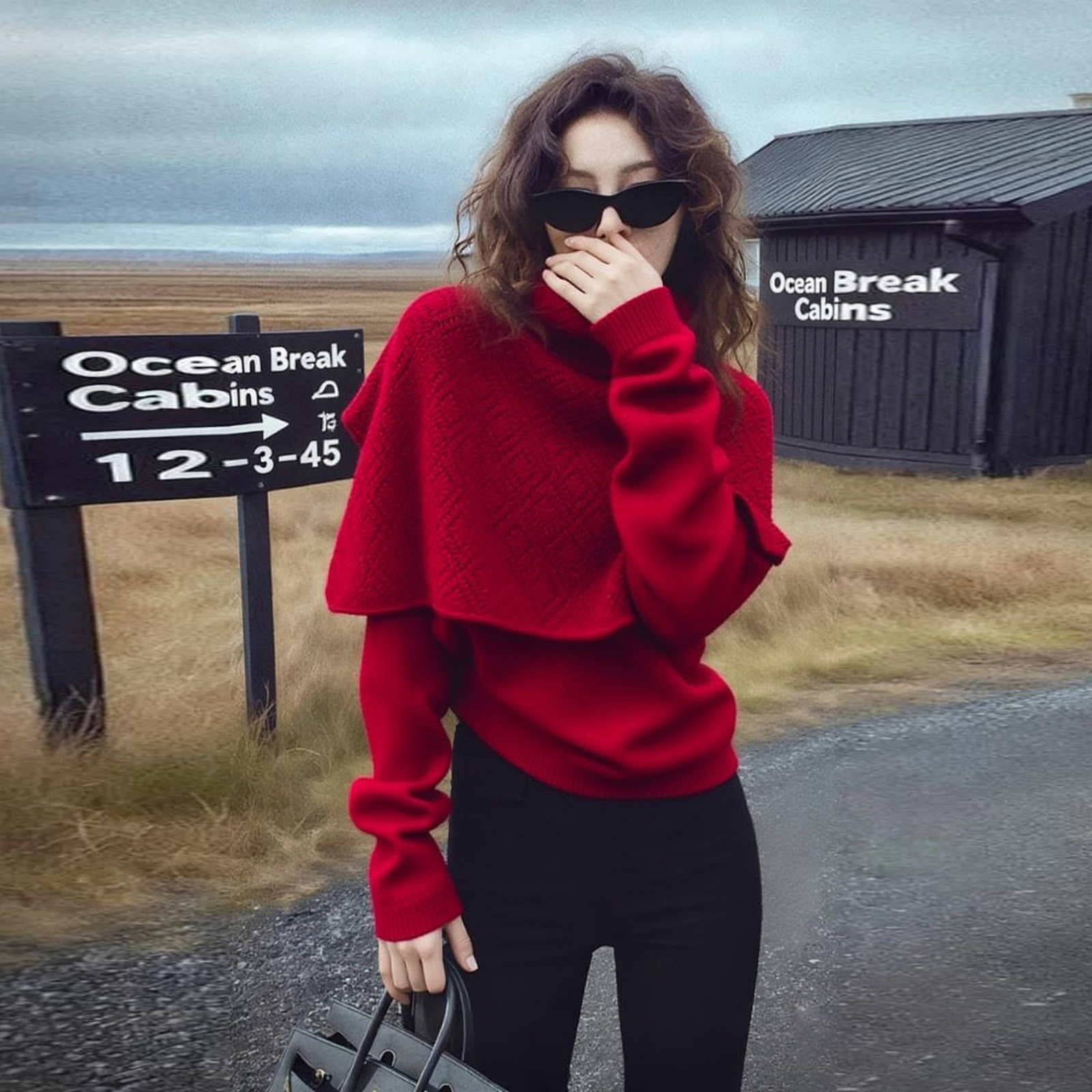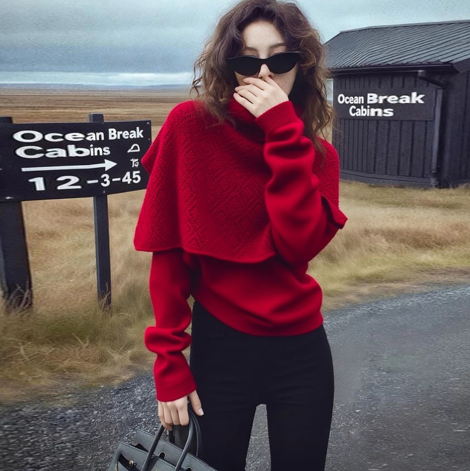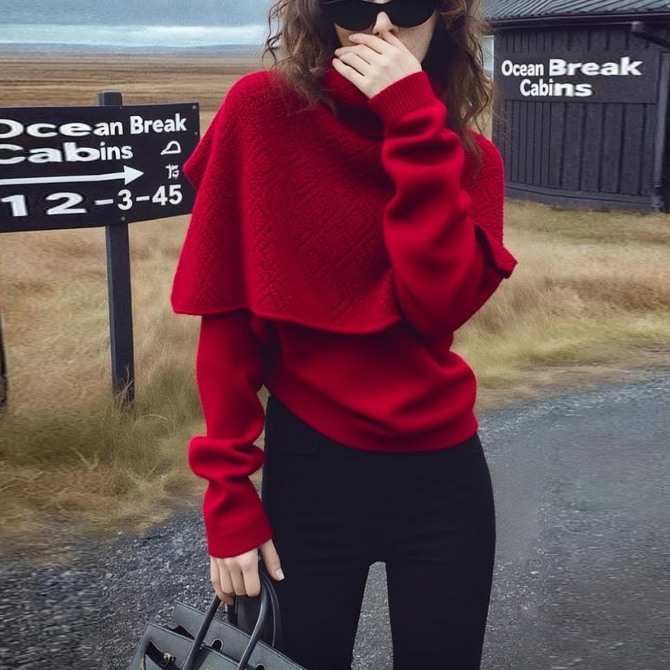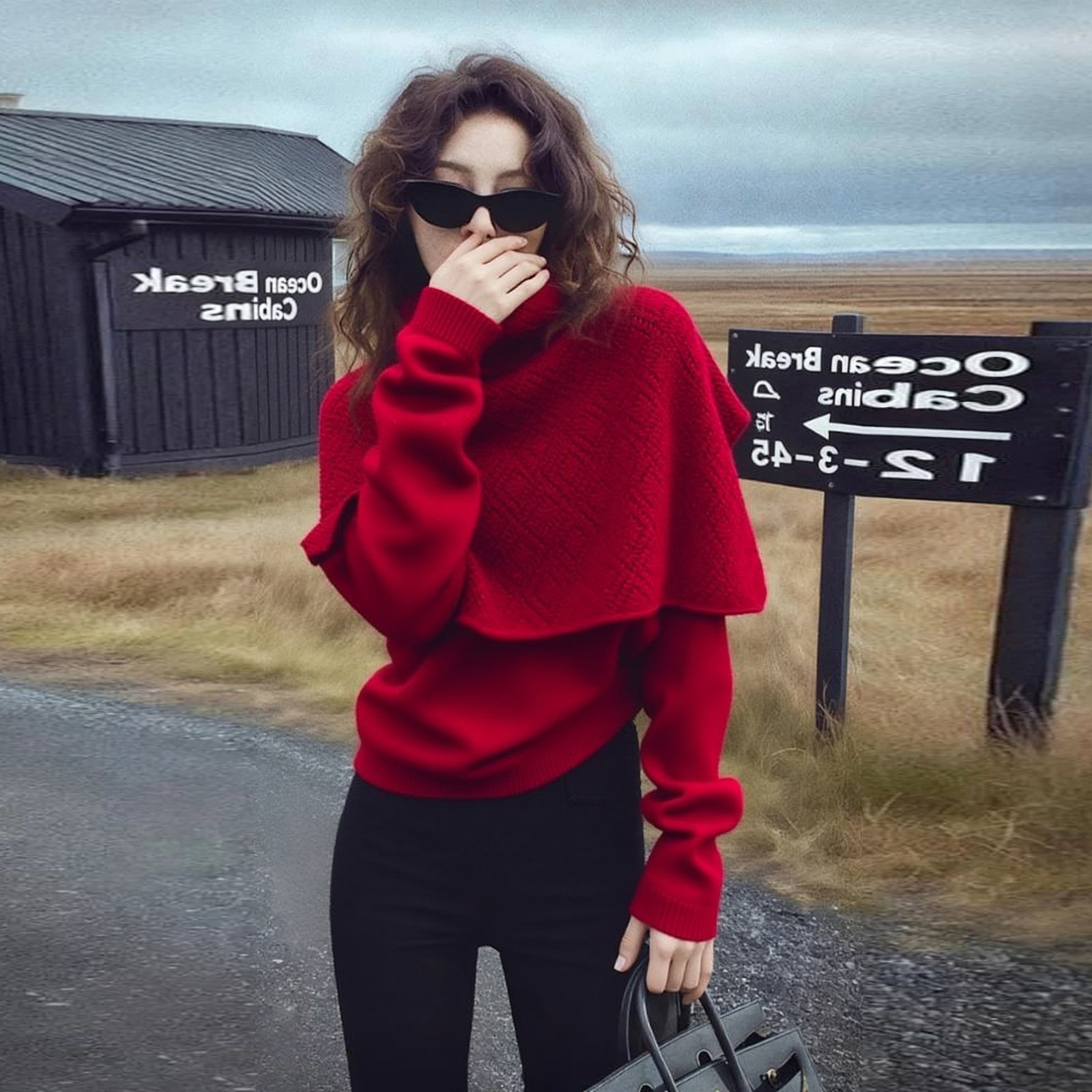 Heavy-duty bright silk design with shawl and stylish red sweater for women in autumn and winter, loose and lazy knitted sweater