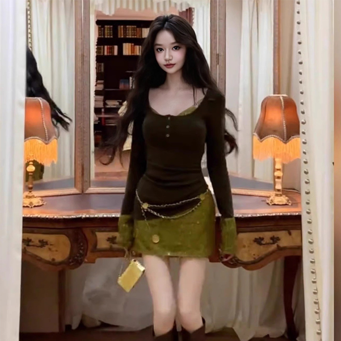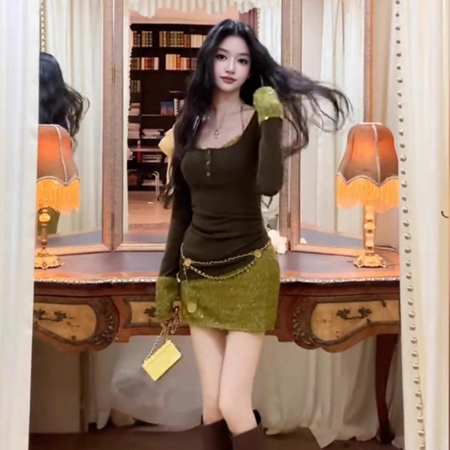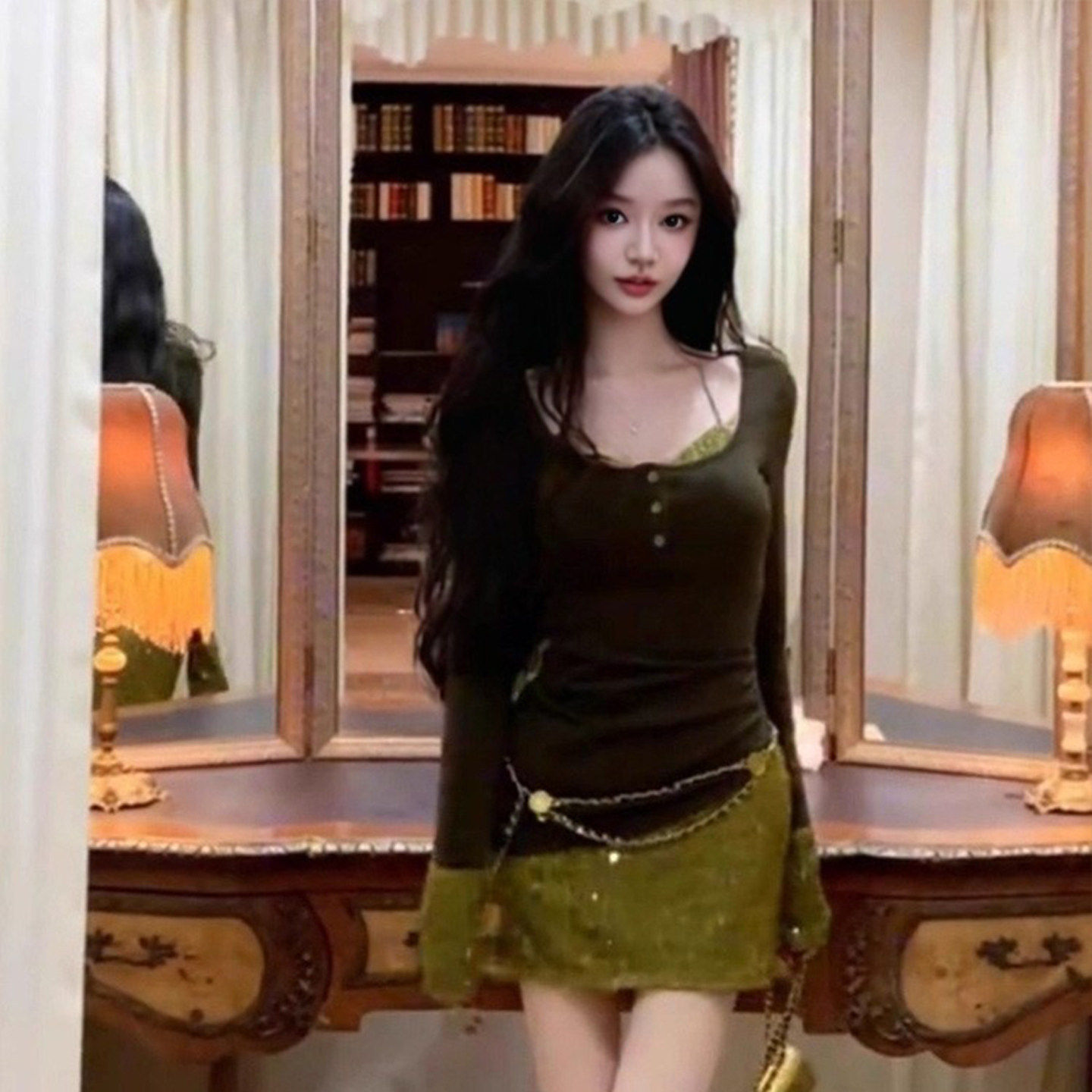 Sexy Hot Girl Outfit for Women, Autumn and Winter, Very Stylish, Faux Two-Piece Long-Sleeve Top with Sequin Strap Dress Two-Piece Set