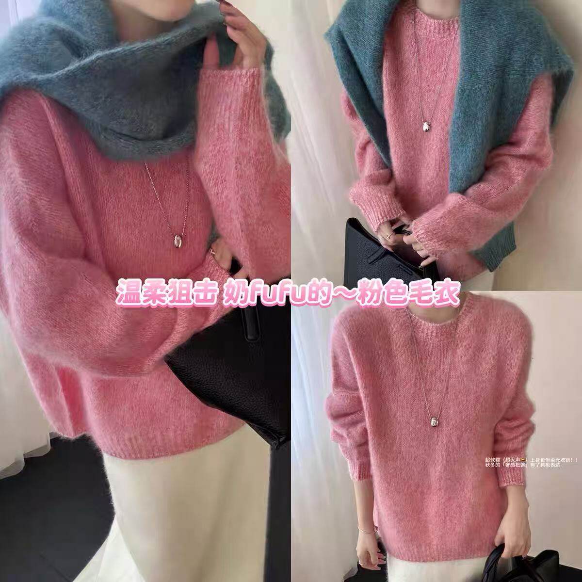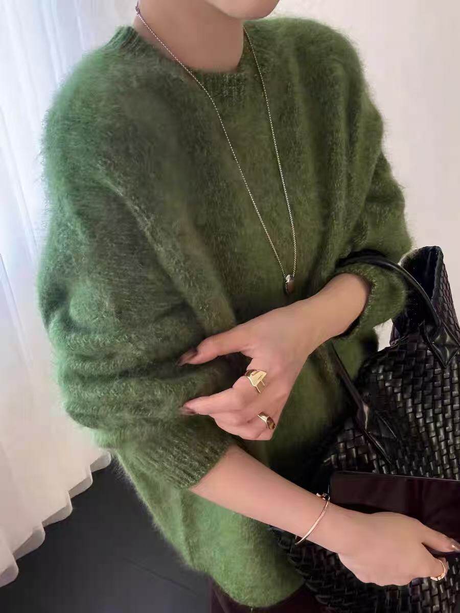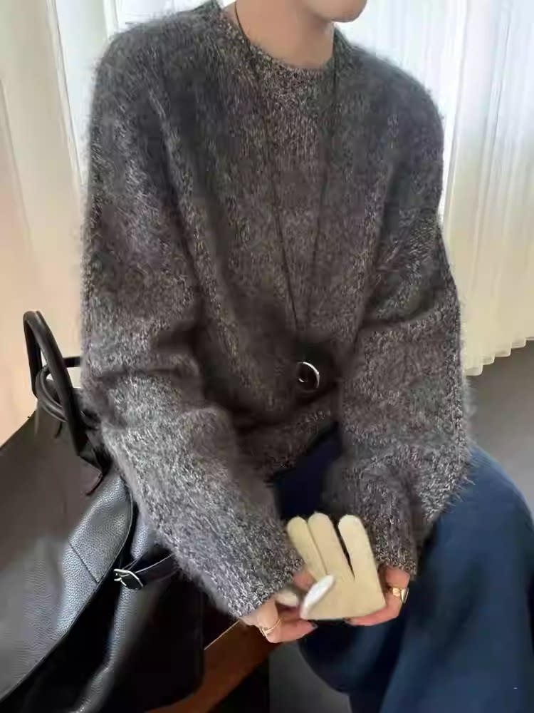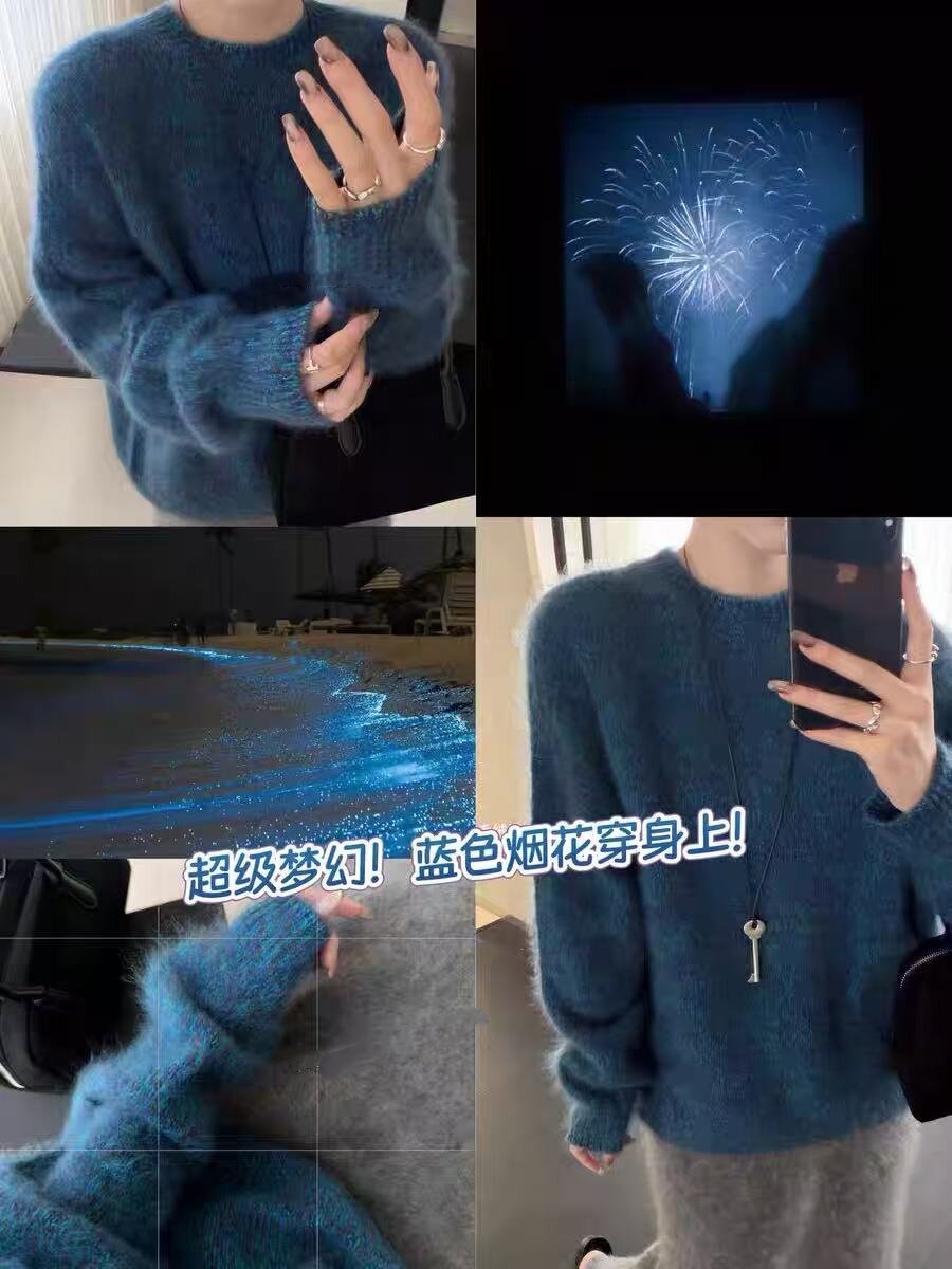 Super Love the Blue Floral Yarn~ Women's Cashmere Sweater with Round Neck, Pullover Style, Fleece-Lined, Loose Fit, Long Sleeves, Relaxed and Slimming Wool Sweater