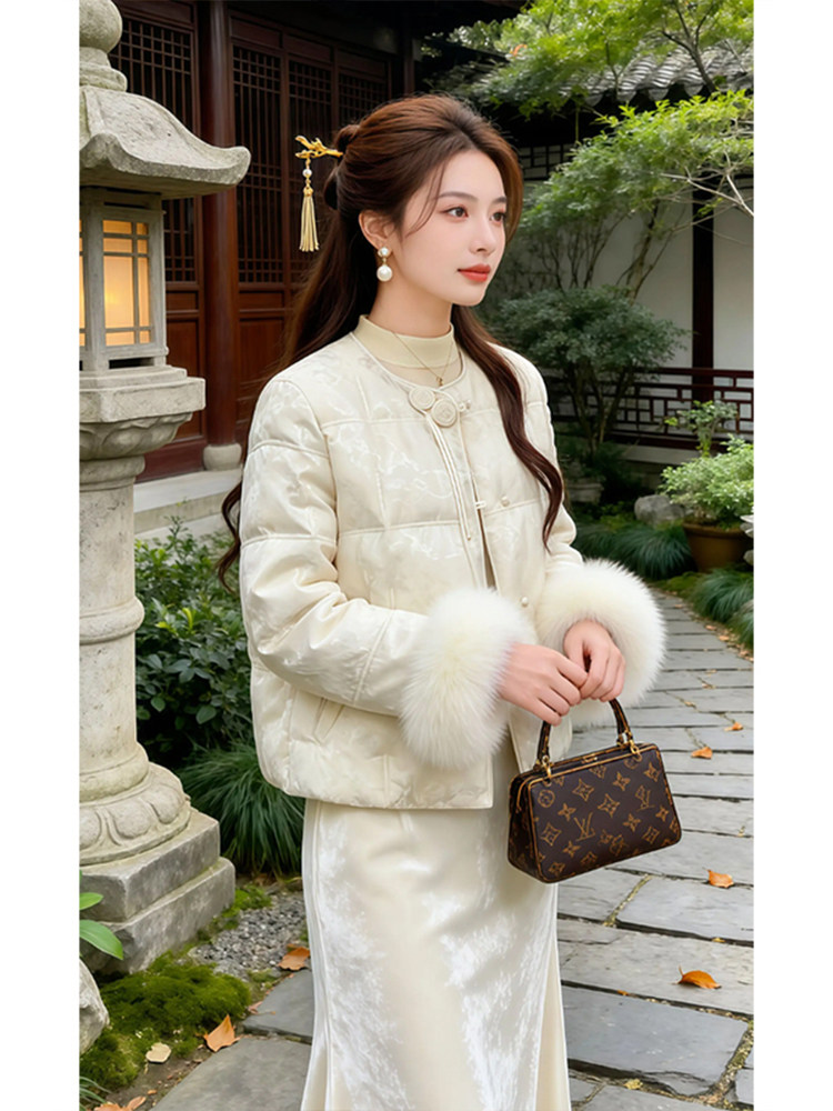 New Chinese style plush stitching jacquard down jacket women's winter 2025 new design popular bread coat