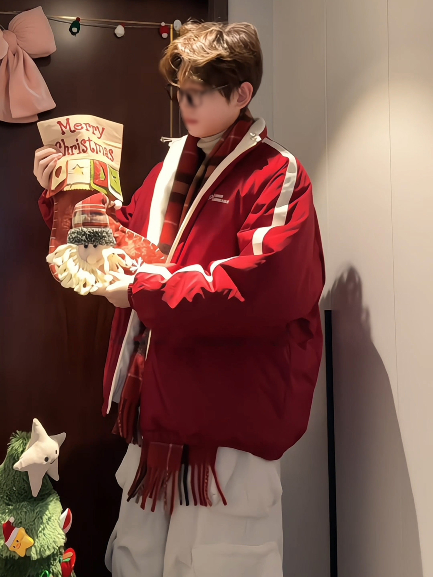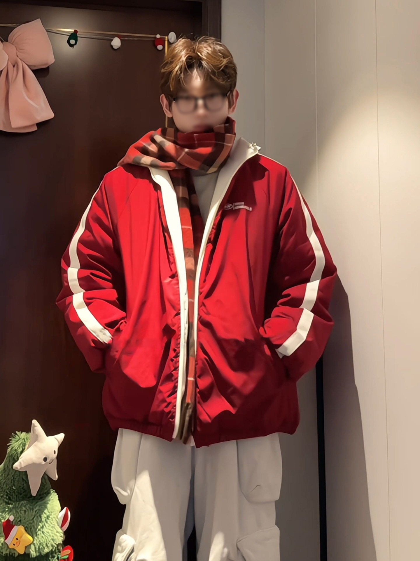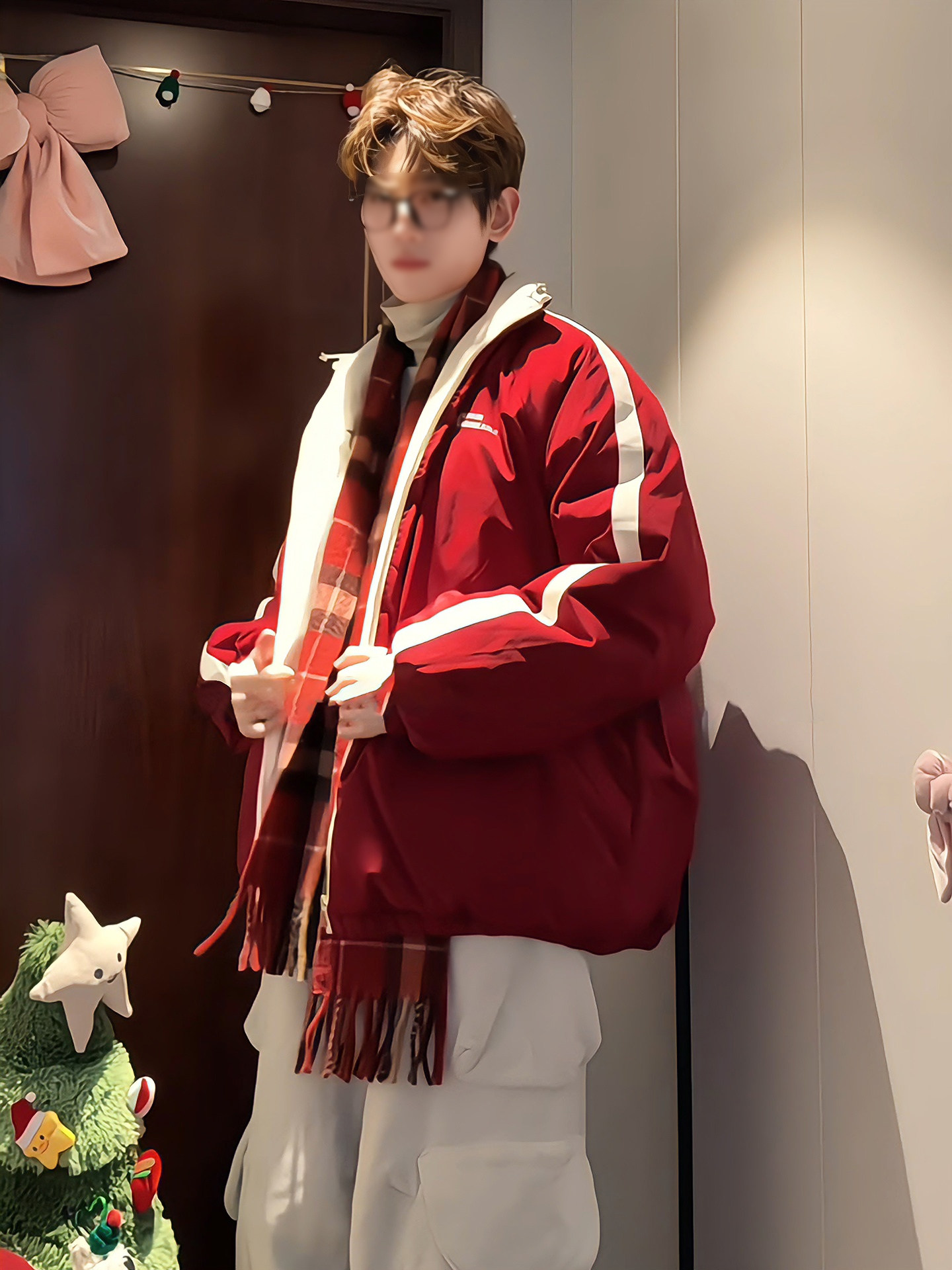 Red reversible down jacket for men, winter Christmas and New Year wear, stand-up collar cotton jacket, American style bread jacket