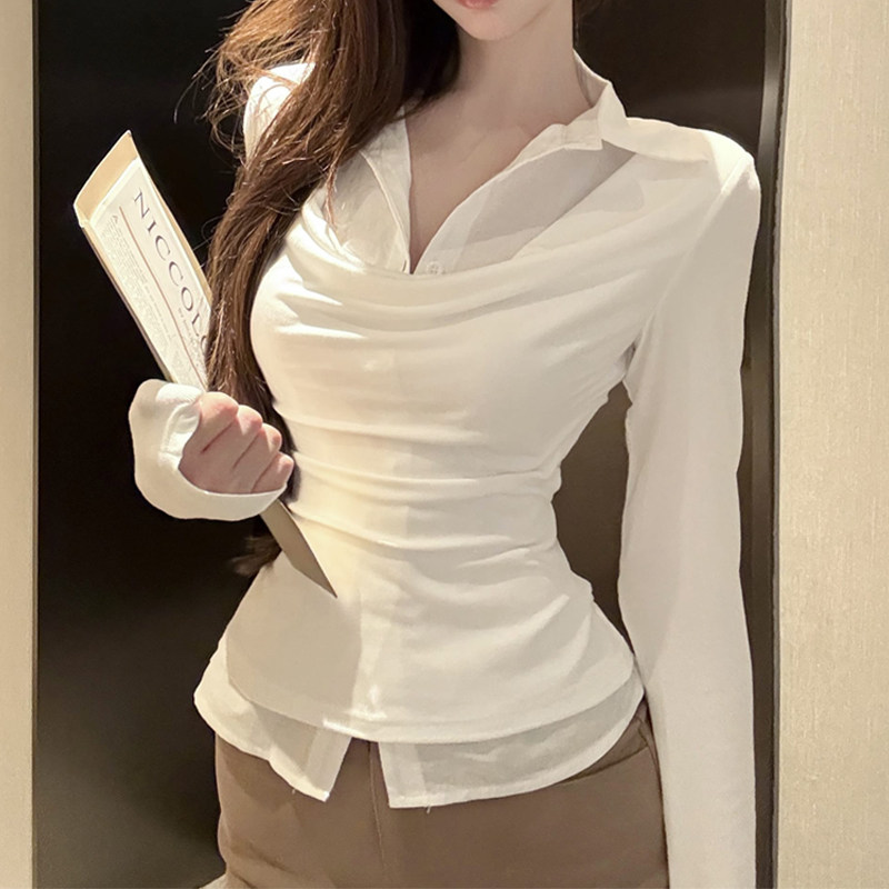 2026 Spring Style Pure Desire Hot Girl Fake Two-Piece Polo Collar T-Shirt for Women with Unique and Distinctive Design, Pleated Patchwork Shirt