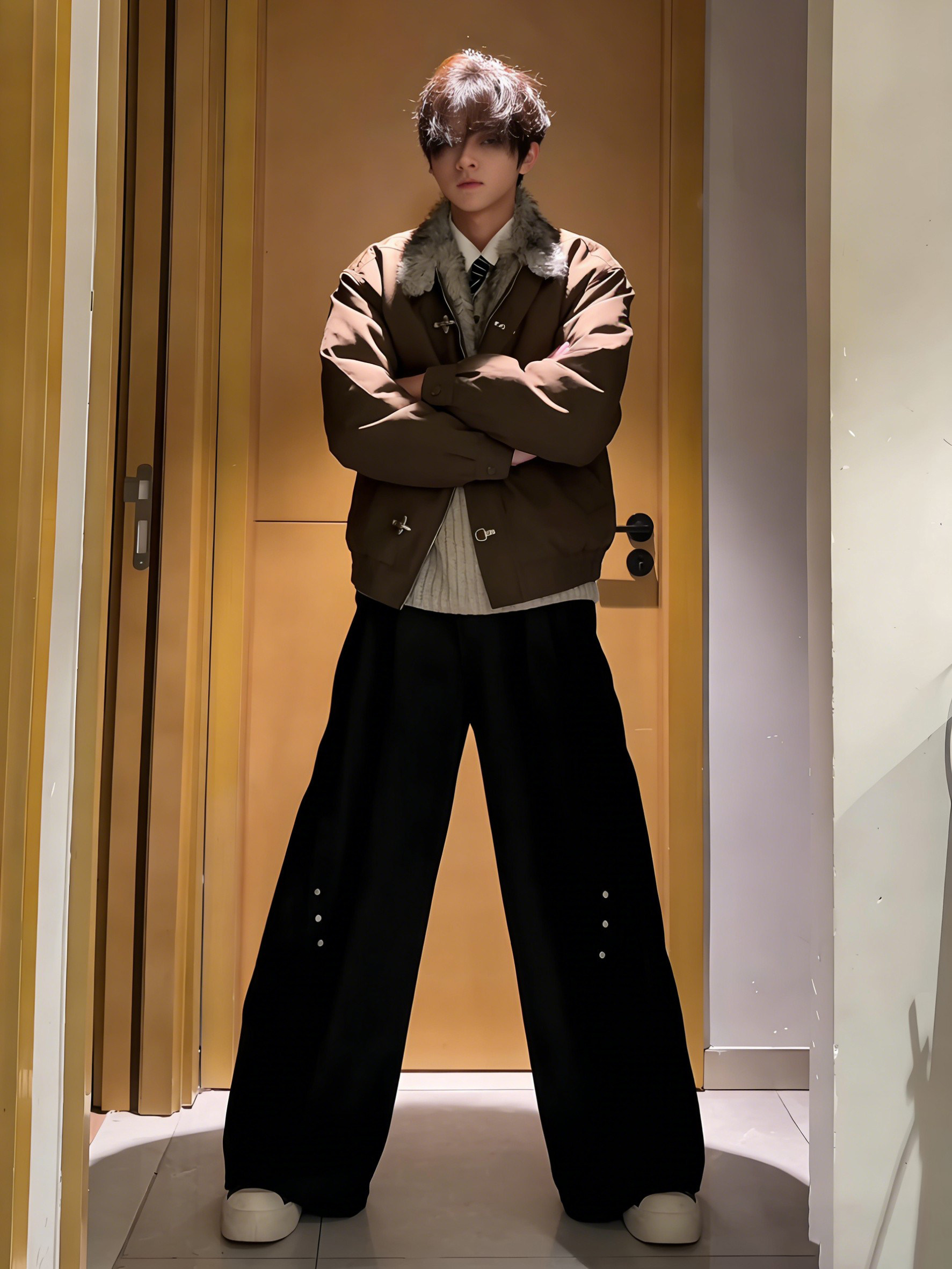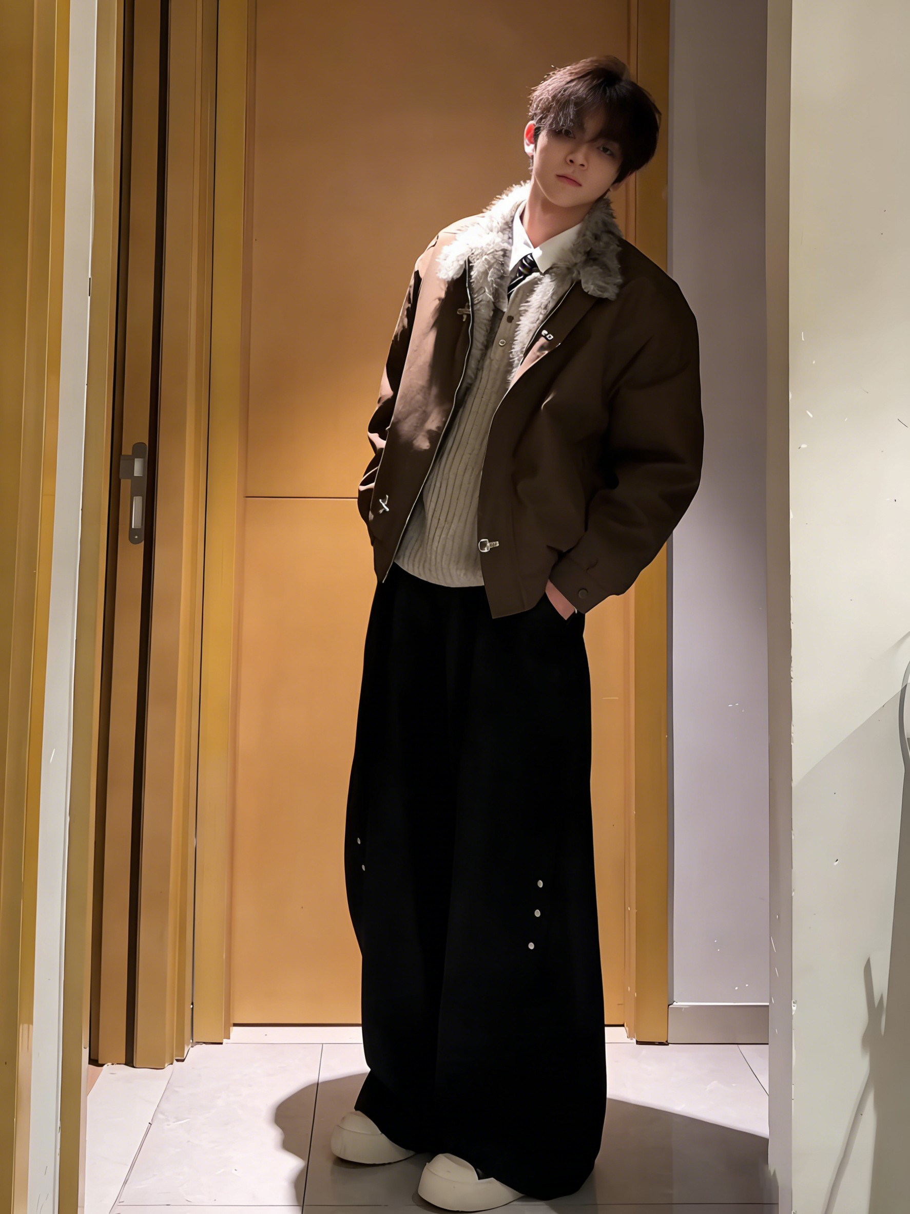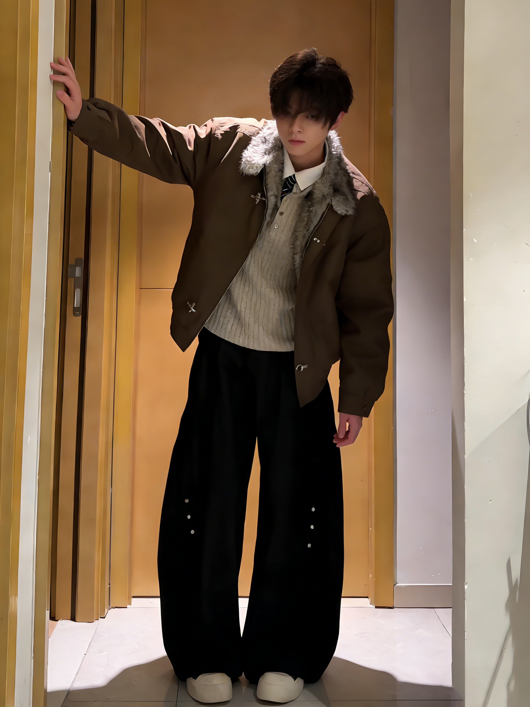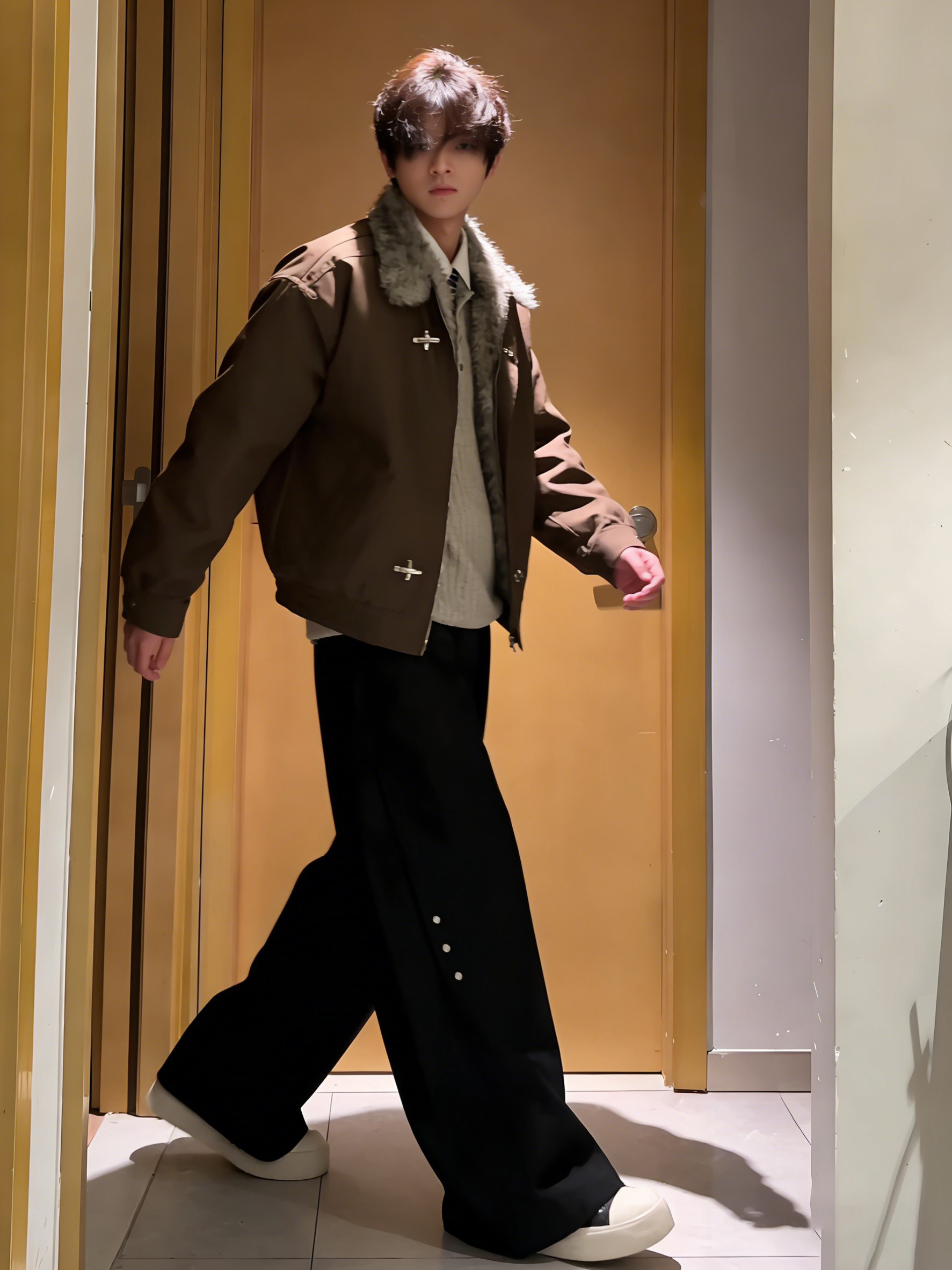 American style mountain carving fur collar cotton jacket men's winter velvet thickened warm cotton jacket aircraft button work jacket