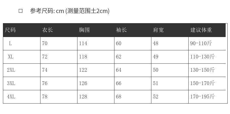 China (cm) 165 / 88-90 170 / 96-98 175 / 108-110 180 / 118-122 185 / 126-130