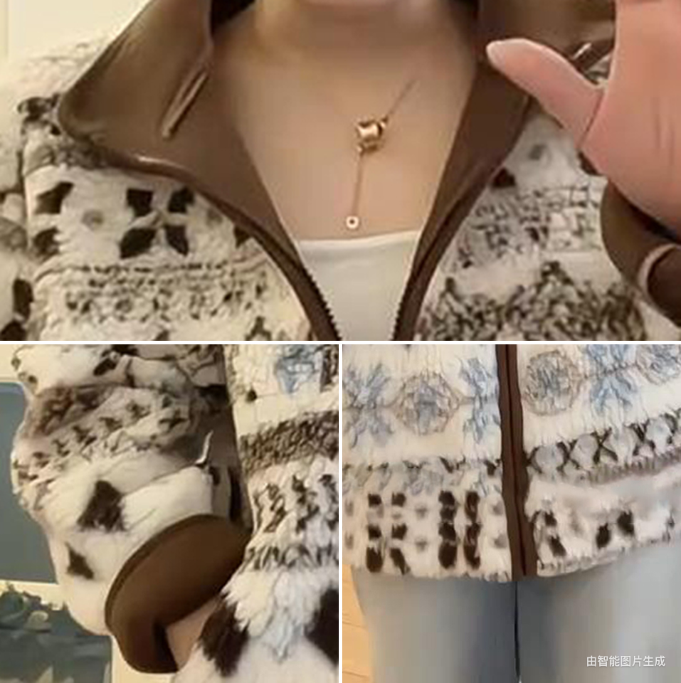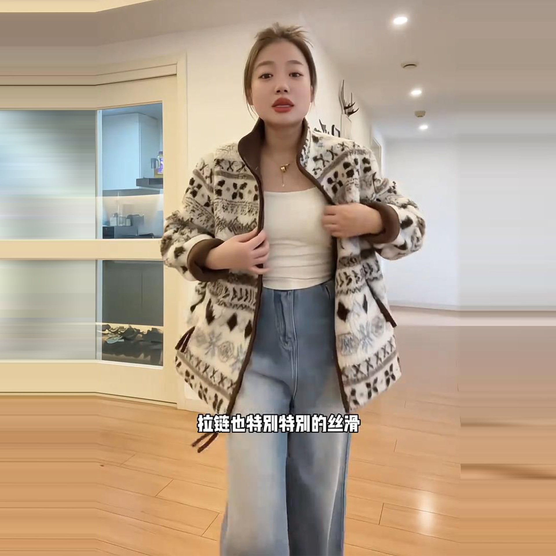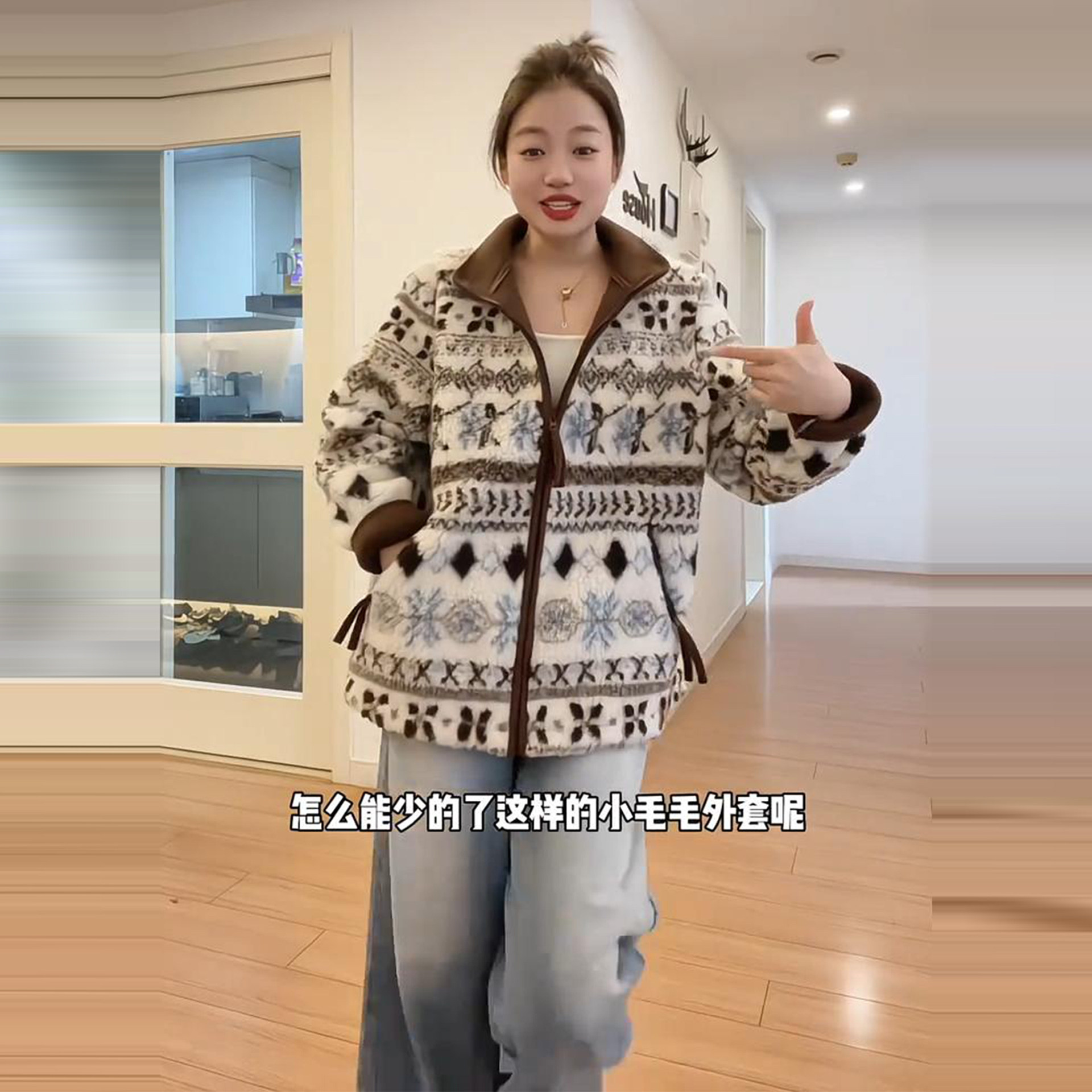 Large size Fair Isle style lamb wool coat for women in autumn and winter fat mm slim retro stand collar thickened short coat top