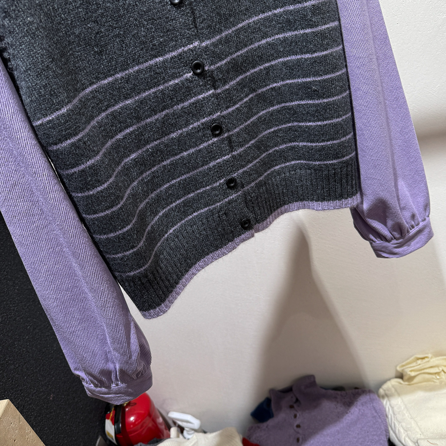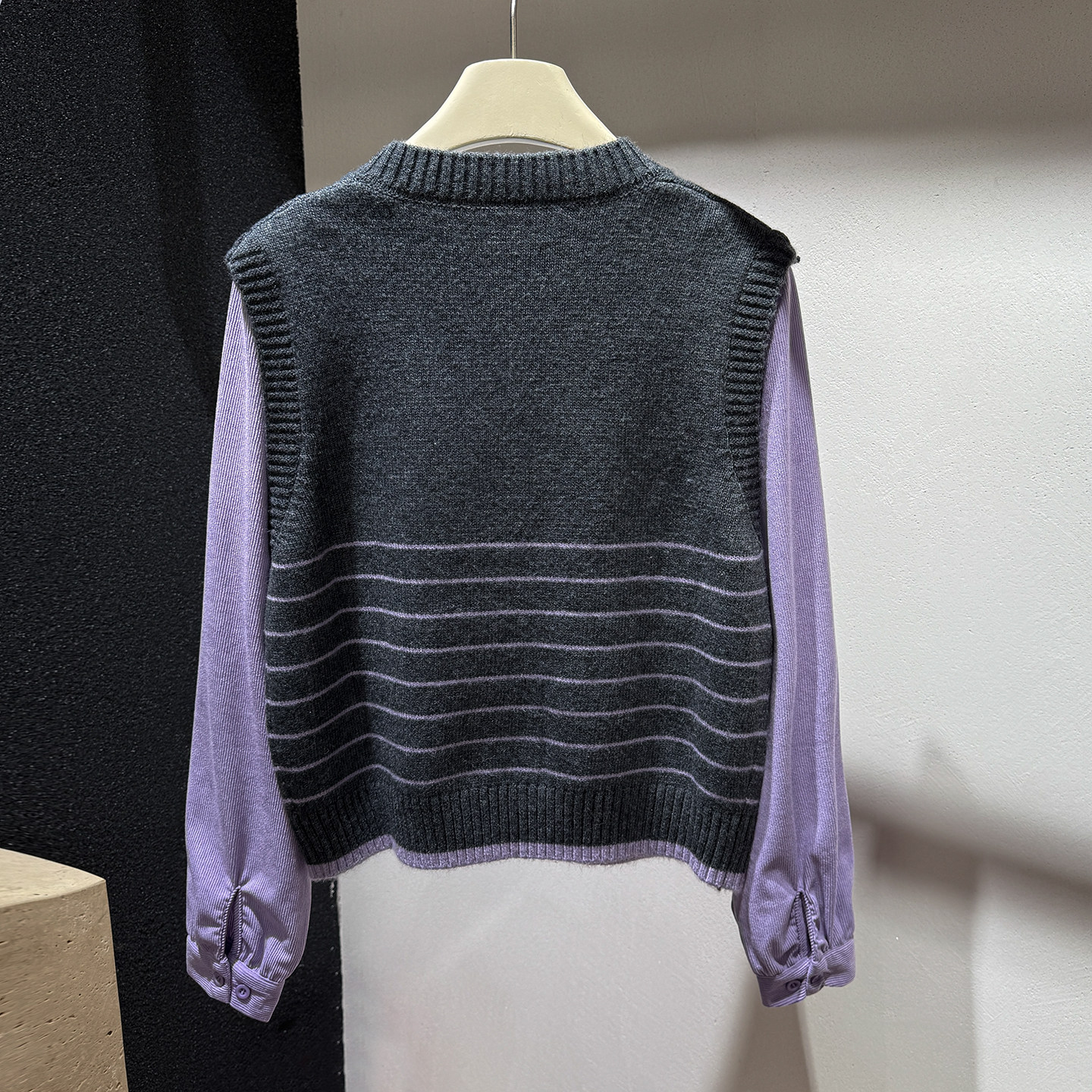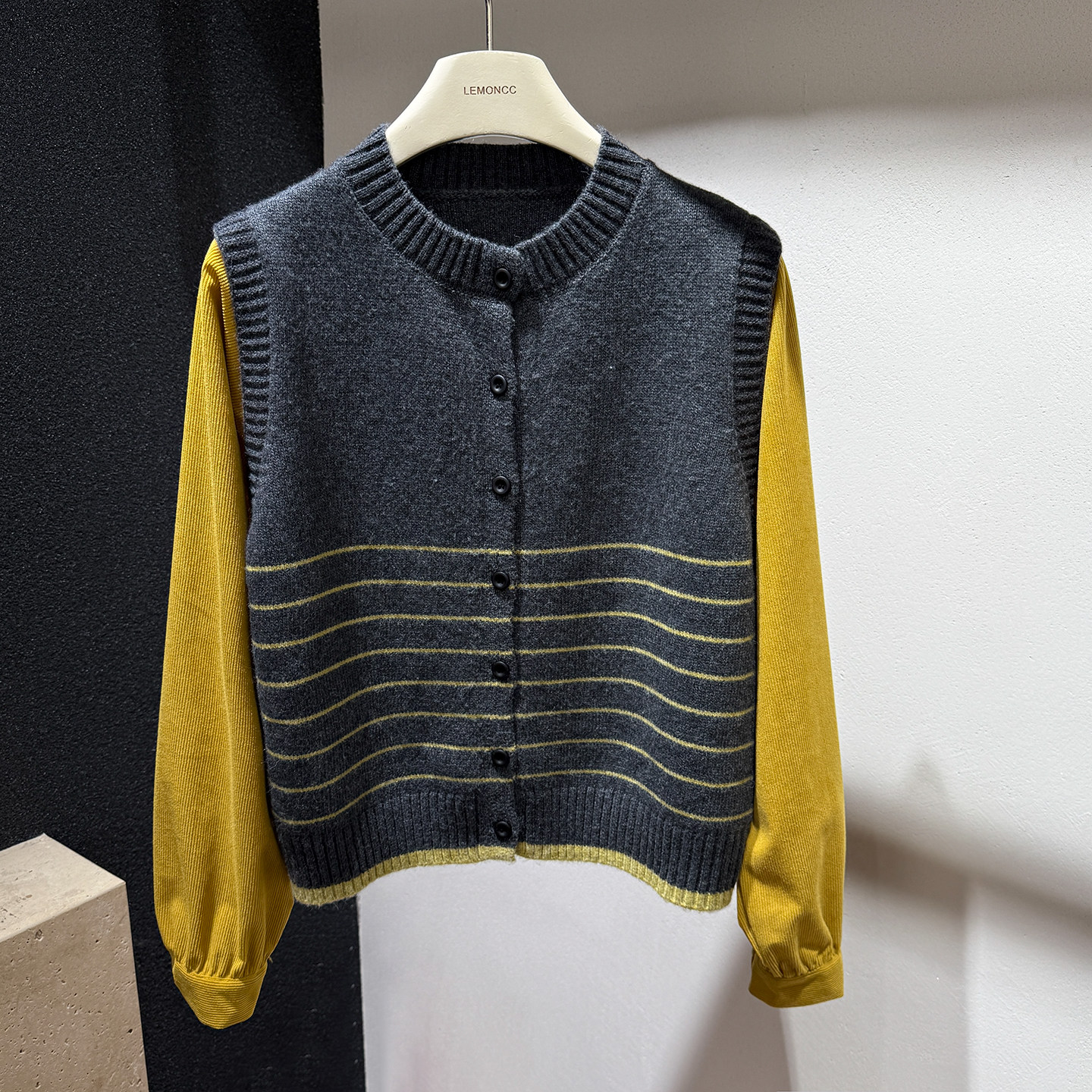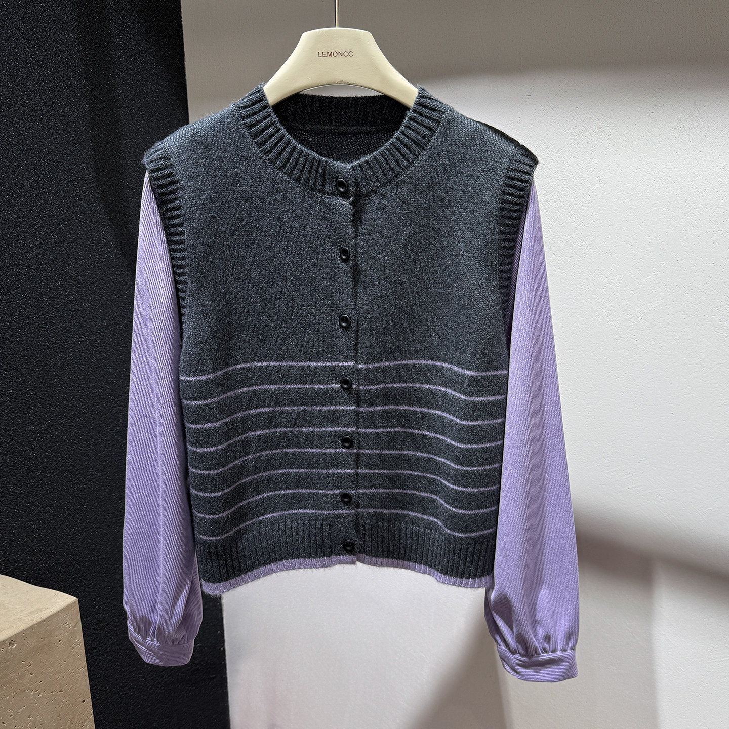 Fashionable temperament, age-reducing, lazy style, round neck, loose patchwork corduroy shirt, fake two-piece striped sweater, cardigan for women