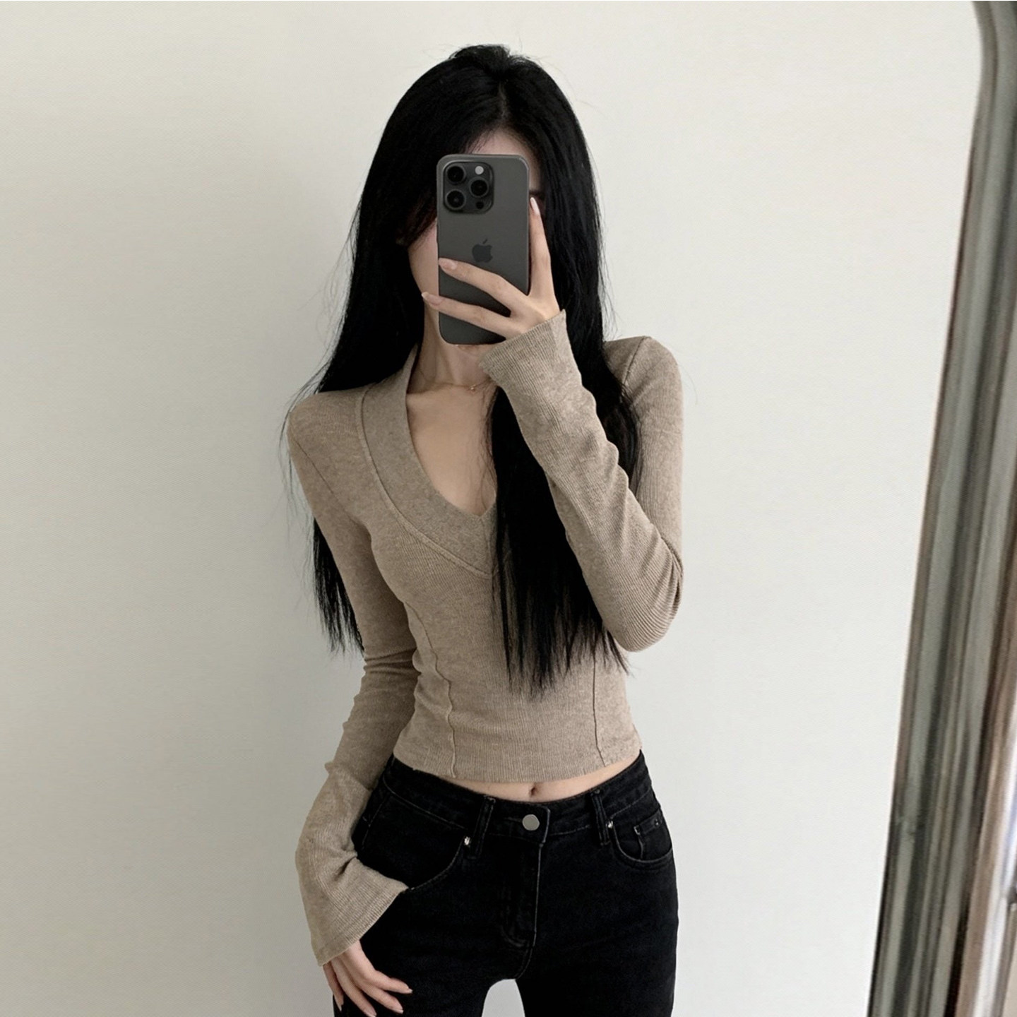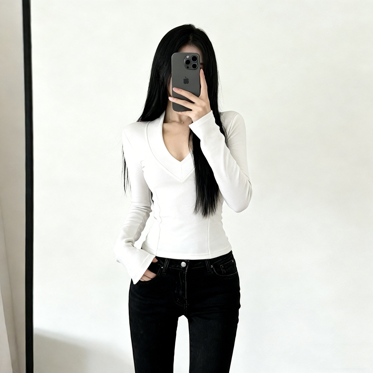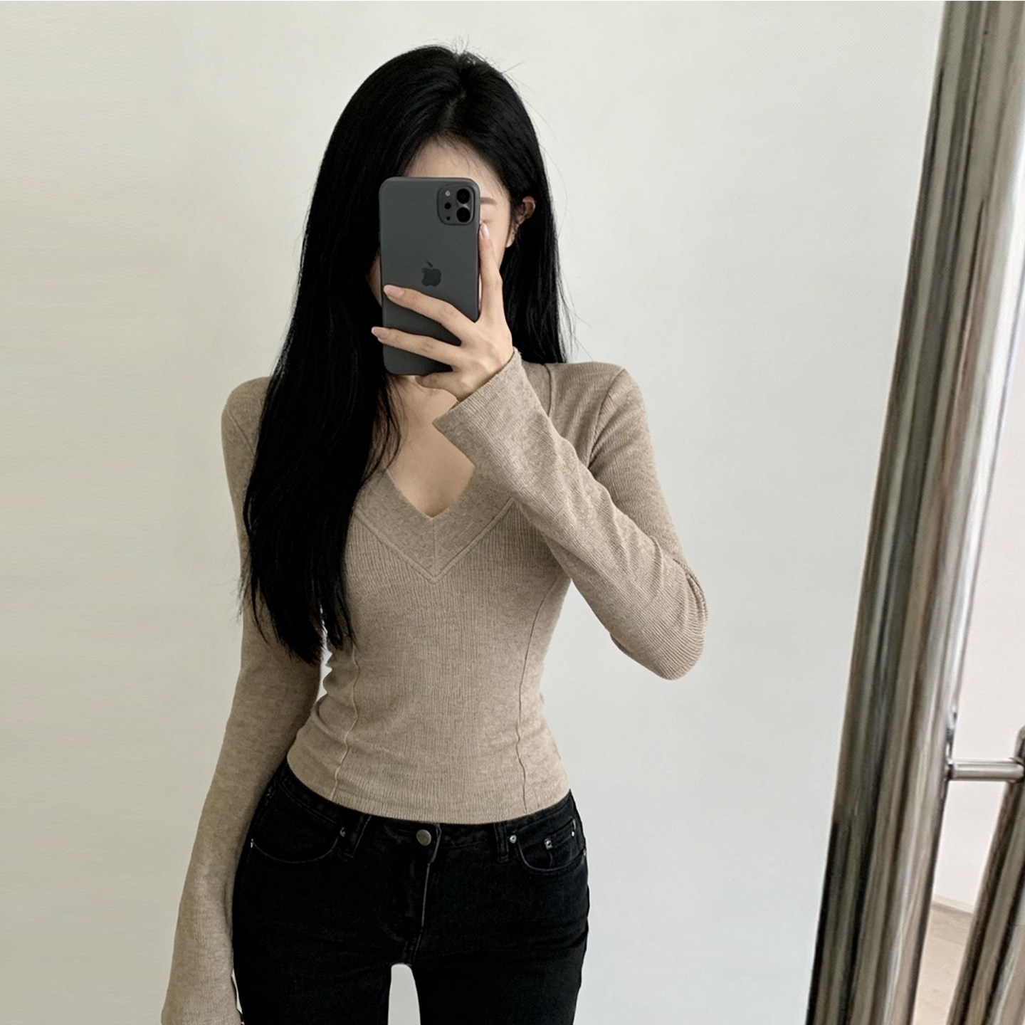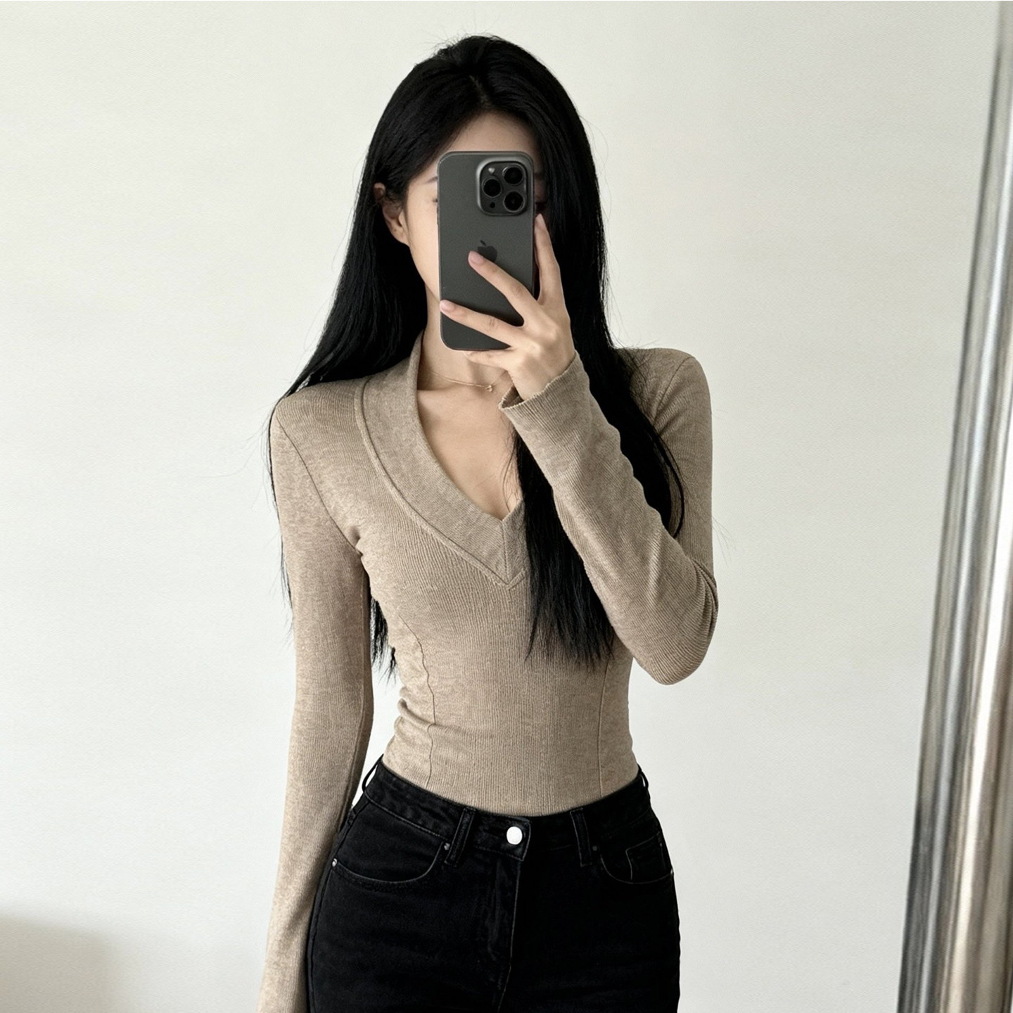 This Year's Trendy Hot-Selling Item: a High-End, Super Stylish V-Neck Base Layer Top for Women, Slim Fit, Flattering, with Regular Shoulders, for Autumn and Winter