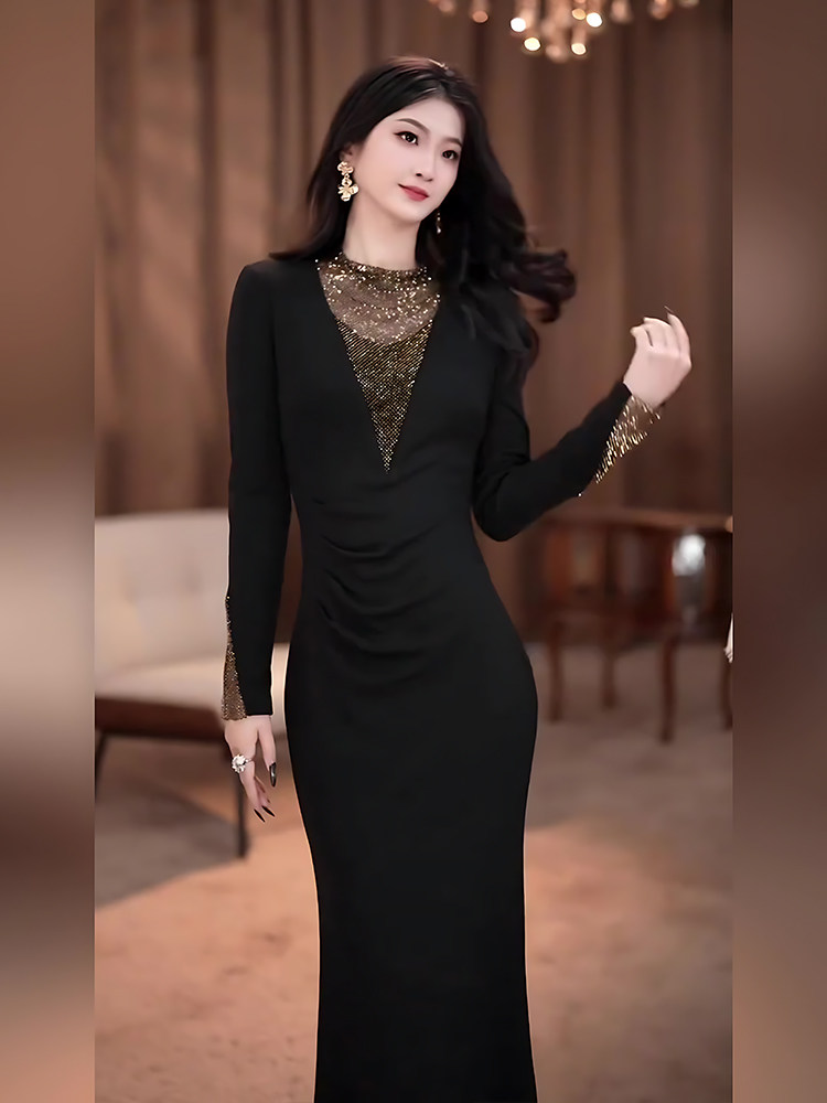 Mijie 2025 Winter Luxury Black Dress for Women, Long-Sleeved, Waist-Cinching, Stylish, Elegant, Goddess-Like, Fashionable Long Dress