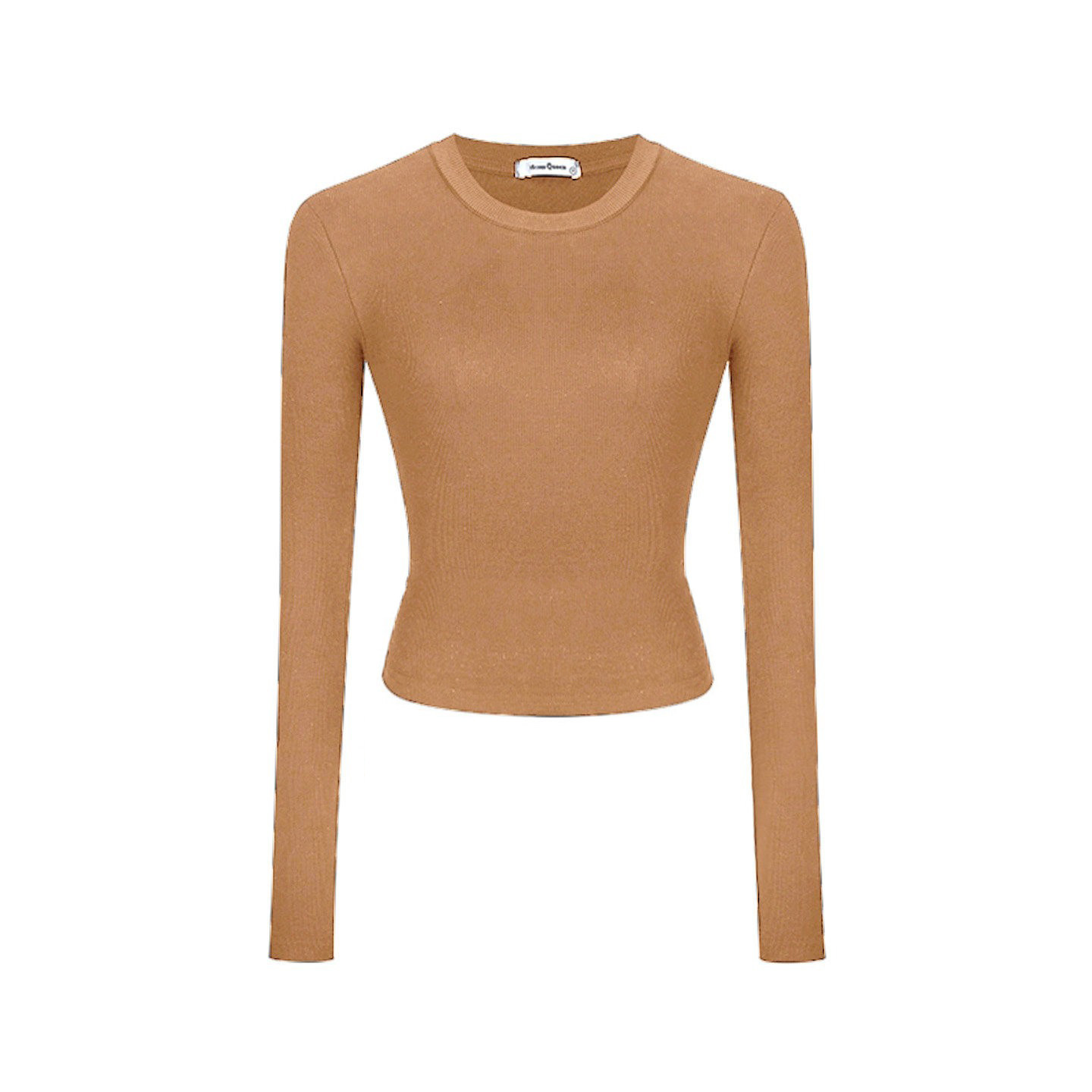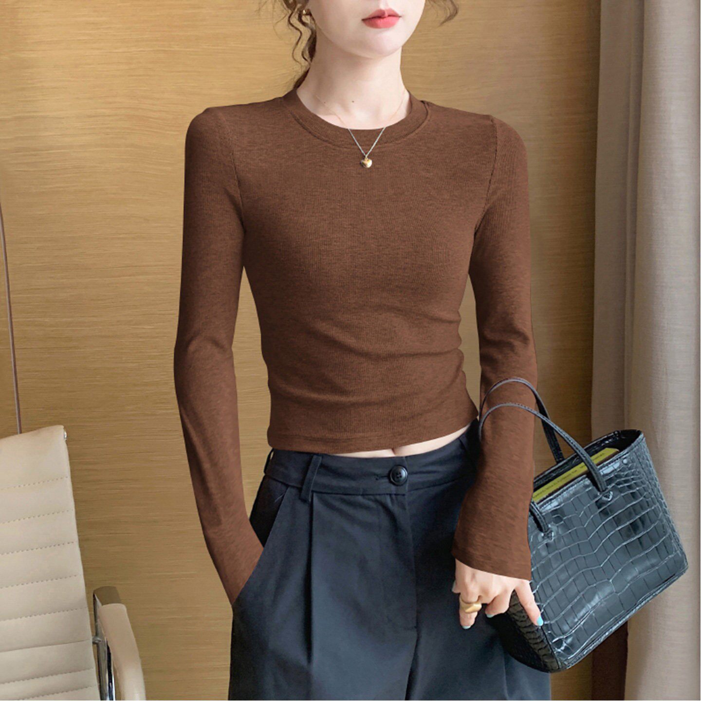Melard Coffee-Colored Round-Neck Petite Base Shirt for Women, Autumn and Winter Inner Wear, Slim Fit, Tight-Fitting, Slimming Short T-Shirt Top