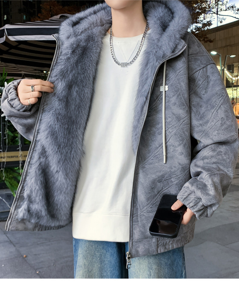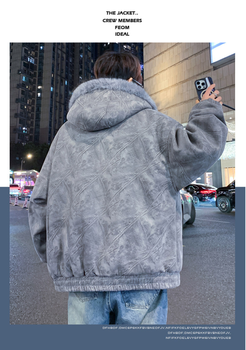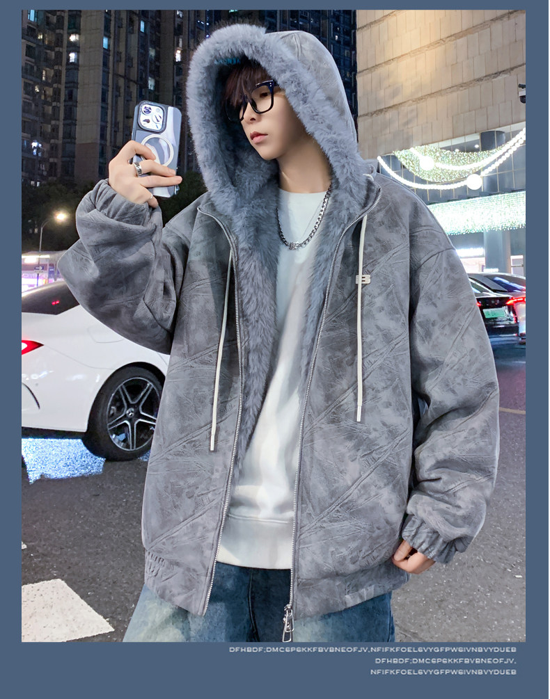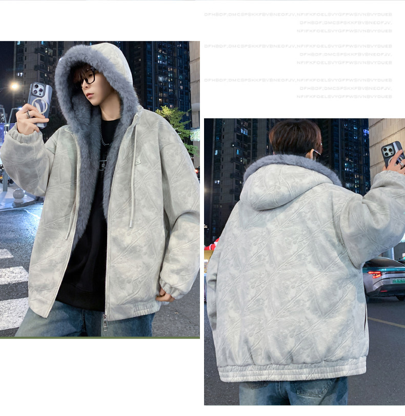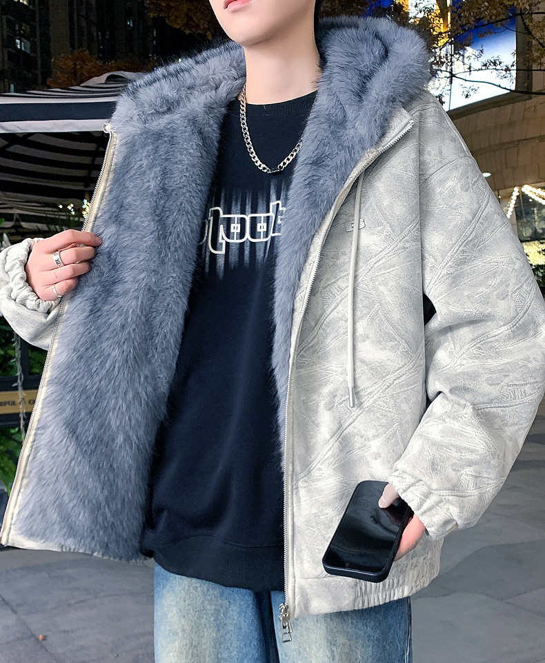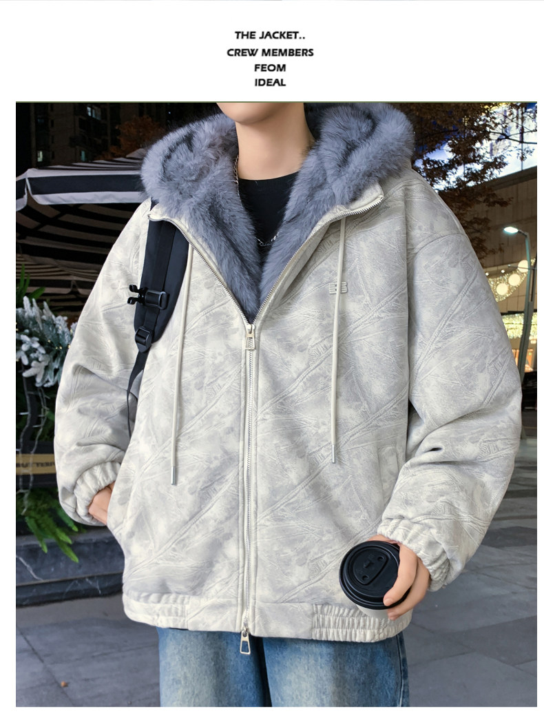 Deerskin fur collar hooded jacket men's winter velvet thickened loose jacket teenagers cold-proof warm jacket