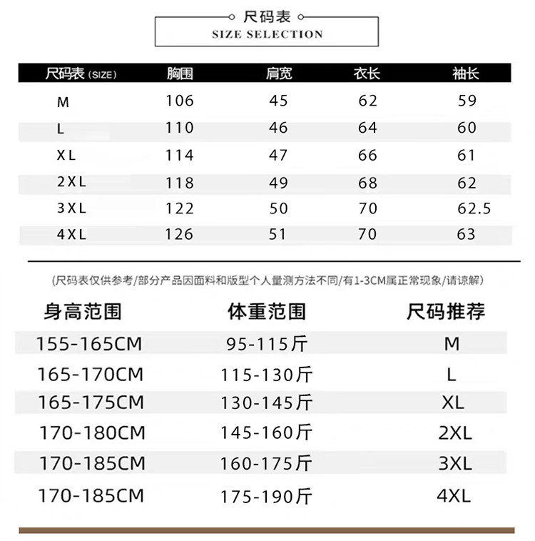 China (cm) 165 / 88-90 170 / 96-98 175 / 108-110 180 / 118-122 185 / 126-130