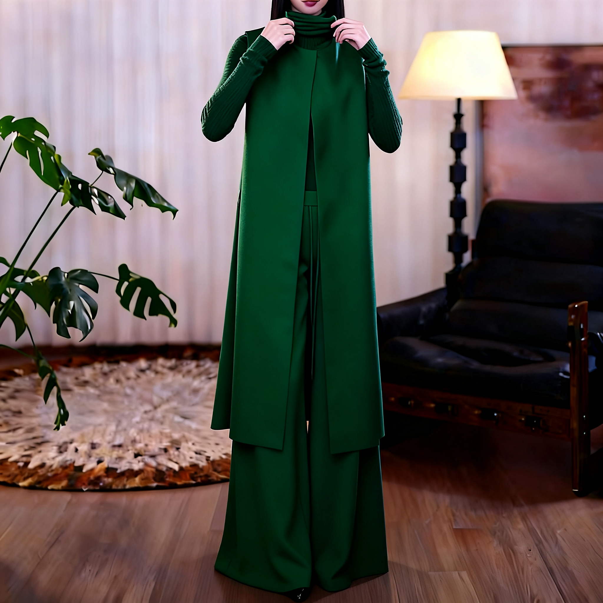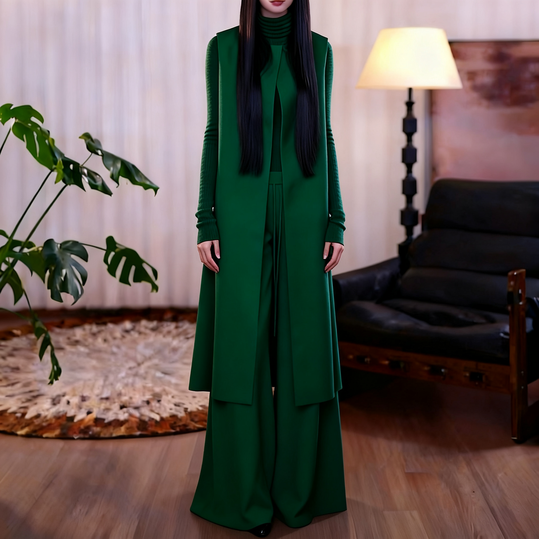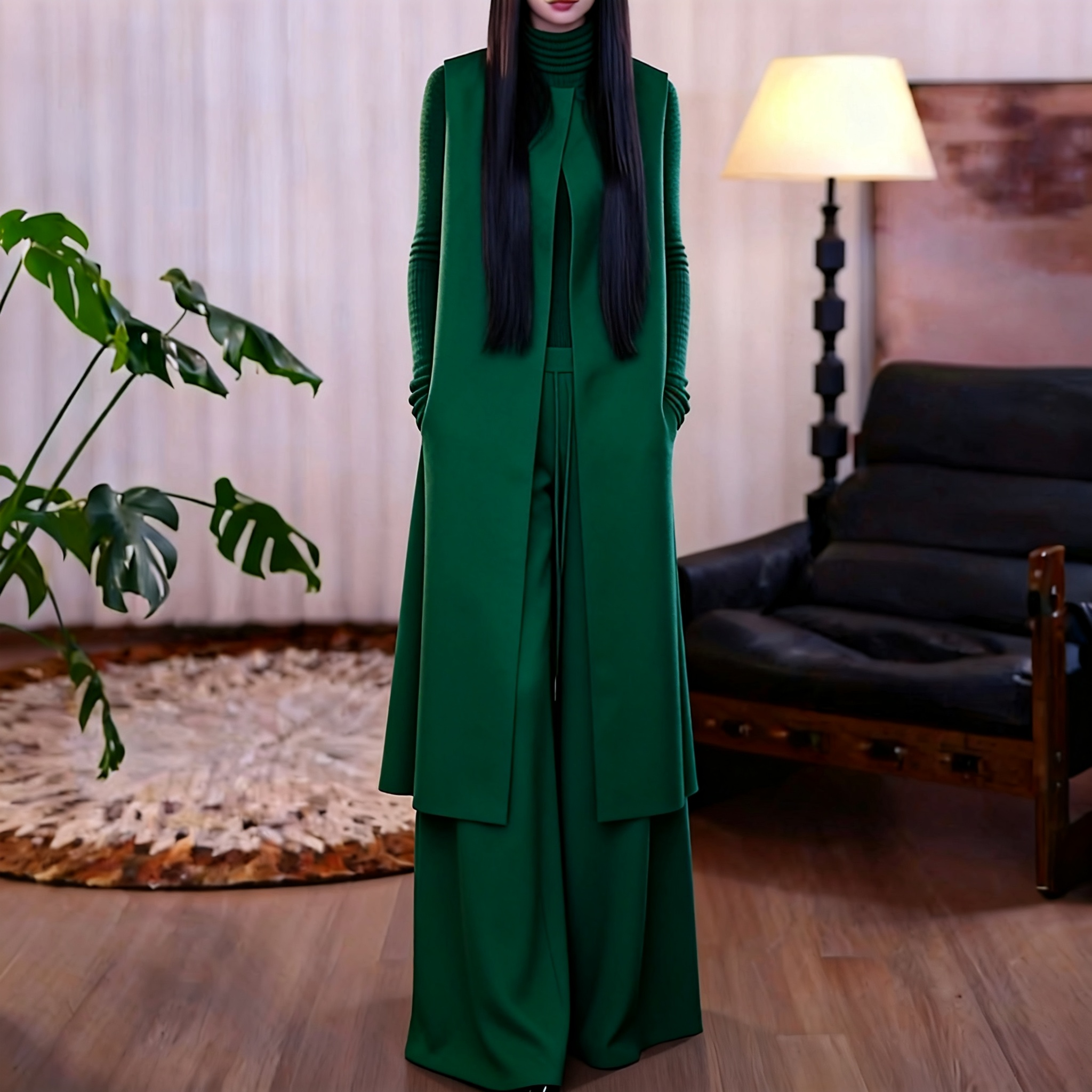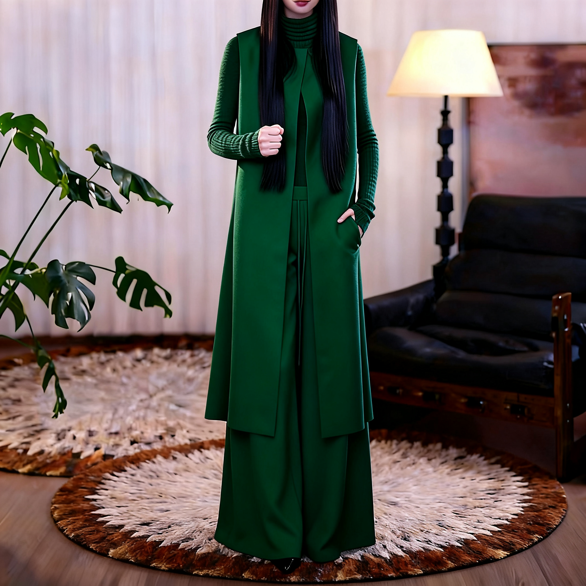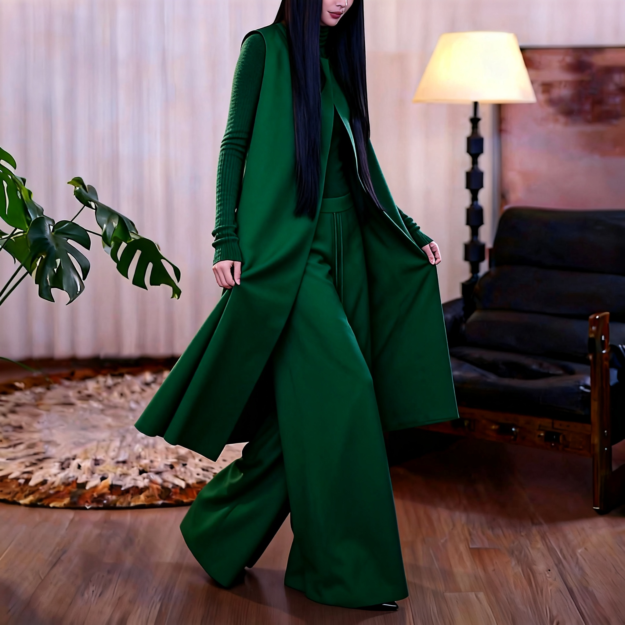 Mijie's new high-end simple style green vest wide-leg pants suit for women autumn and winter temperament old money style two-piece set