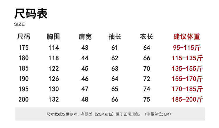 China (cm) 165 / 88-90 170 / 96-98 175 / 108-110 180 / 118-122 185 / 126-130