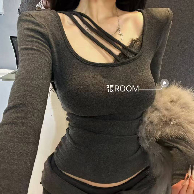 Hot Girl Sexy and Chic Beautiful T-Shirt for Women 2026 Spring New Style Irregular Design U-Neck Lace Exposed Collarbone Top