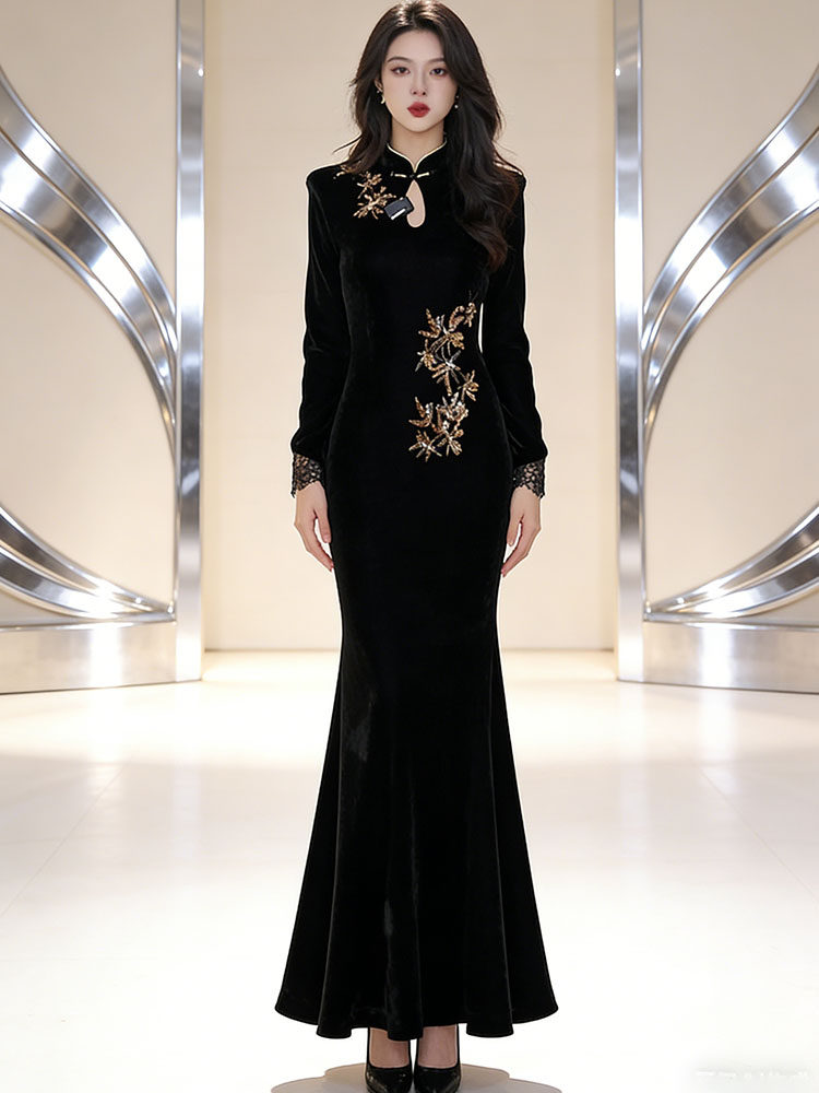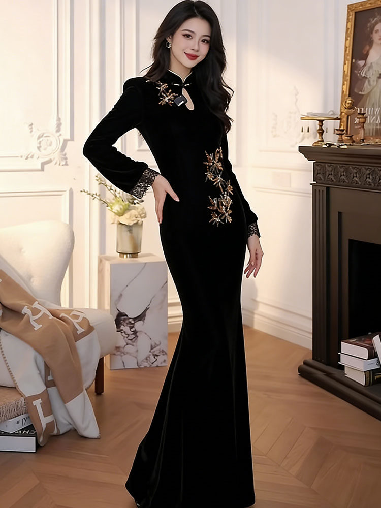 Mijinge's Gentle New Chinese-Style Black Embroidered Dress for Women, Long-Sleeved, Stand-Up Collar, Light Luxury, Elegant, High-End, and Sophisticated Dress