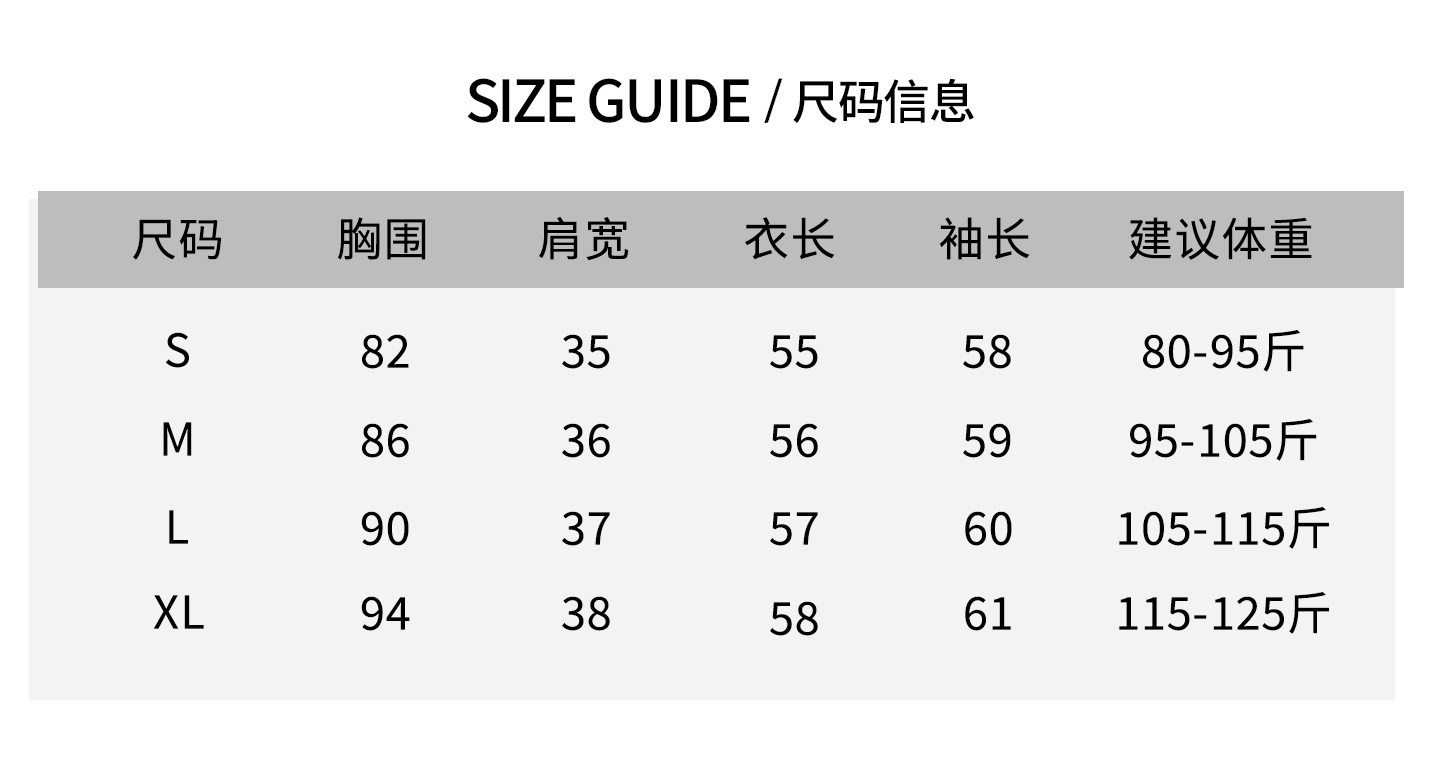 China (cm) 165 / 88-90 170 / 96-98 175 / 108-110 180 / 118-122 185 / 126-130