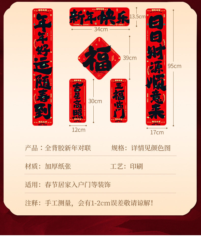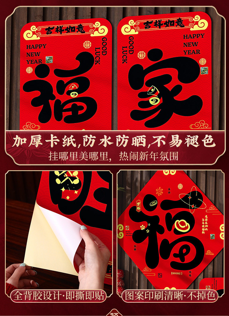 Color Classification 1.1#[Every Year-Every Day]+Pair of Stickers-Full Adhesive Backing,1.1#【New Year - Festive】+ Matching Stickers - Full Adhesive Backing,1.1#[Every Year-Every Day] + Stickers + Window Grilles - Full Adhesive Backing,1.1#【New Year - Festive Season】+ Couplets + Window Clings - Full Adhesive Backing,1.1#[Every Year-Every Day]+Window Grille+Red Envelope-Full Adhesive,1.1 # 【New Year - Festive】+ Window Clings + Red Envelopes - Full Adhesive Backing