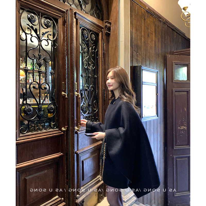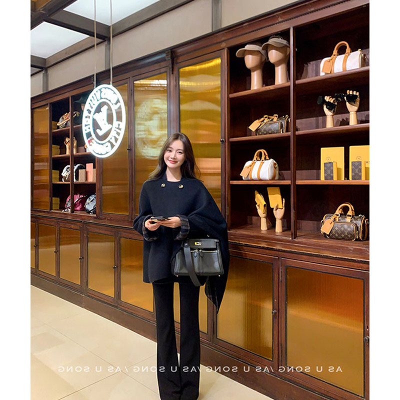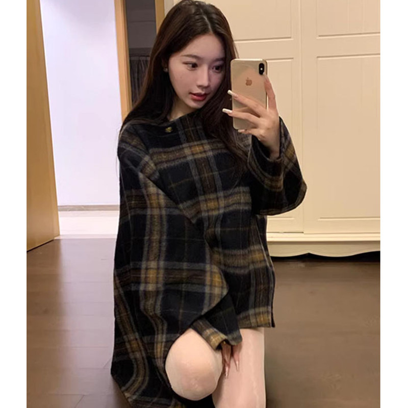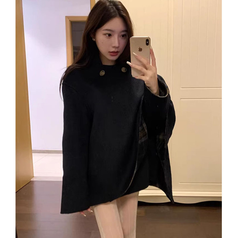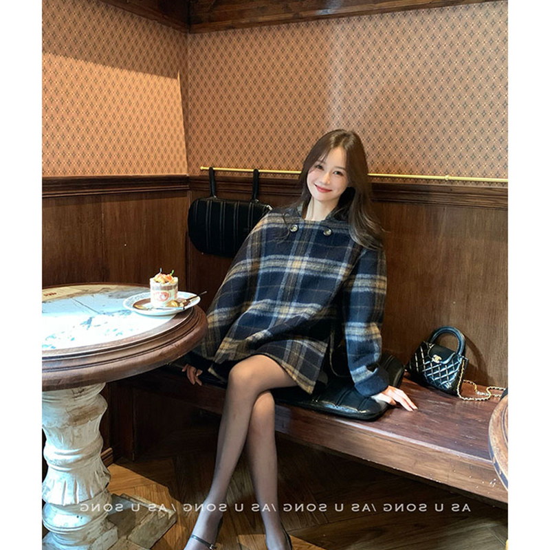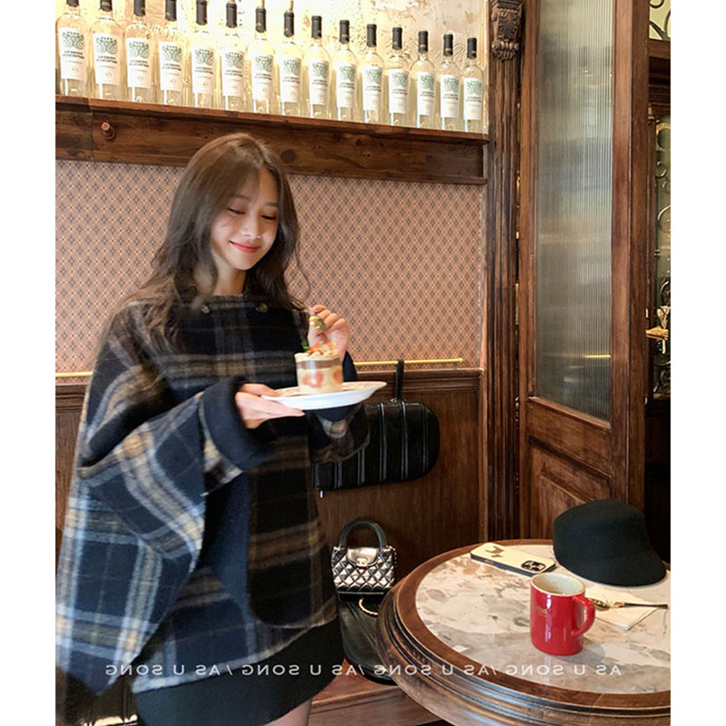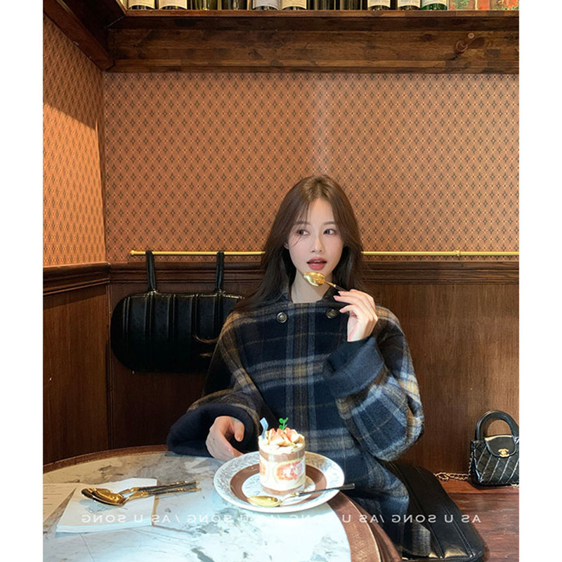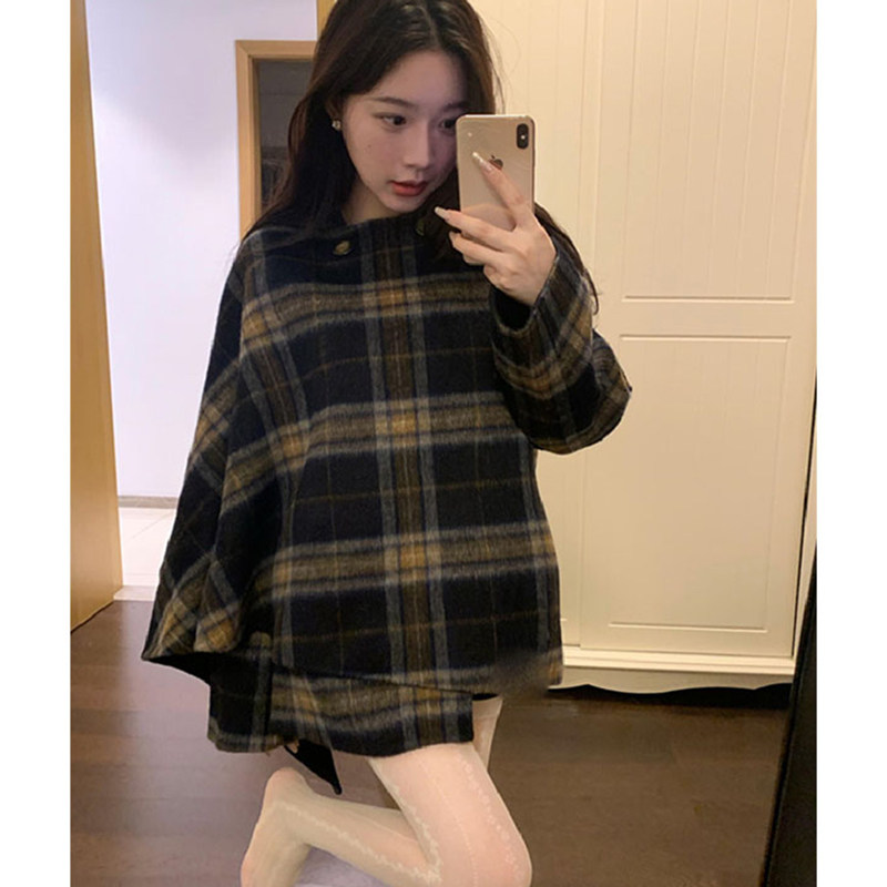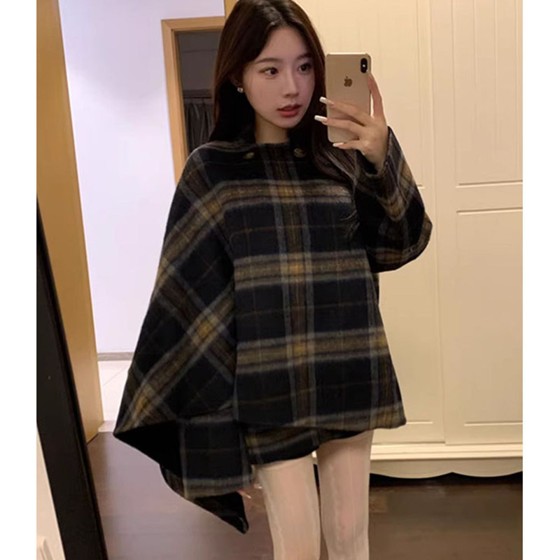Korean style lazy style asymmetrical plaid woolen long-sleeved coat, warm and commuting temperament, slim cloak jacket for women