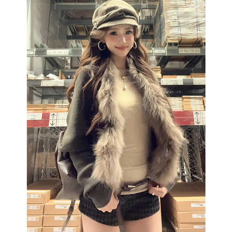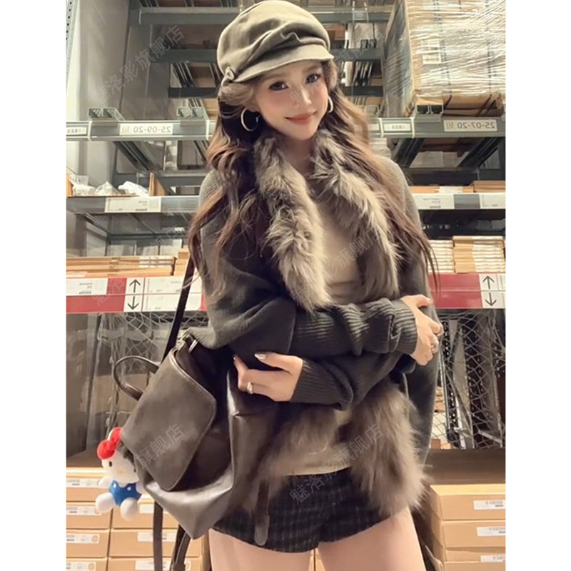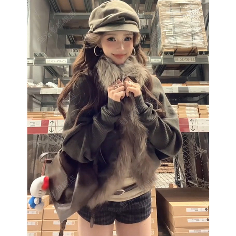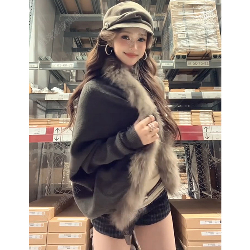 Big fur collar bat sleeves knitted cardigan women's autumn and winter lazy style loose cloak sweater jacket retro outer top