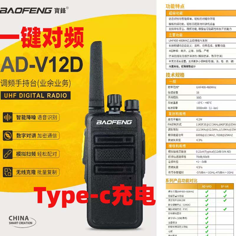 Baofeng V12D One-Touch Frequency Matching Walkie-Talkie USB Charging Civilian Compact Analog Handheld Radio for Construction Sites and Restaurants