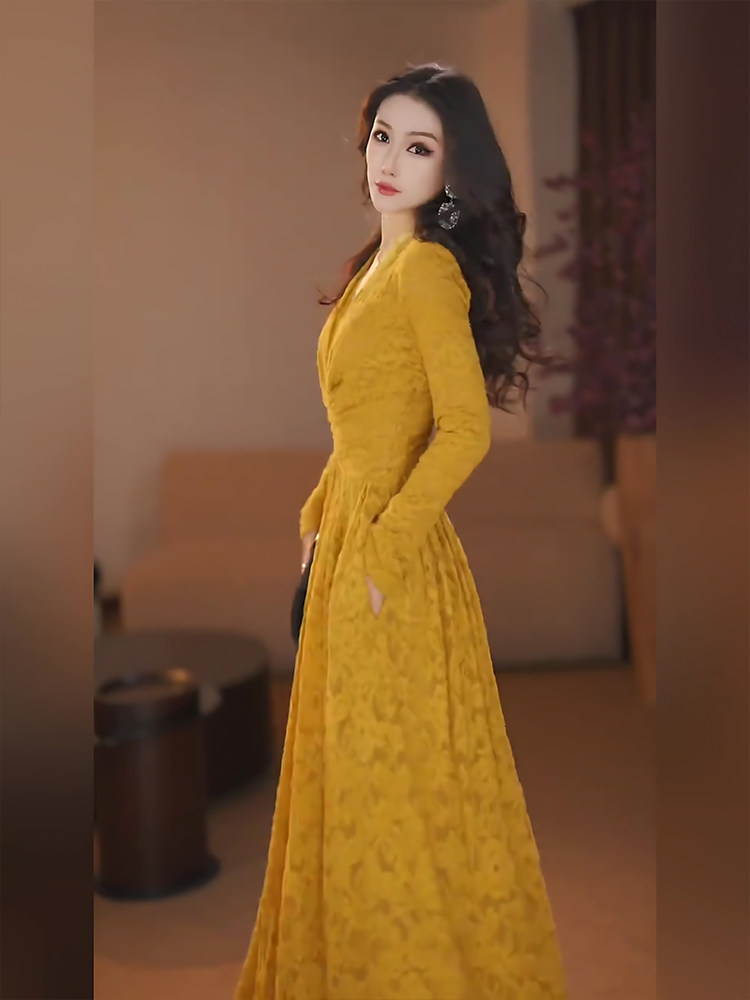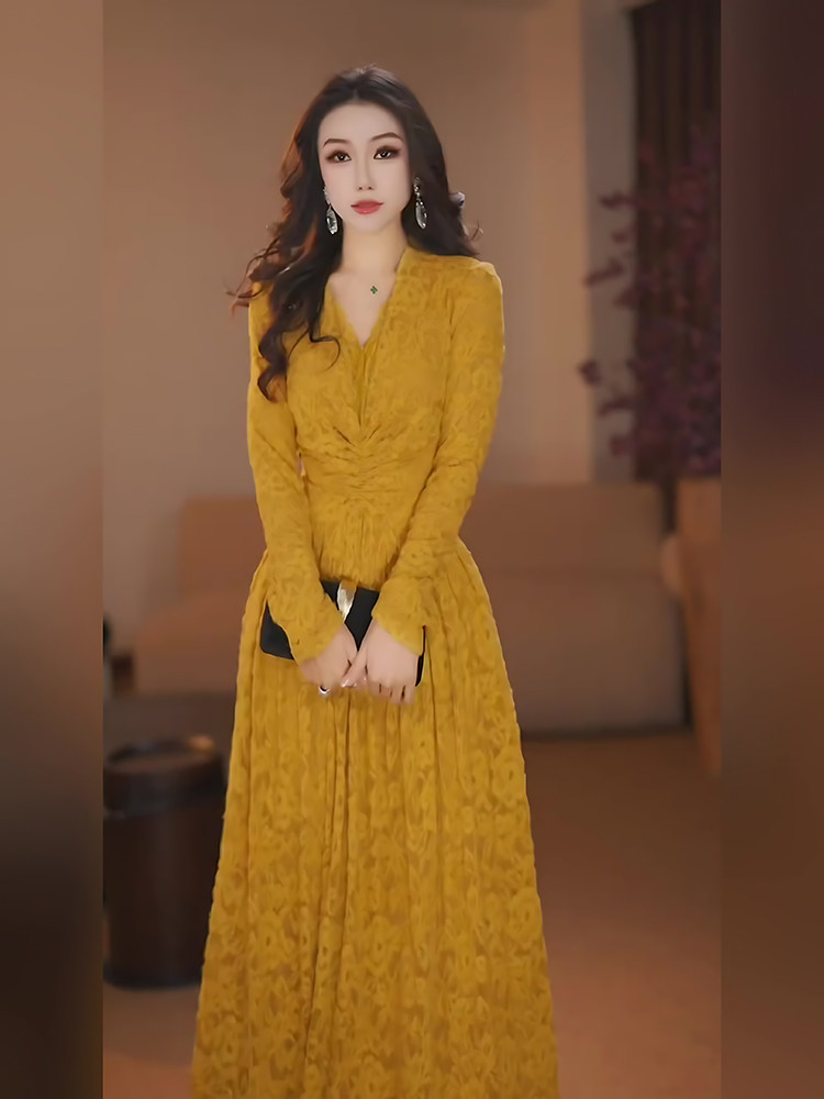 Mijie 2025 French-Style V-Neck Lace Dress for Women, Long-Sleeved, Waist-Cinching, Slimming, Elegant Long Dress with a Princess Vibe