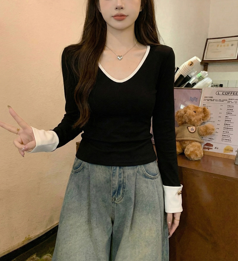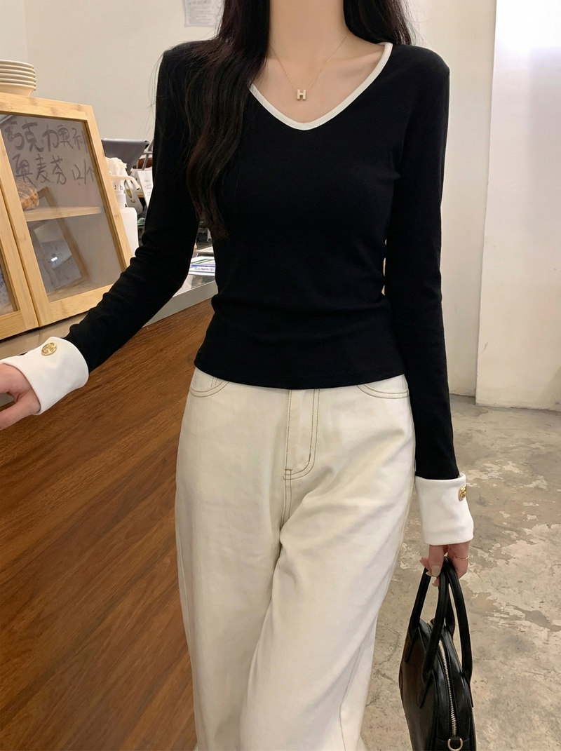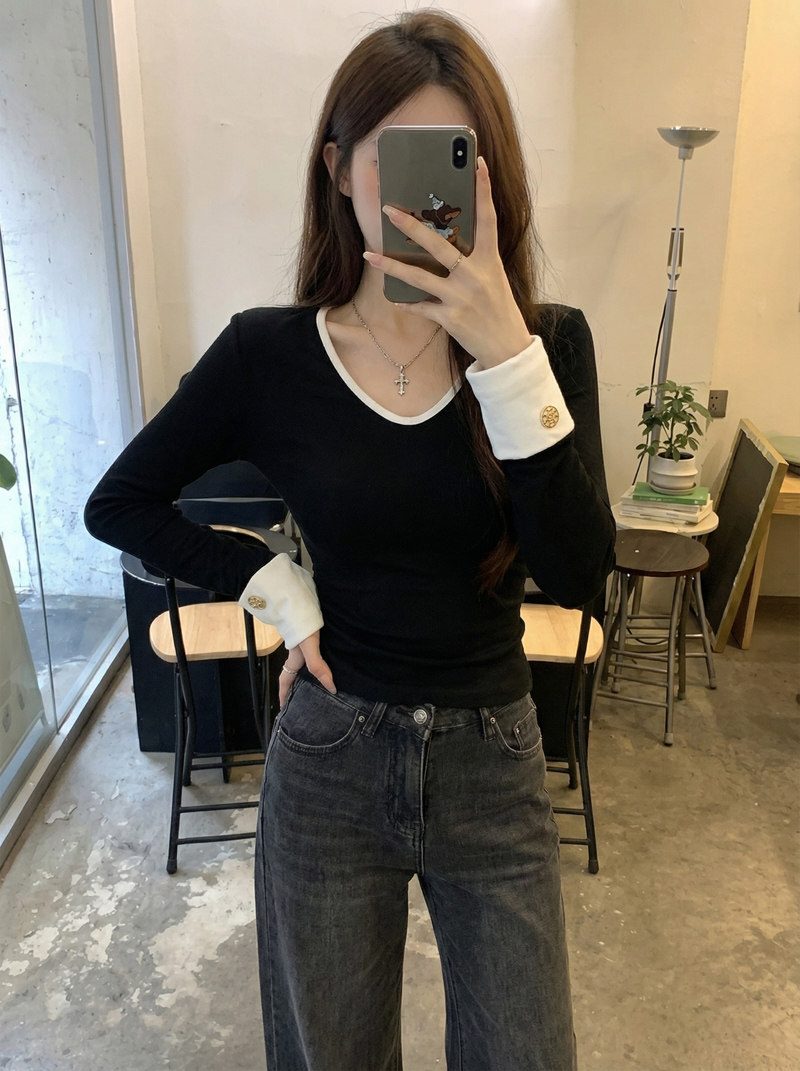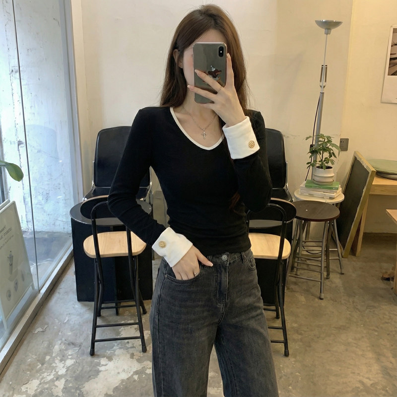 Fashionable and Versatile Color-Blocked V-Neck Base Shirt for Women, 2026 Spring Brushed Warm T-Shirt with a Stylish Button Design