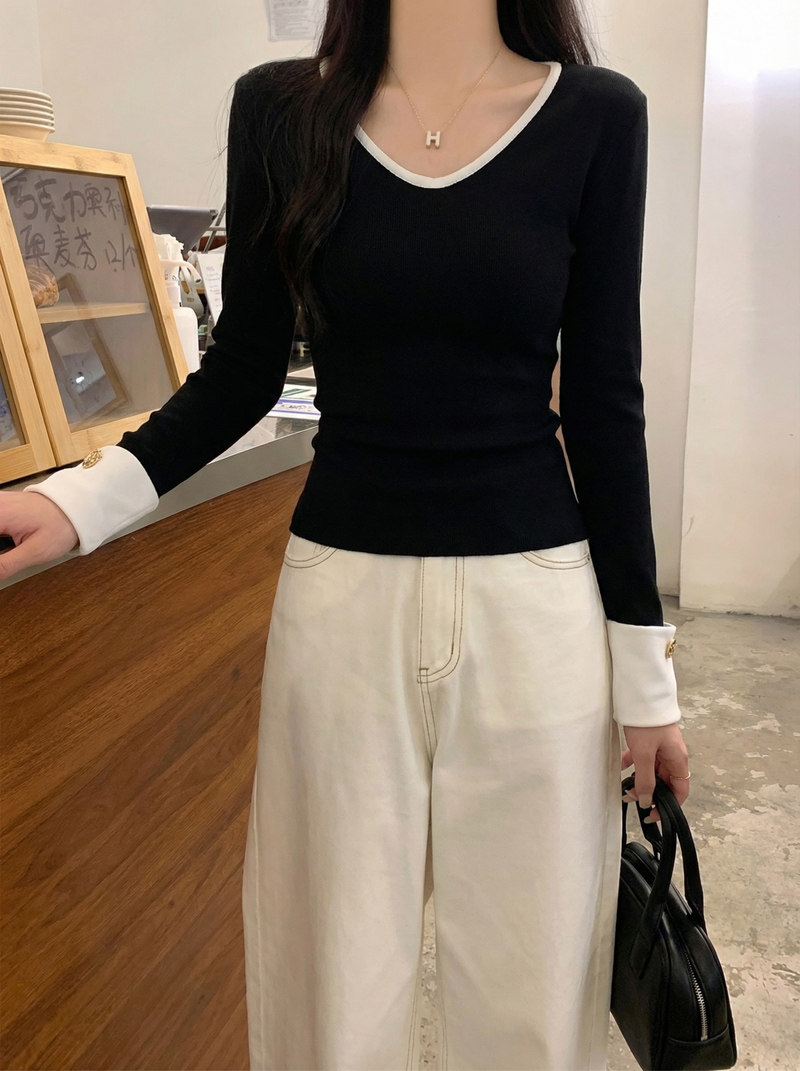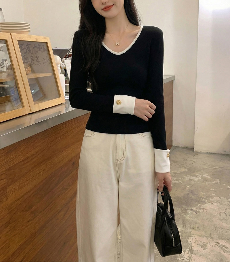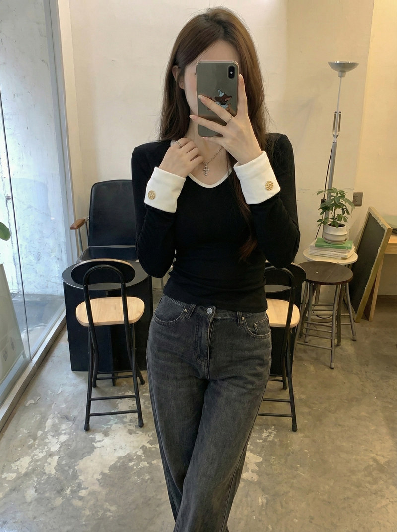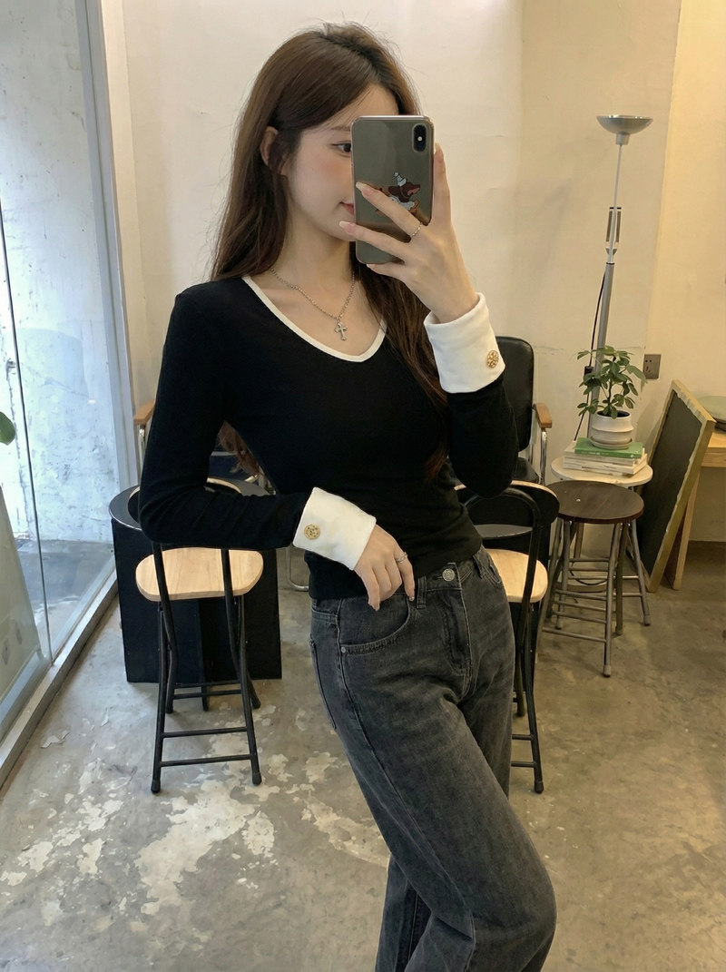 Fashionable and Versatile Color-Blocked V-Neck Base Shirt for Women, 2026 Spring Brushed Warm T-Shirt with a Stylish Button Design