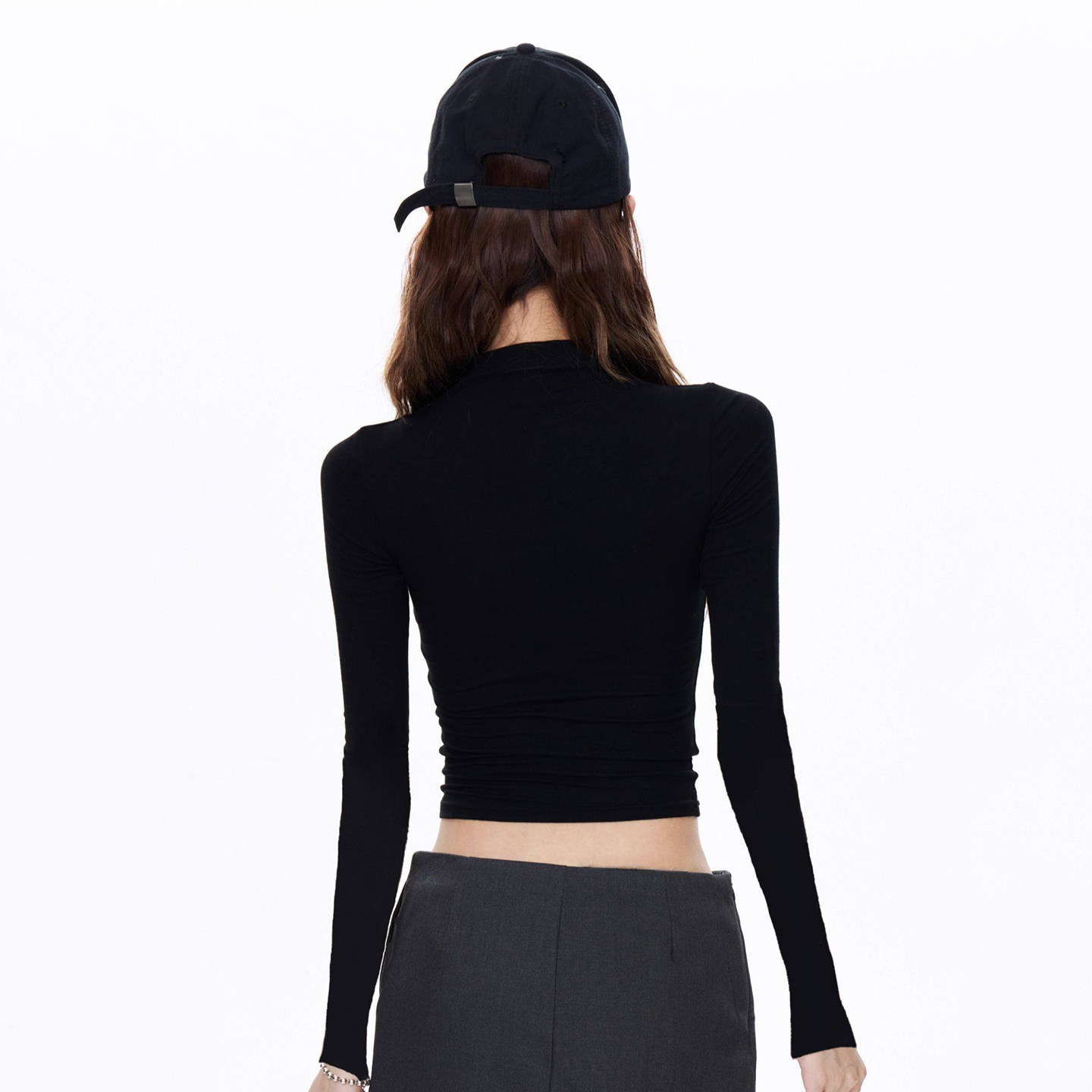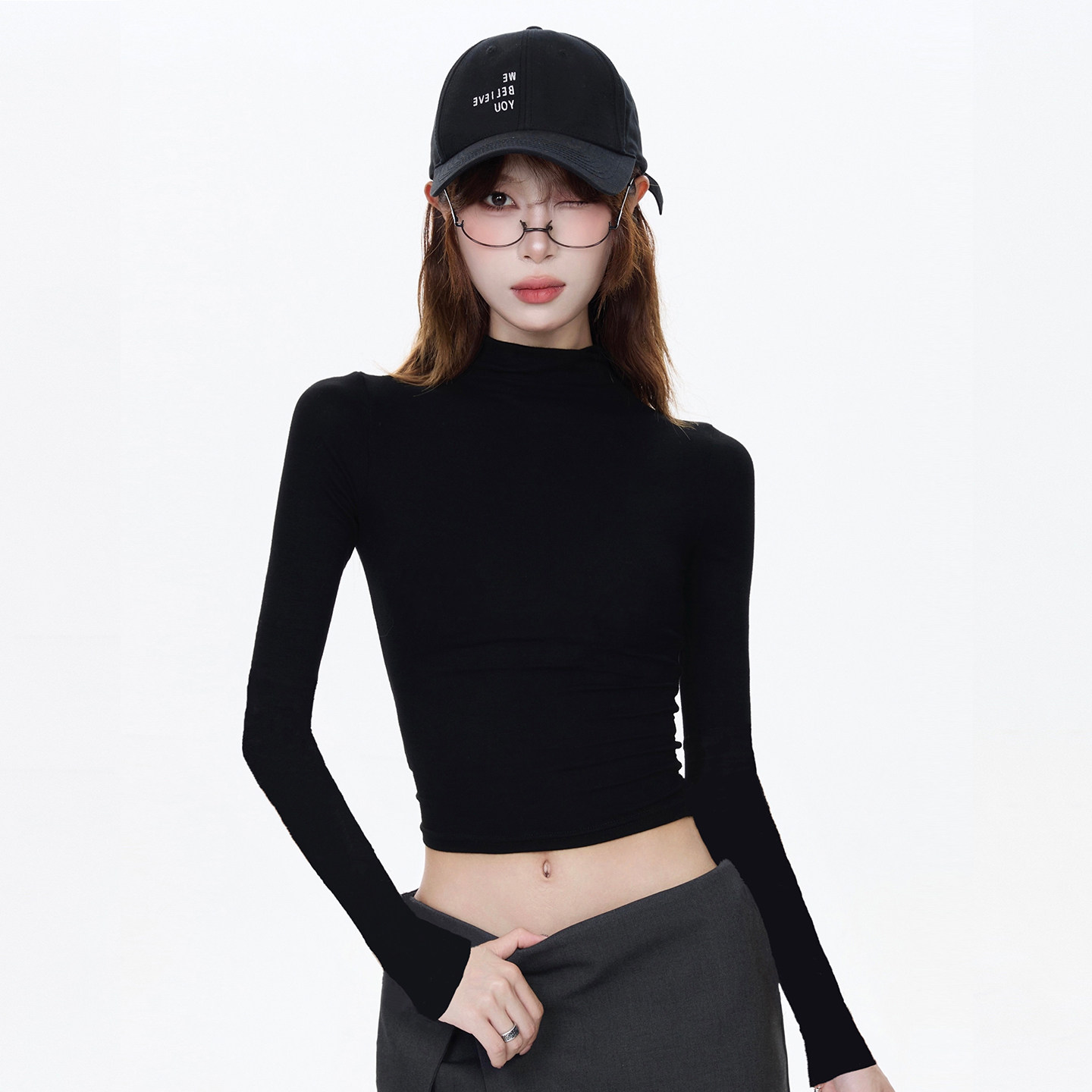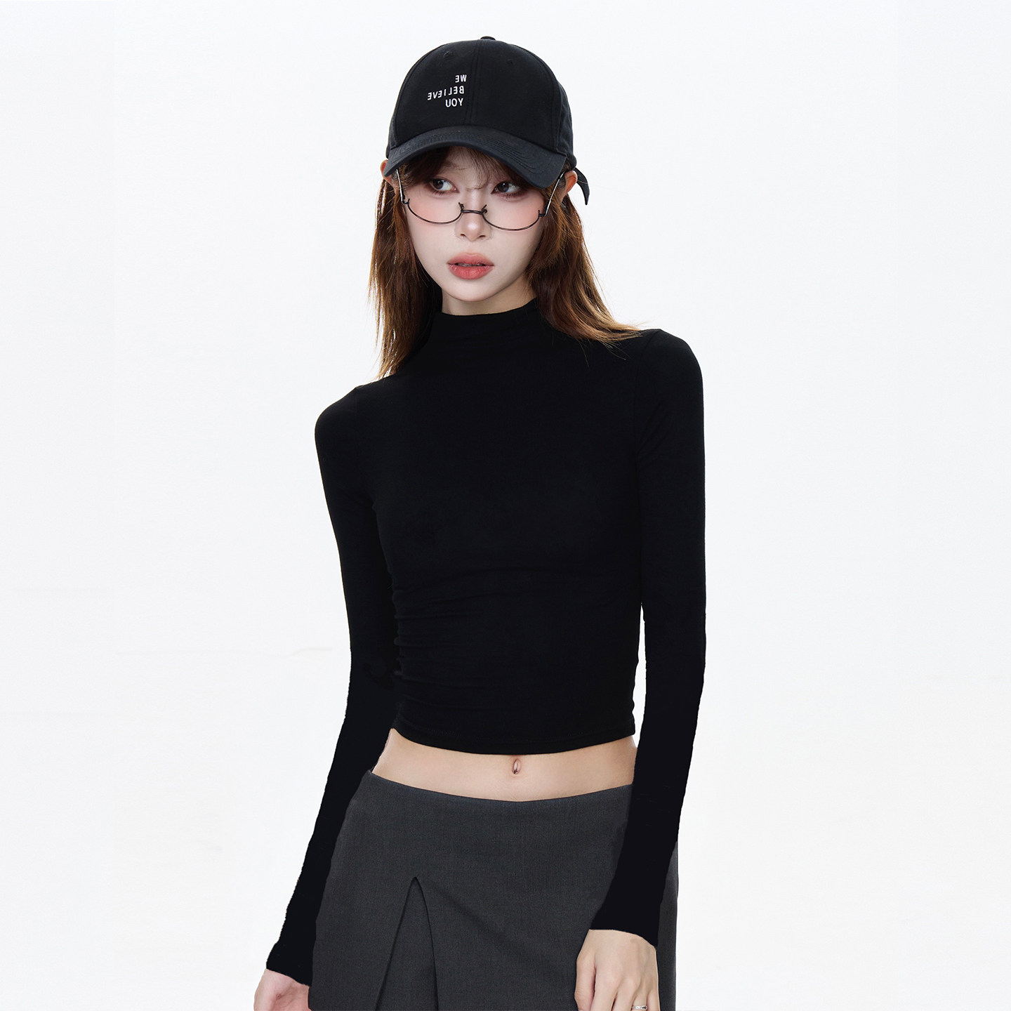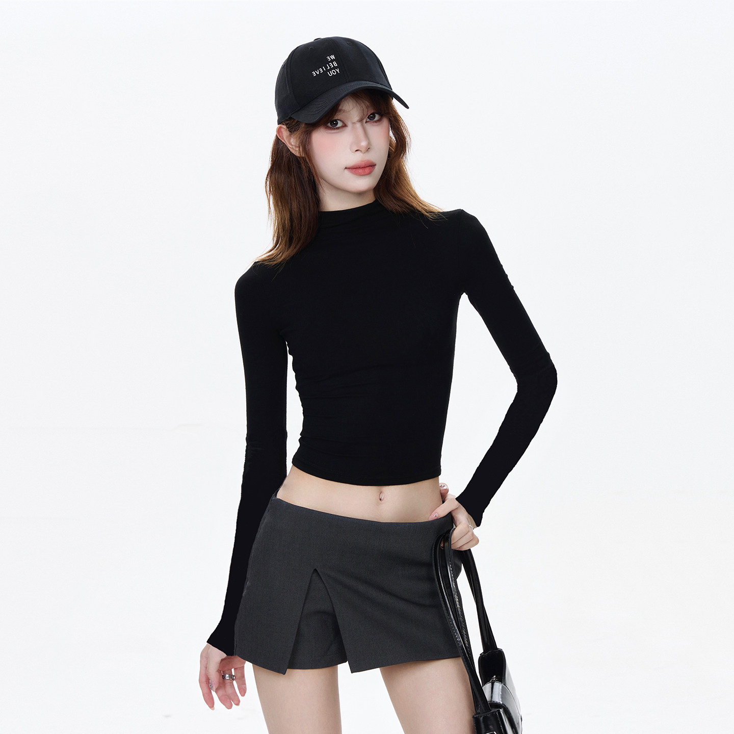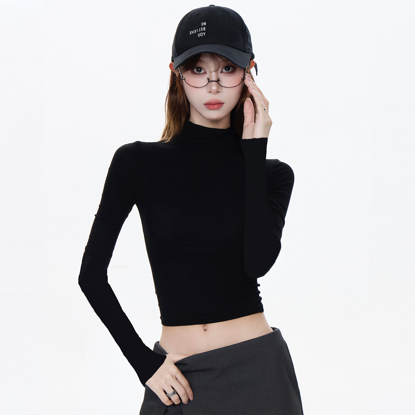 Tight-Fitting Long-Sleeve T-Shirt for Petite Women, Autumn and Winter American Style Slim-Fit Half-High Collar Base Layer Top